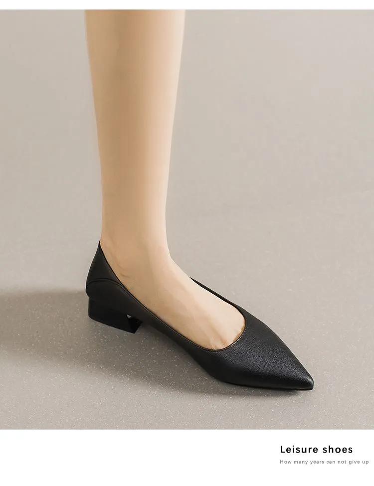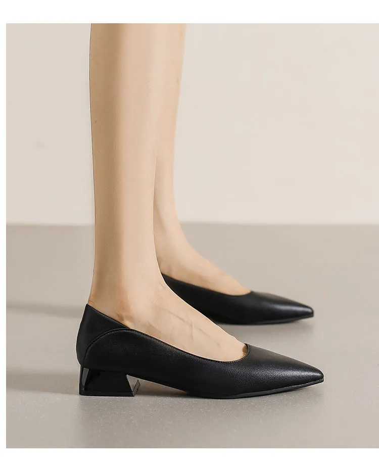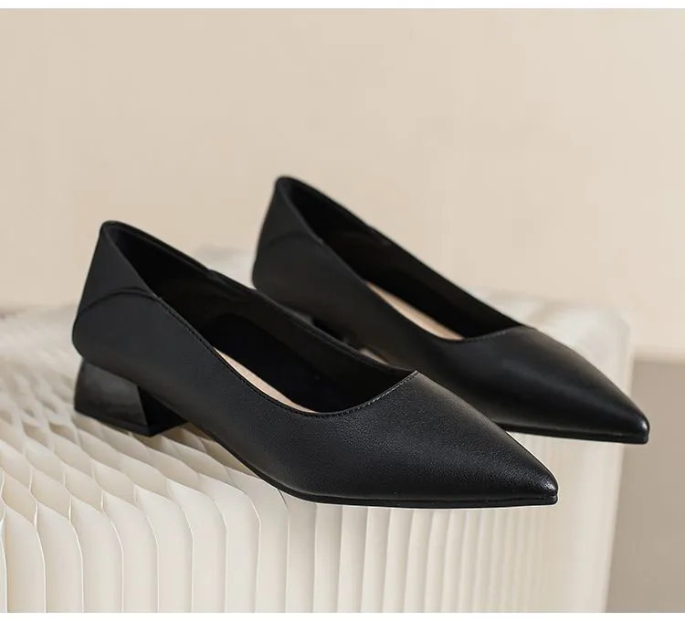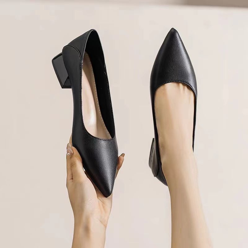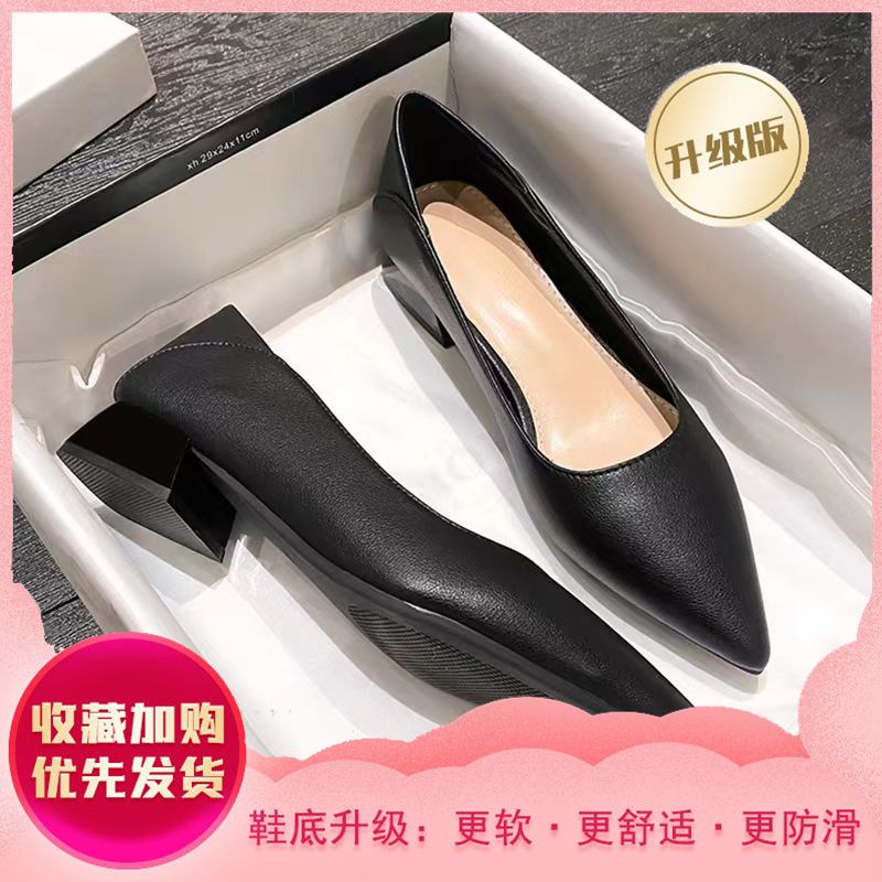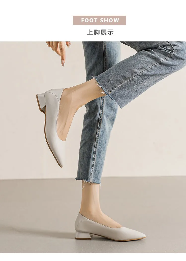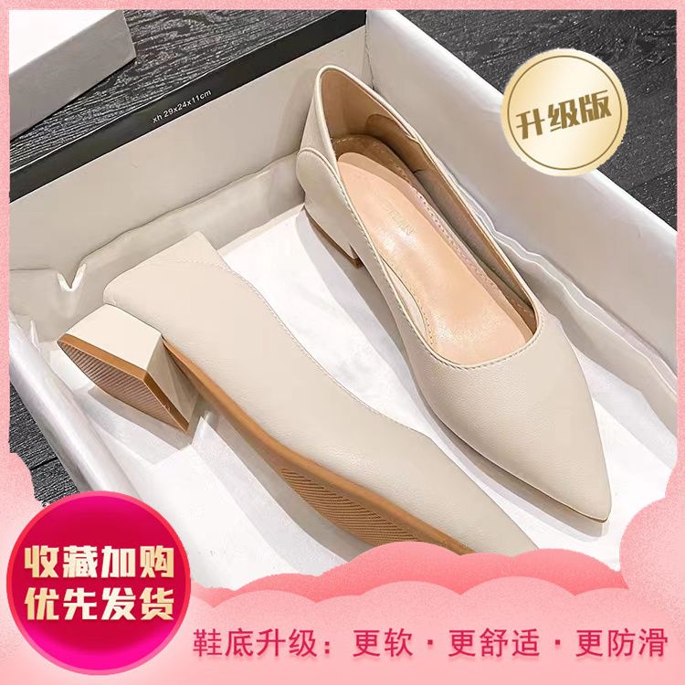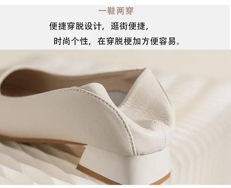 法式尖头浅口两穿单鞋女2023新款软皮粗跟上班不累脚一脚蹬工作鞋