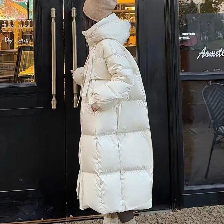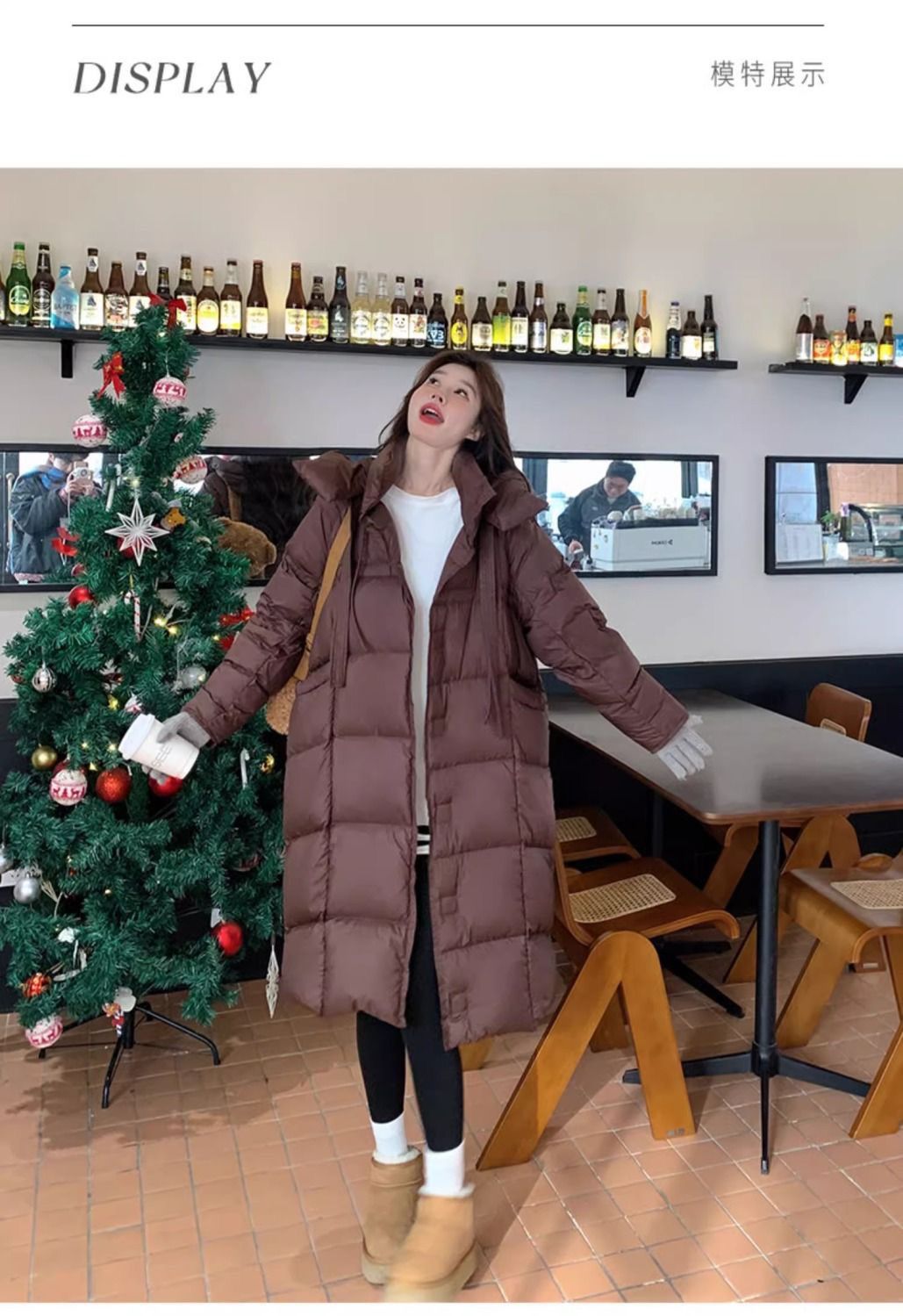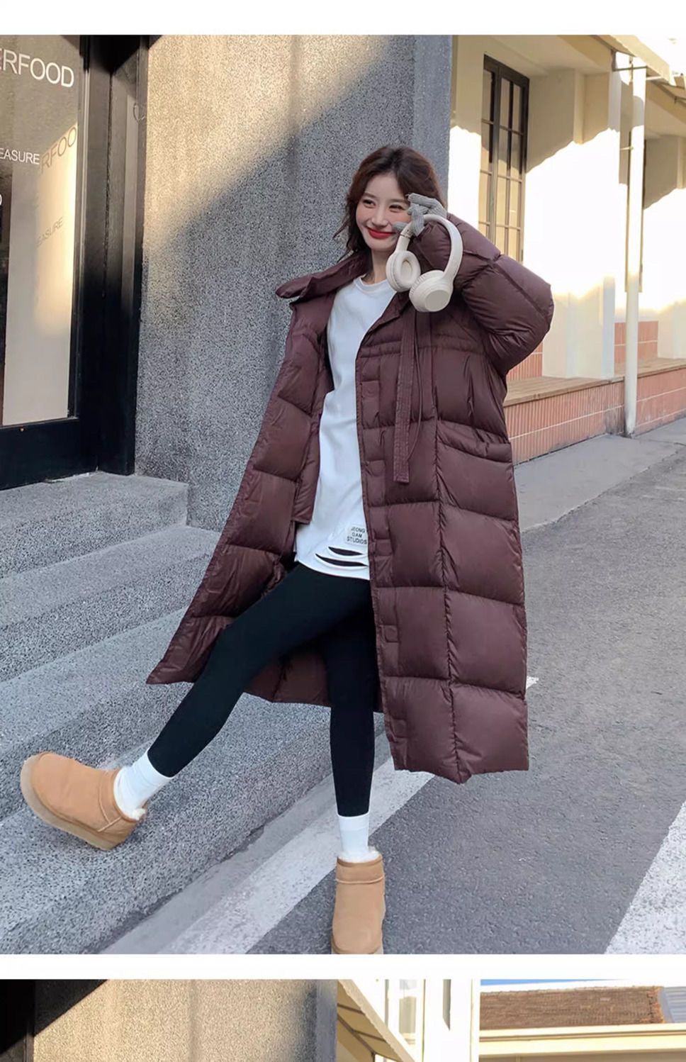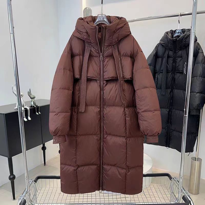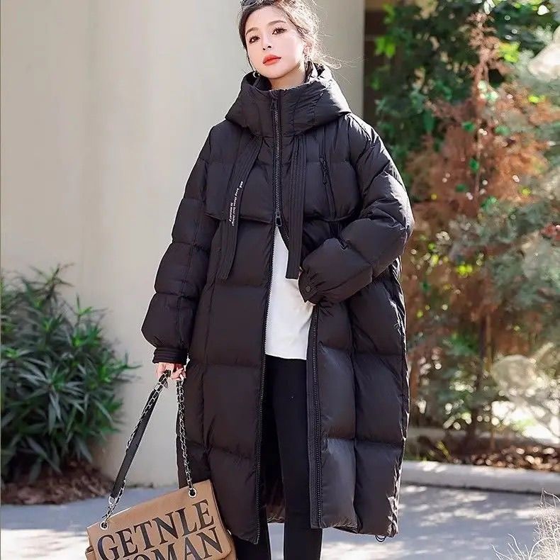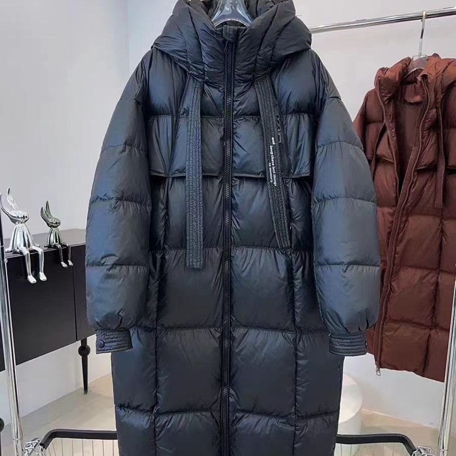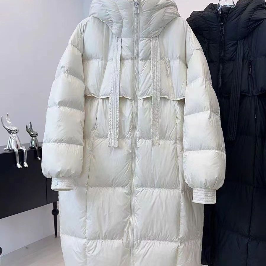 2024新款飘带羽绒服冬季加厚保暖连帽时尚简约过膝白鸭绒长款外套