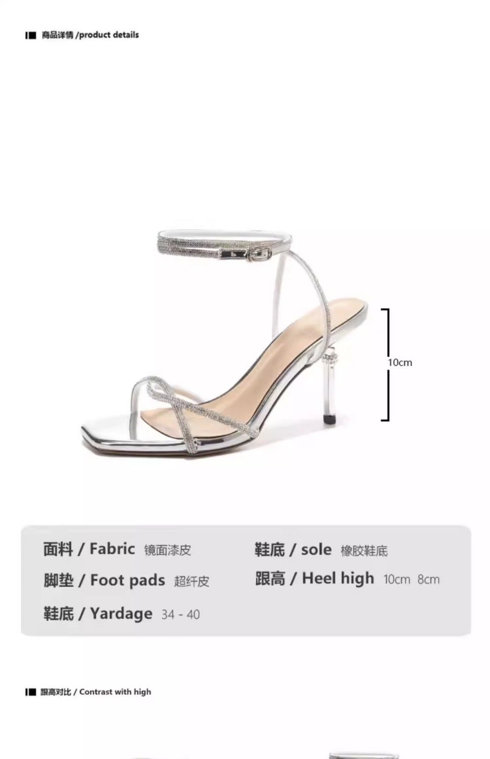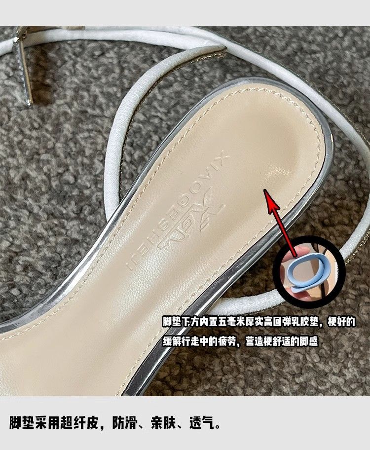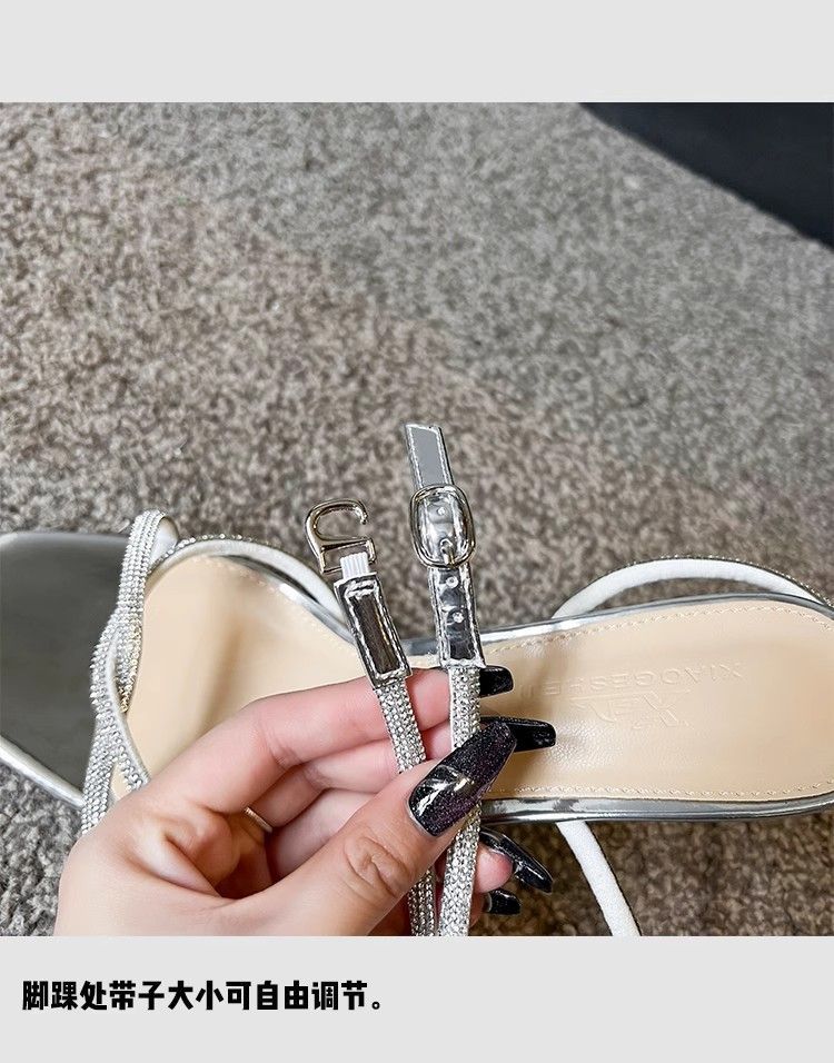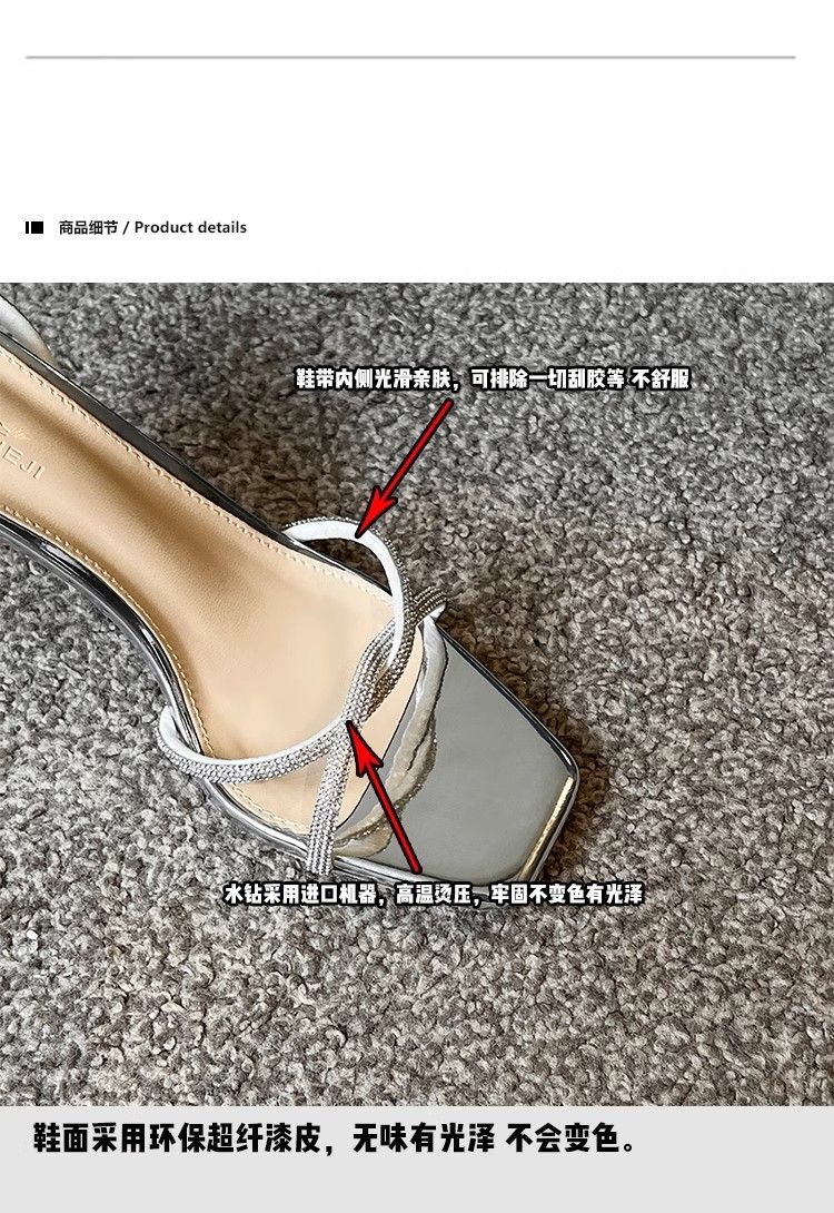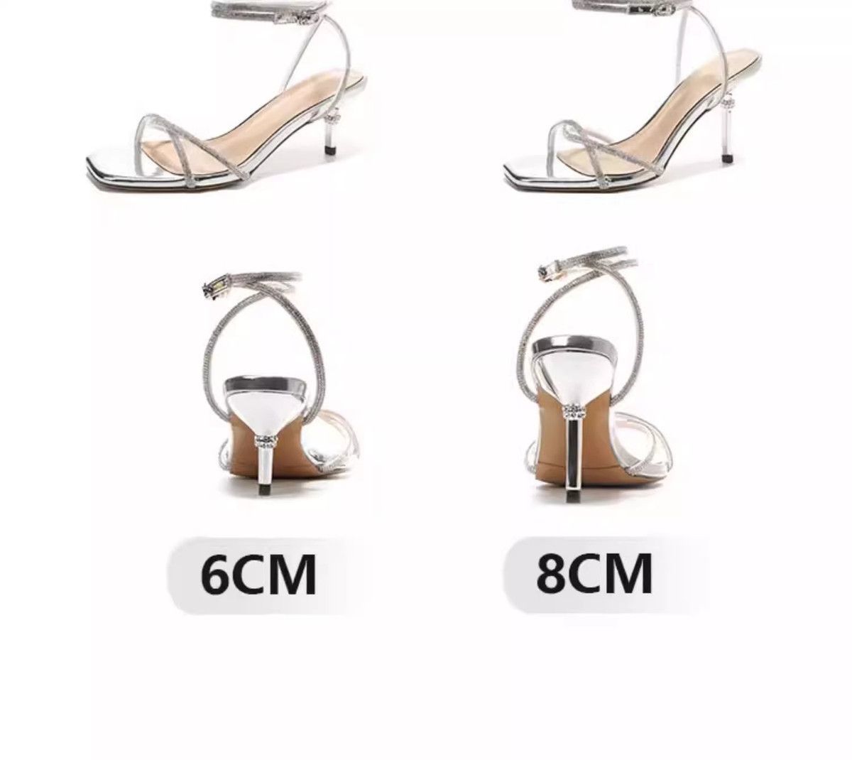 显腿长,腿白!性感方头水钻高跟鞋女细跟银色露趾一字带扣式凉鞋