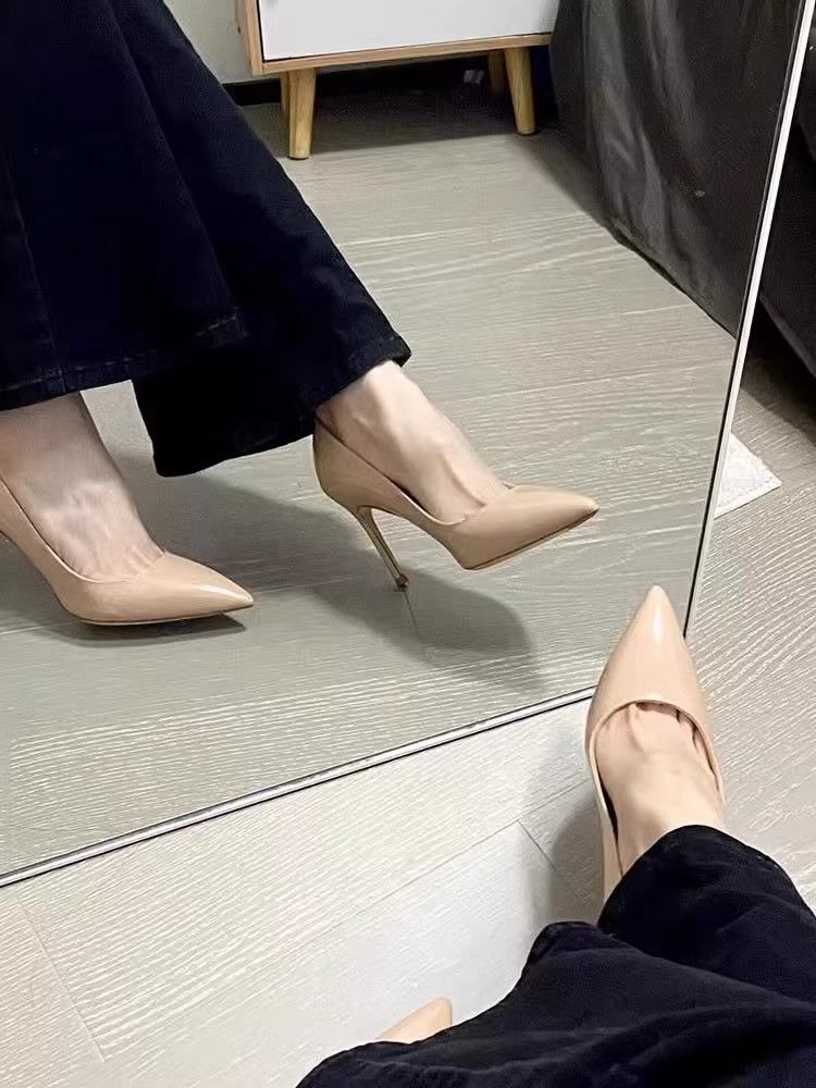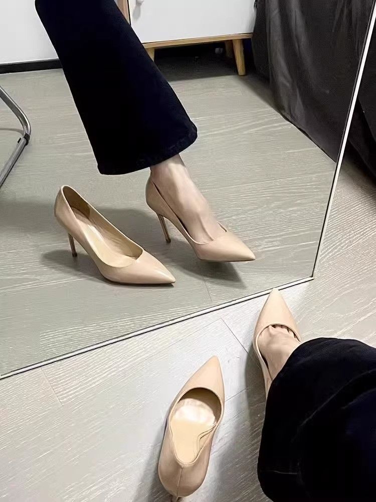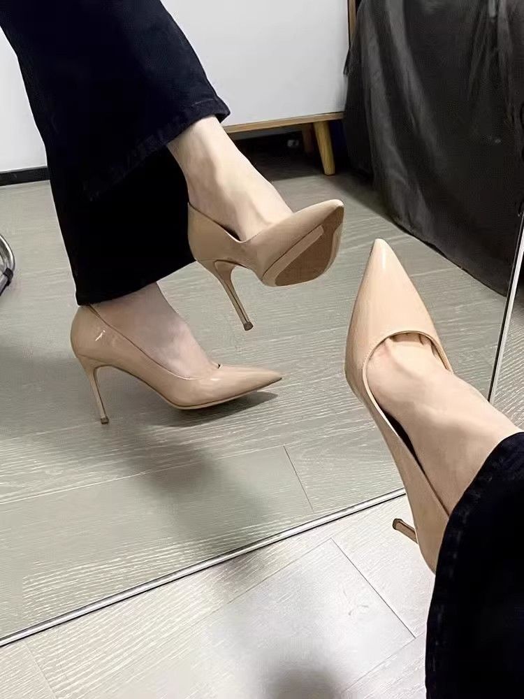 【首单直降】小香风裸色红底高跟鞋女性感ol侧空单鞋尖头浅口凉鞋