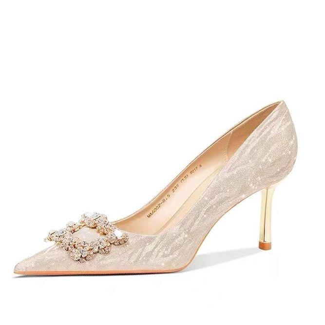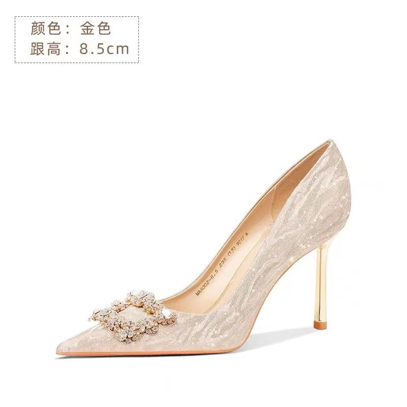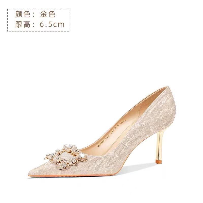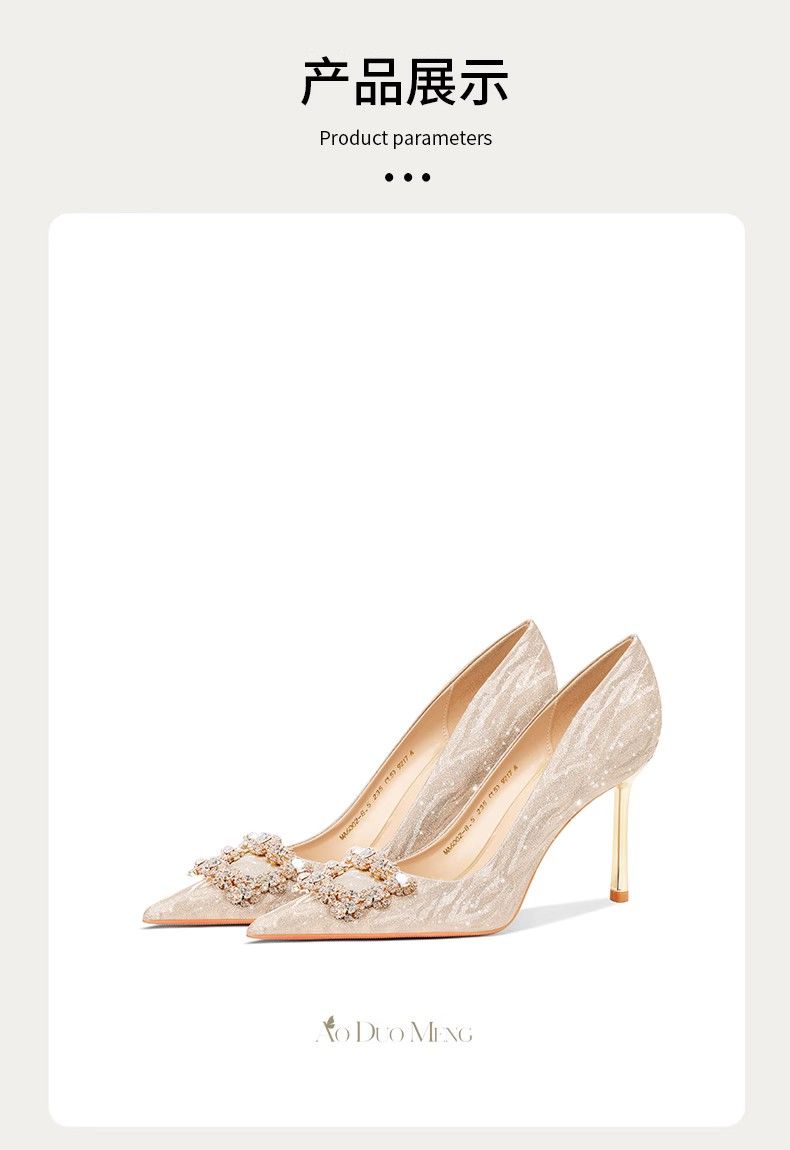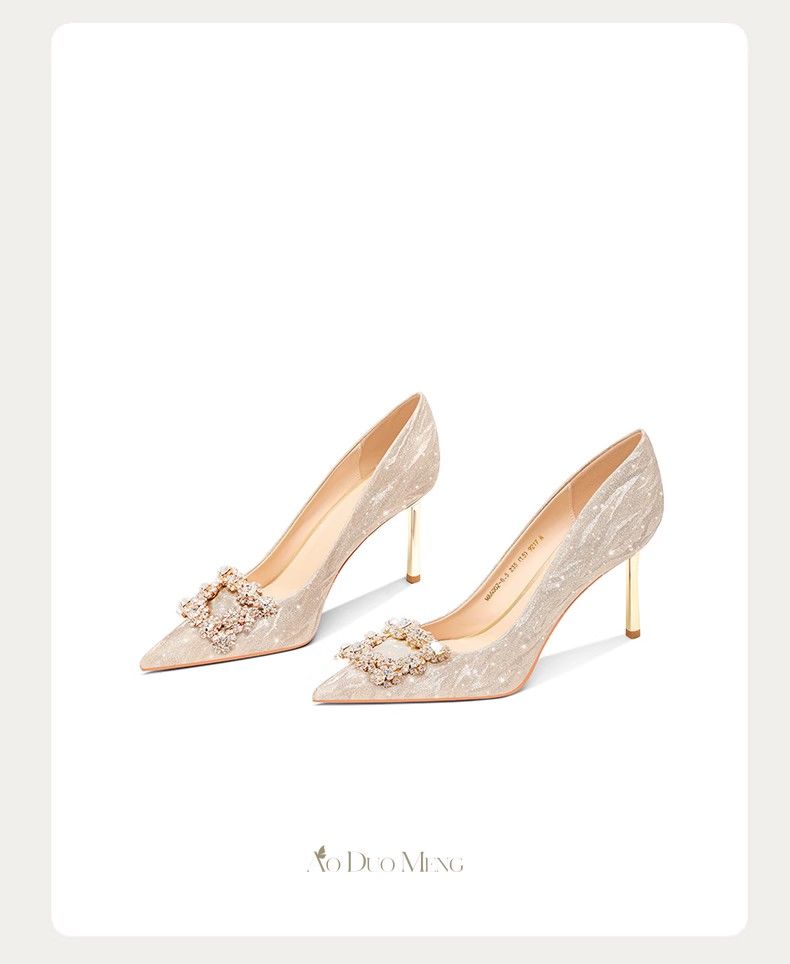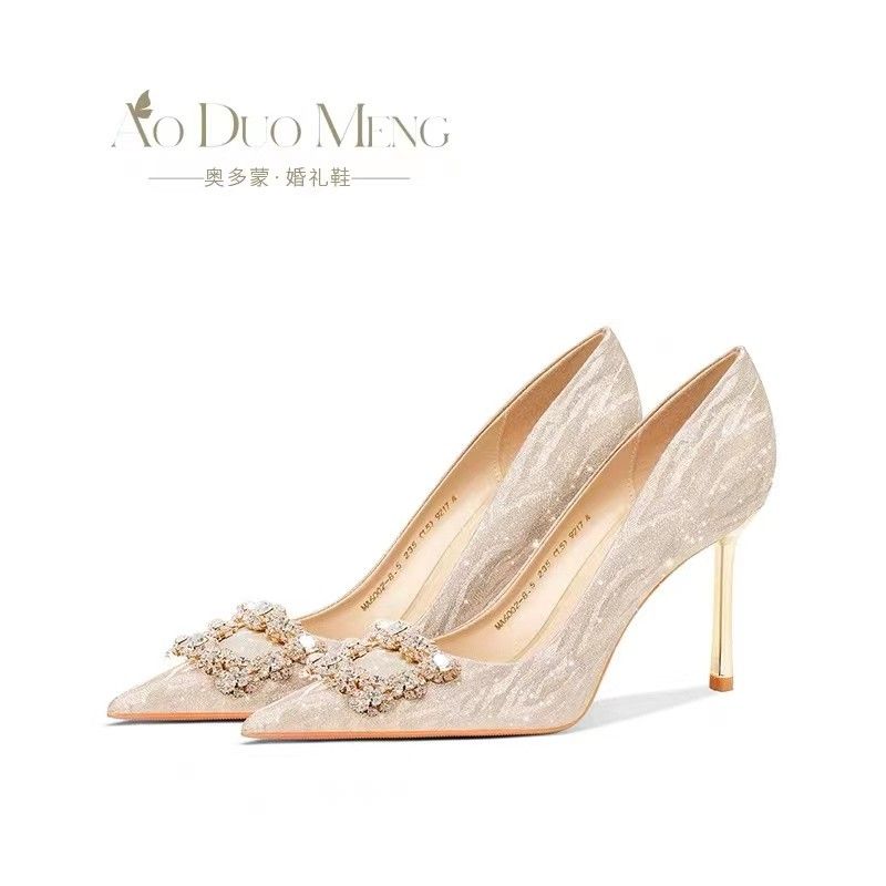 婚鞋新娘鞋女2023新款法式不累脚高级感订婚鞋金色水晶婚纱高跟鞋