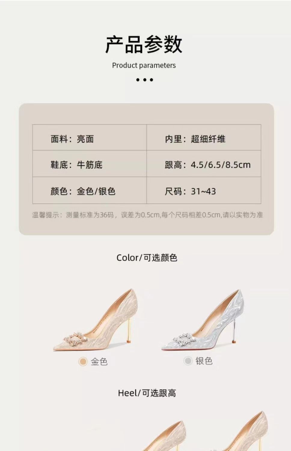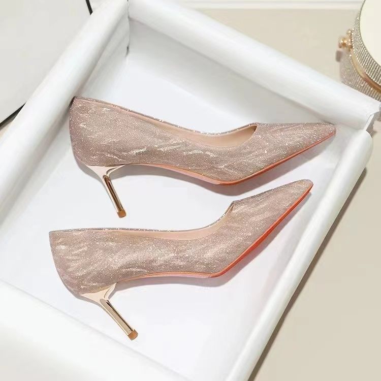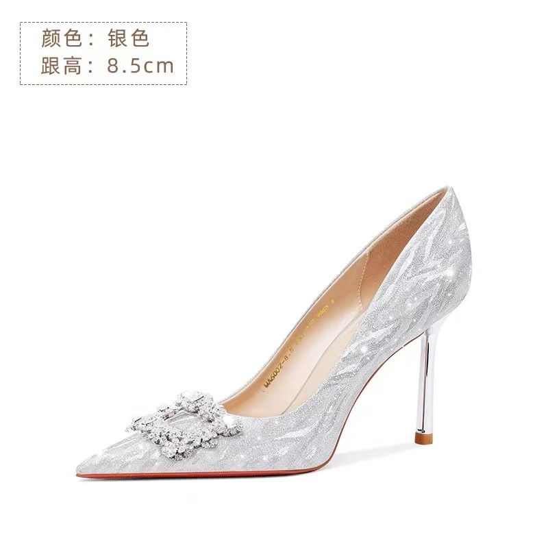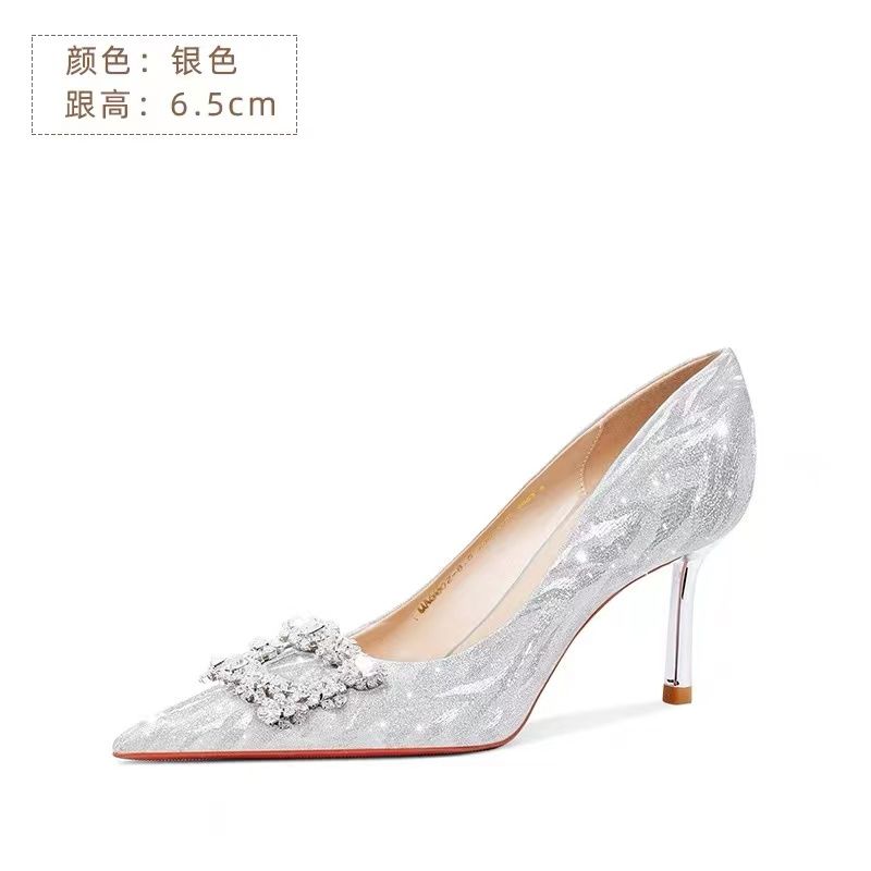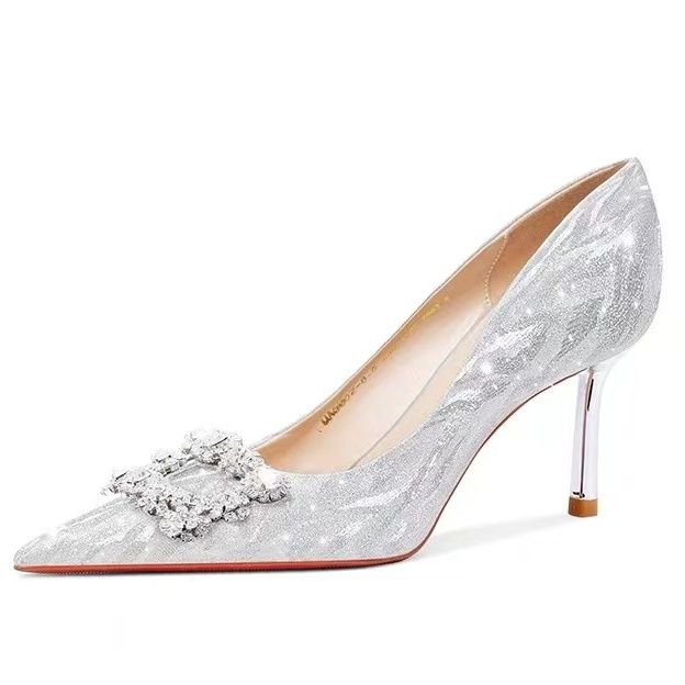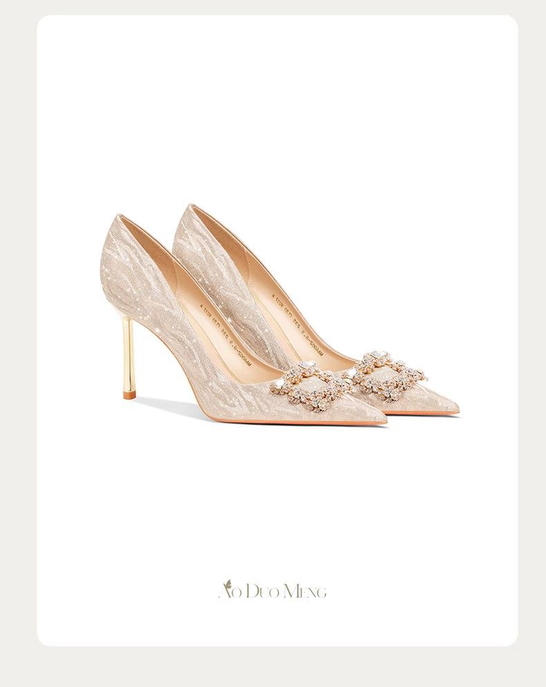 婚鞋新娘鞋女2023新款法式不累脚高级感订婚鞋金色水晶婚纱高跟鞋