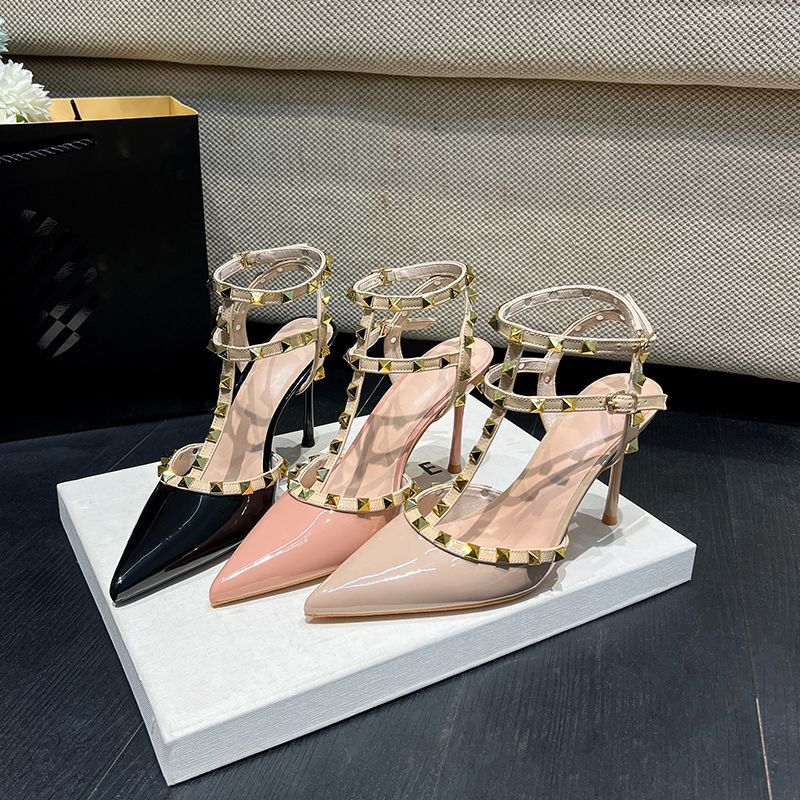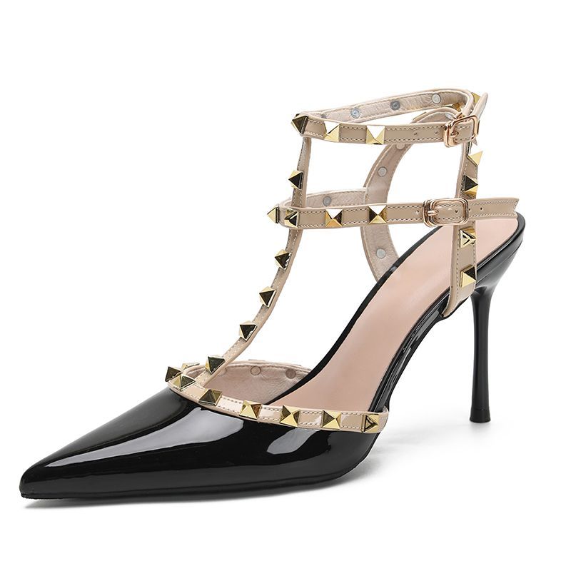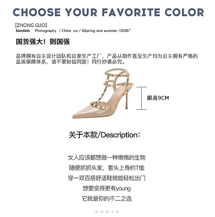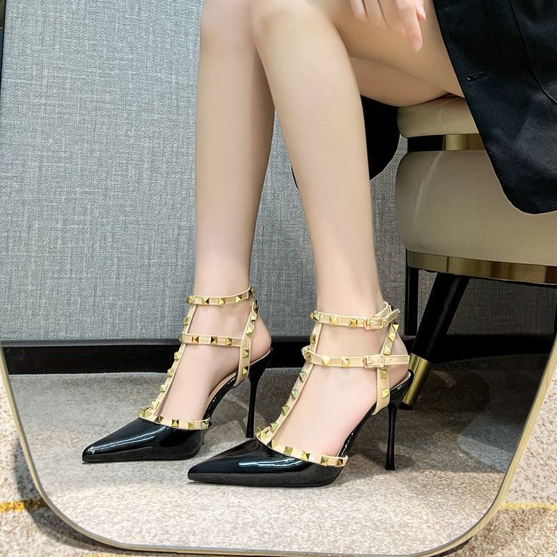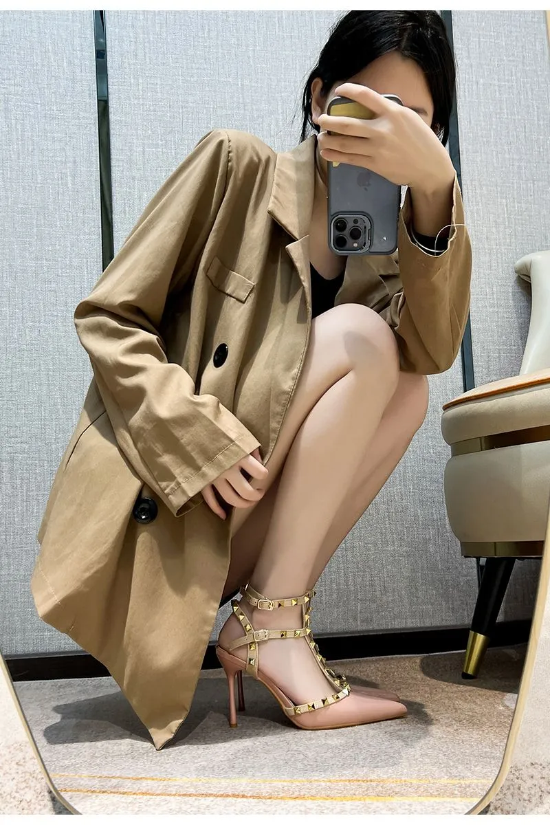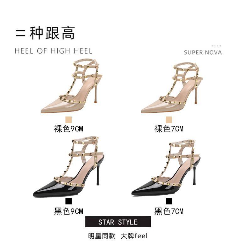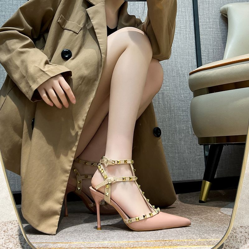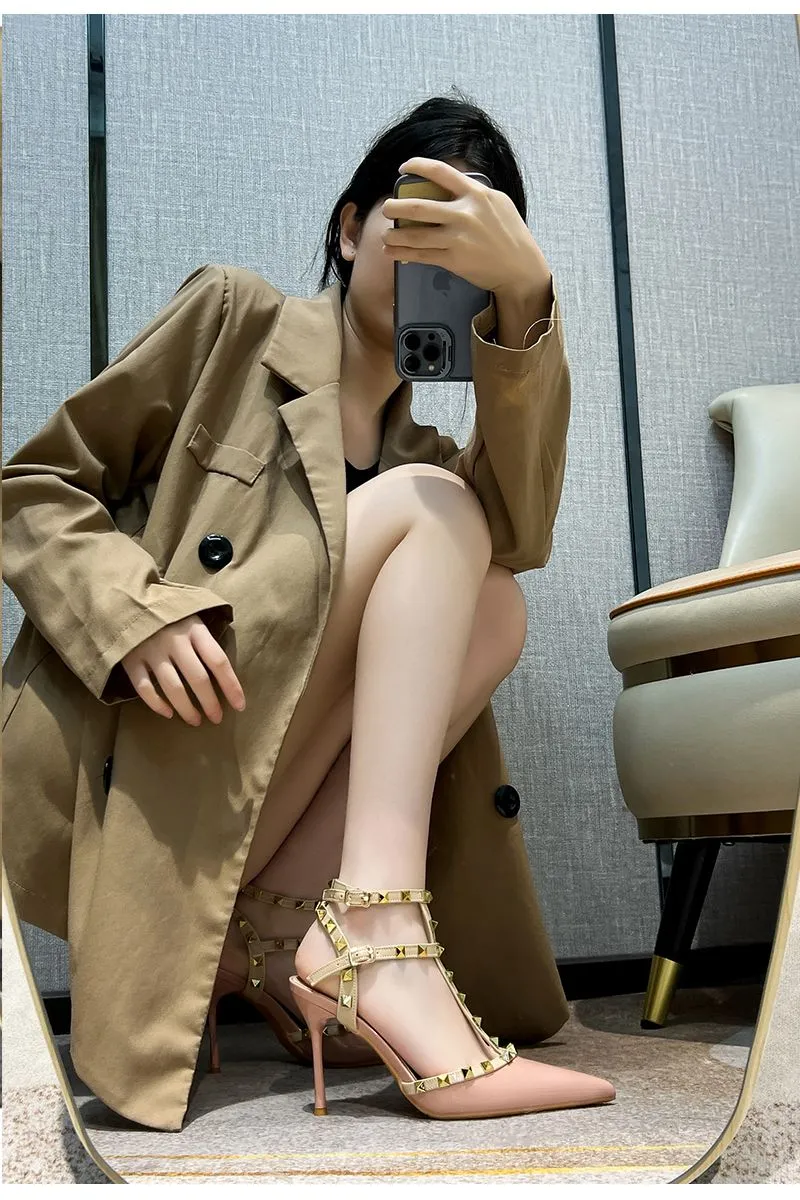 铆钉裸色高跟鞋女细跟2024春夏季新款罗马凉鞋网红性感女单鞋尖头
