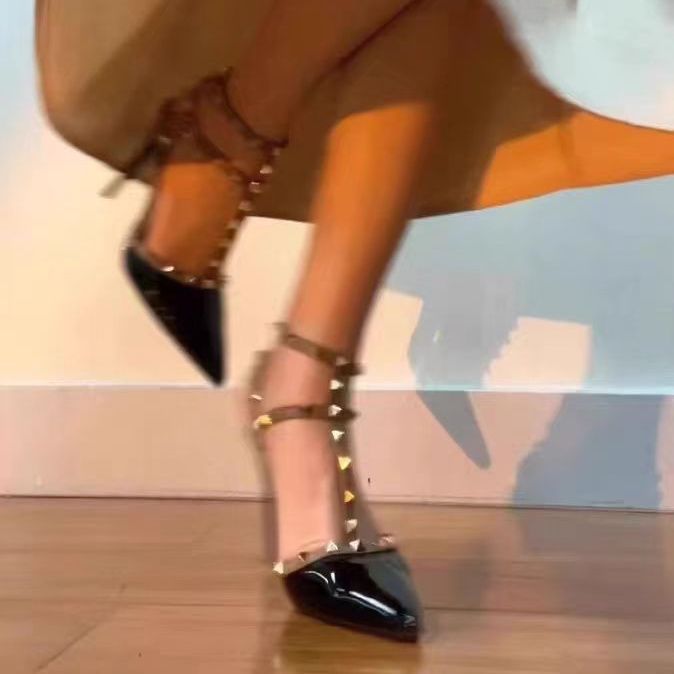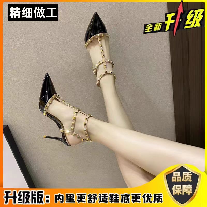 皮尔世绅铆钉高跟鞋女2024春夏季款尖头细跟白色柳丁网红凉鞋单鞋