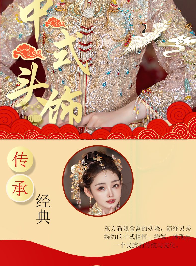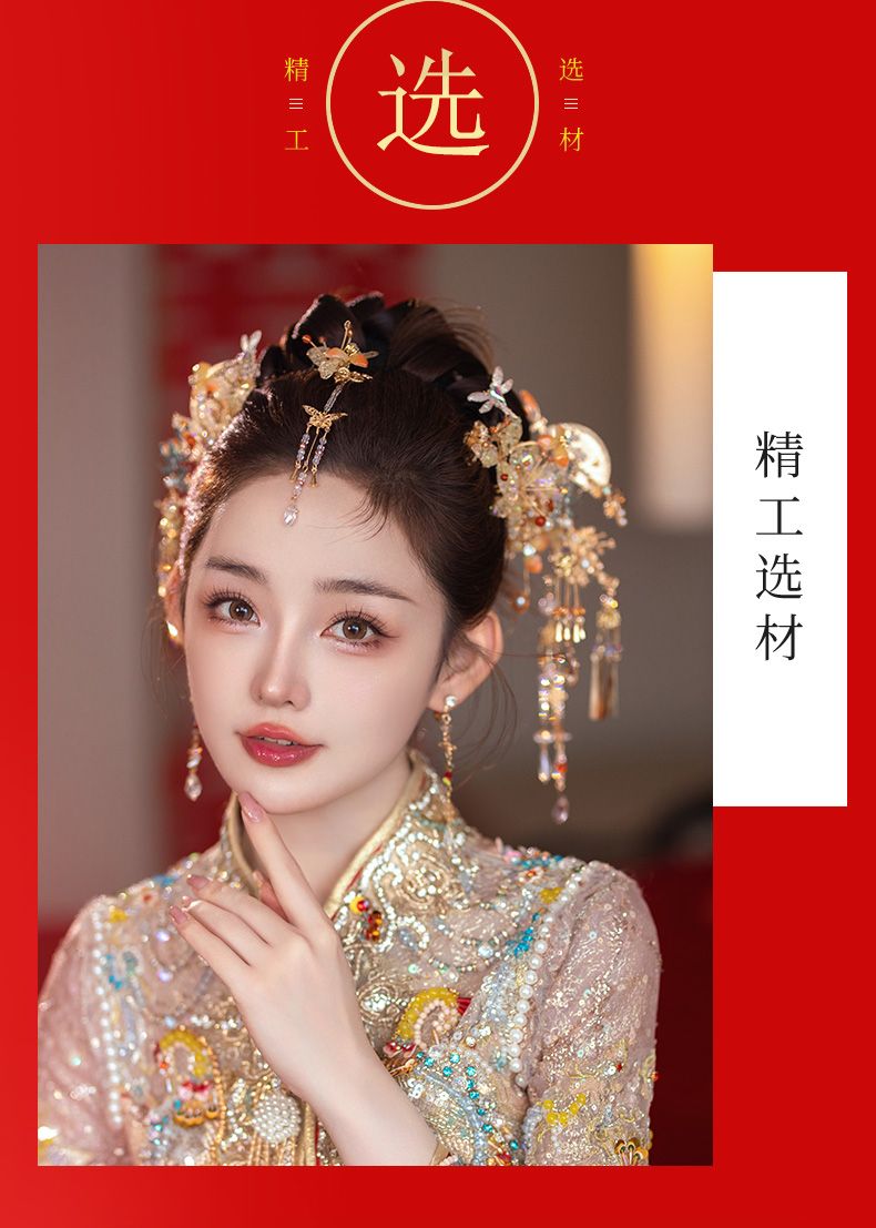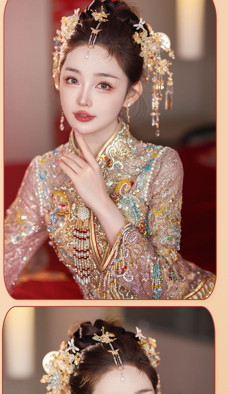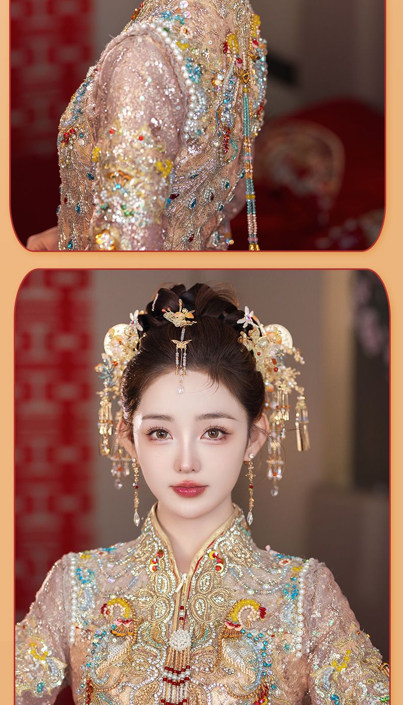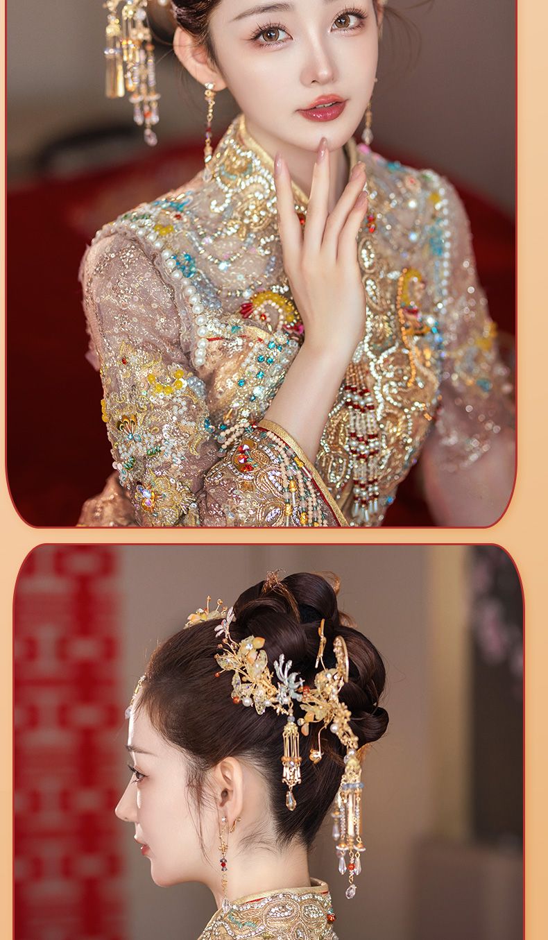 新娘秀禾头饰金色龙凤褂减龄新中式发饰古典婚礼步摇流苏高级配饰