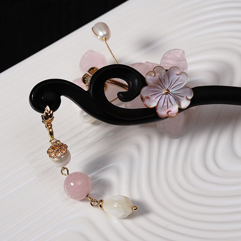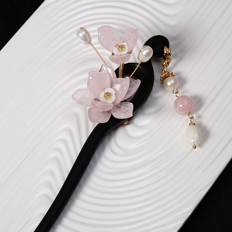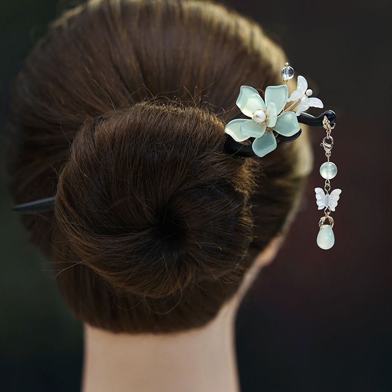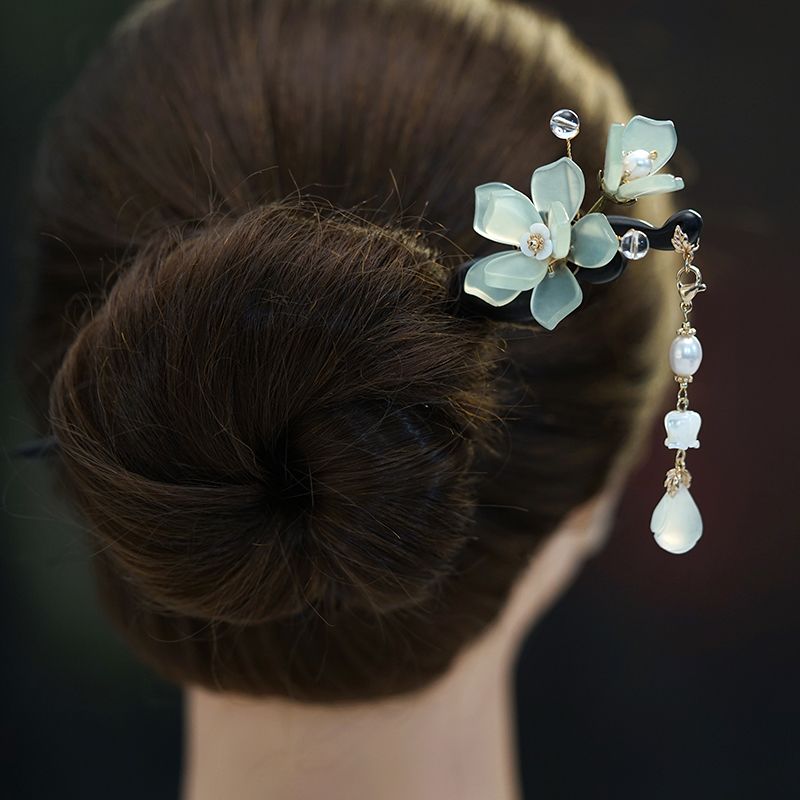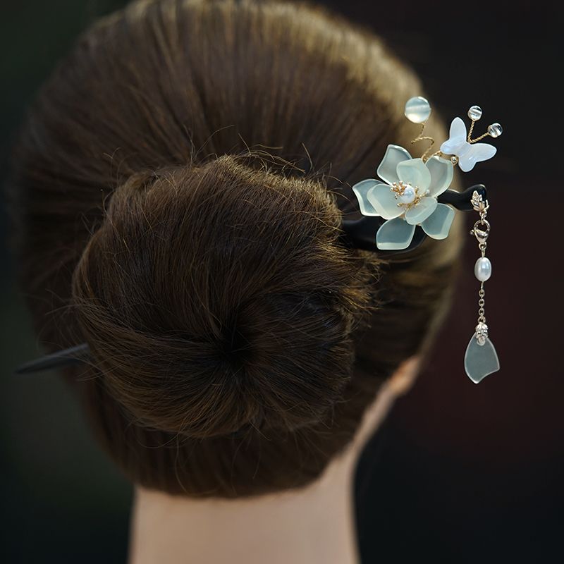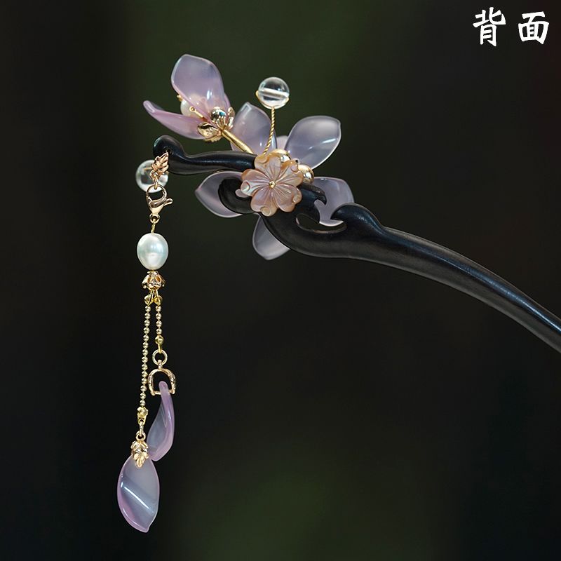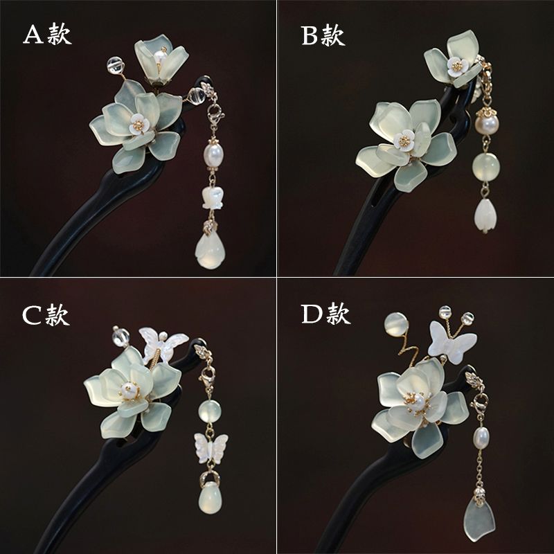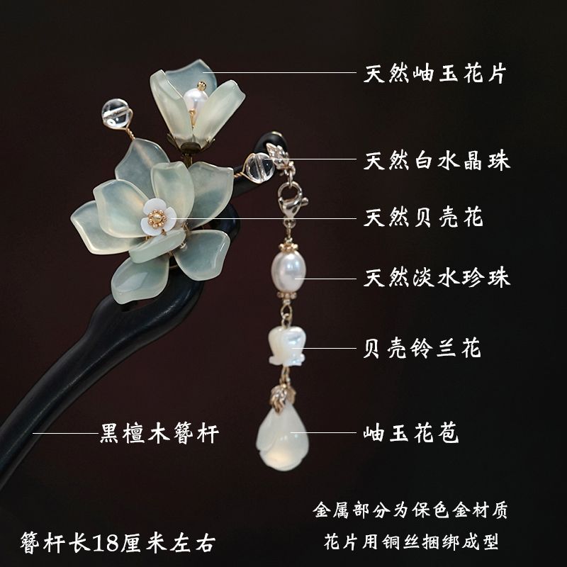 发簪子女古风步摇流苏黑檀木汉服头饰手工玉兰花发钗岫玉七夕礼物