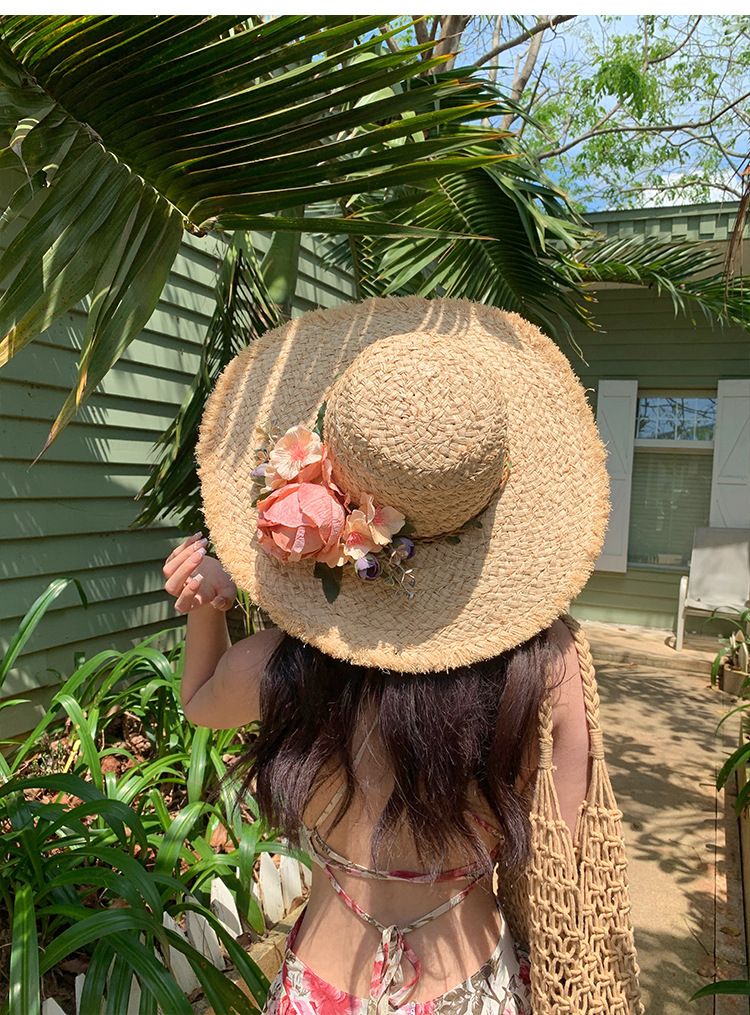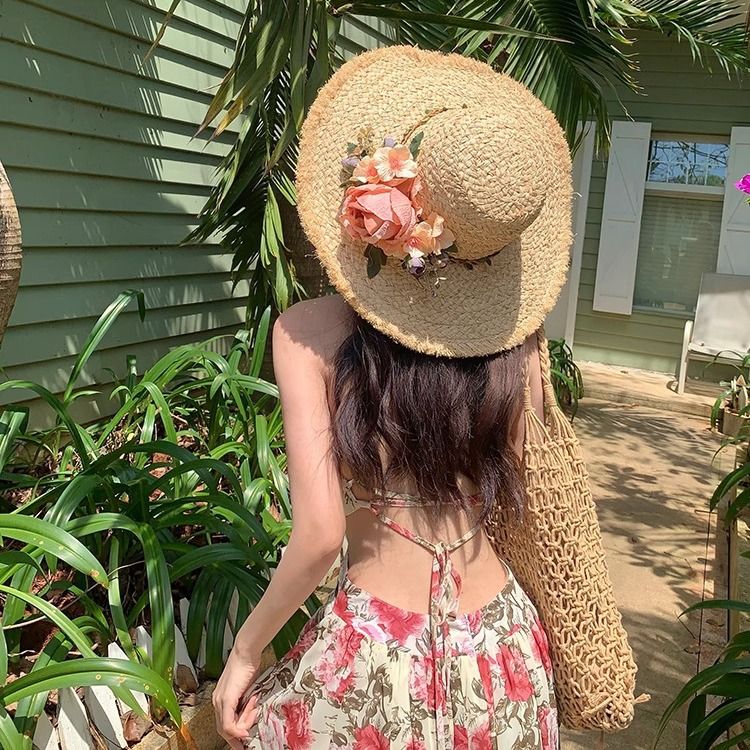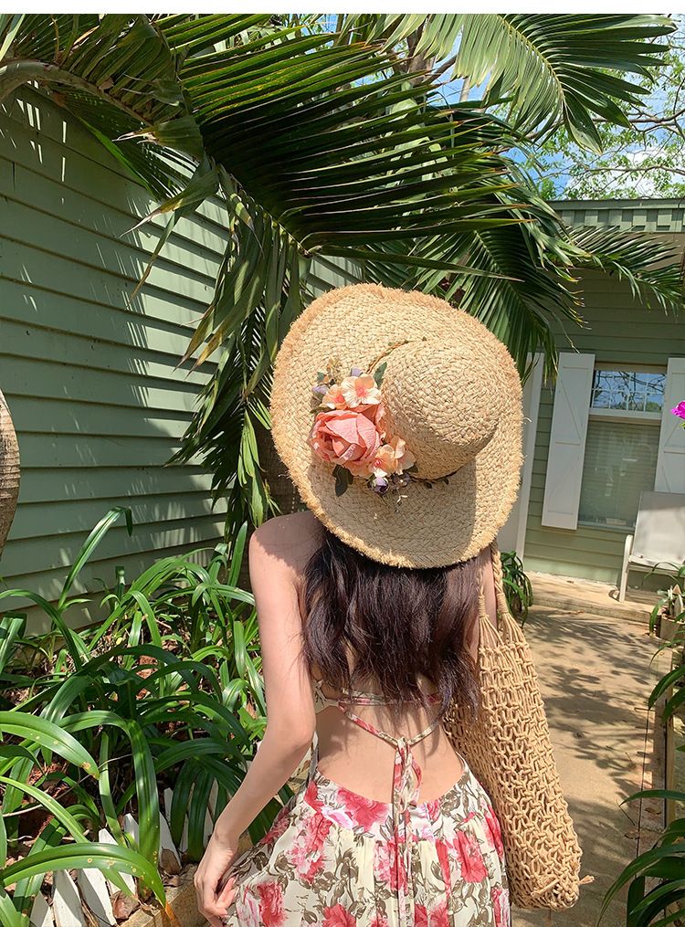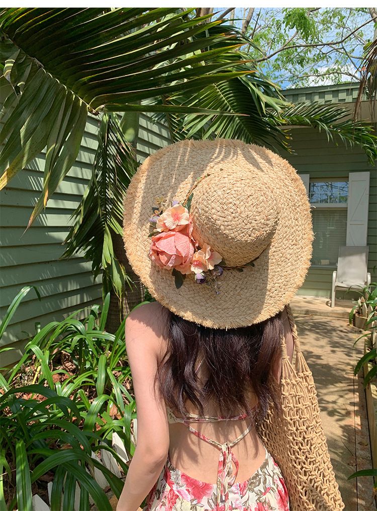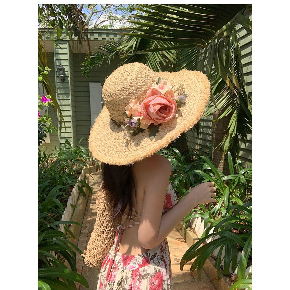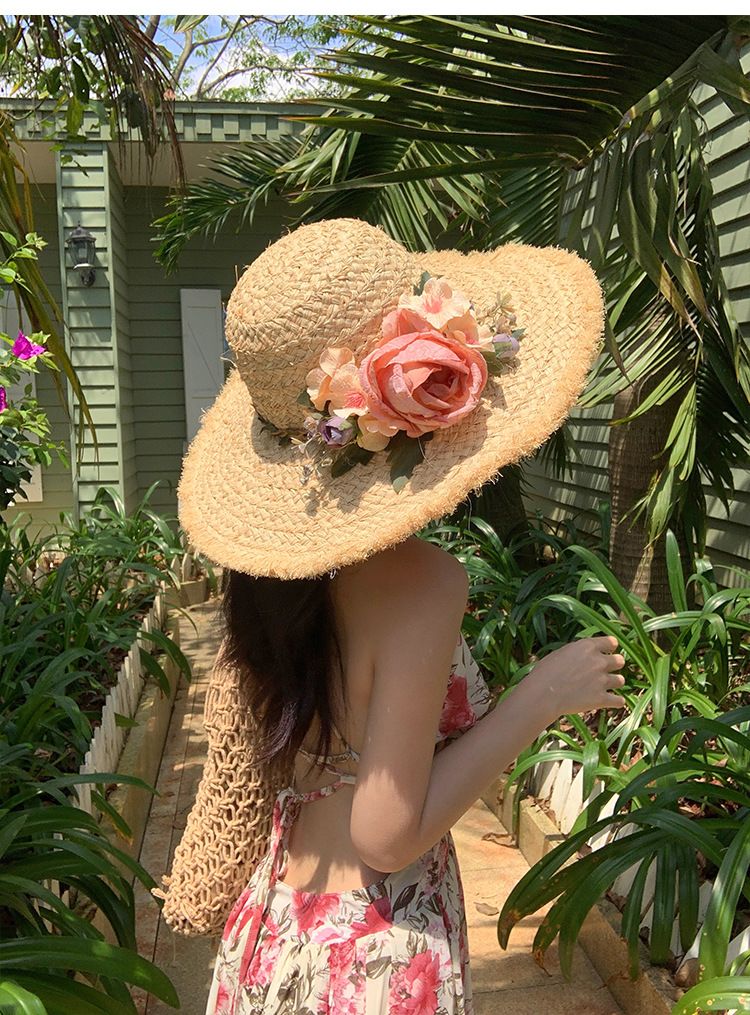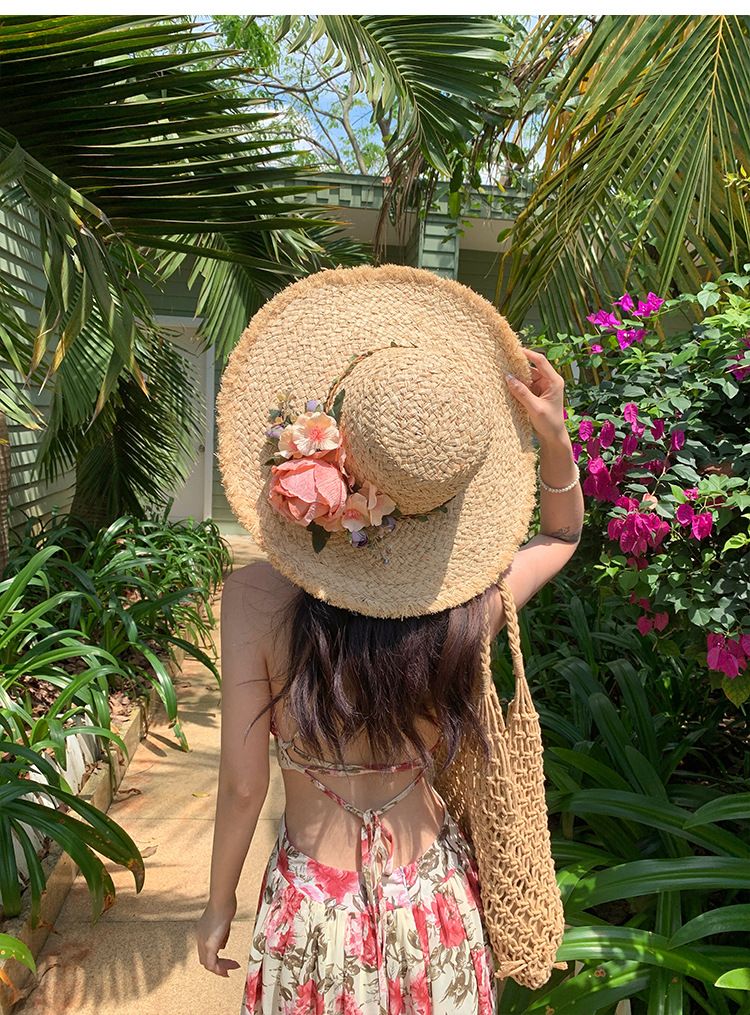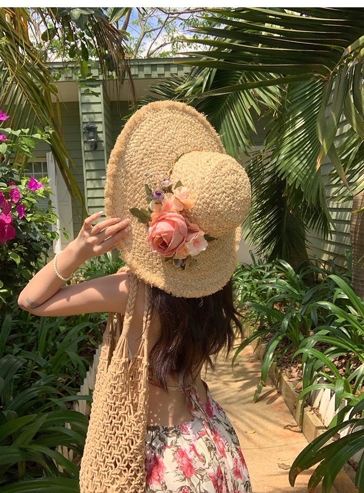 花朵编织拉菲草帽女夏季法式大帽檐遮阳防晒帽海边度假太阳帽子潮