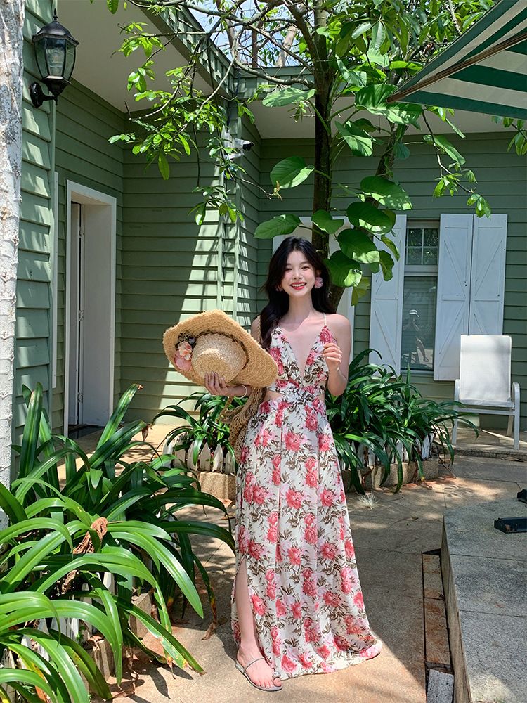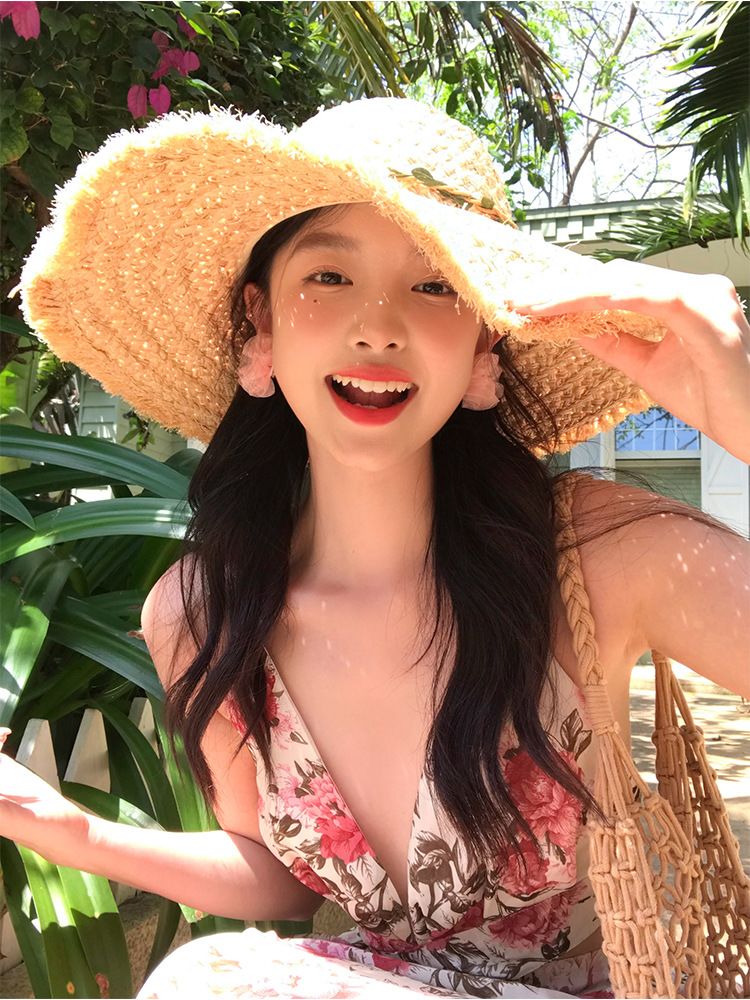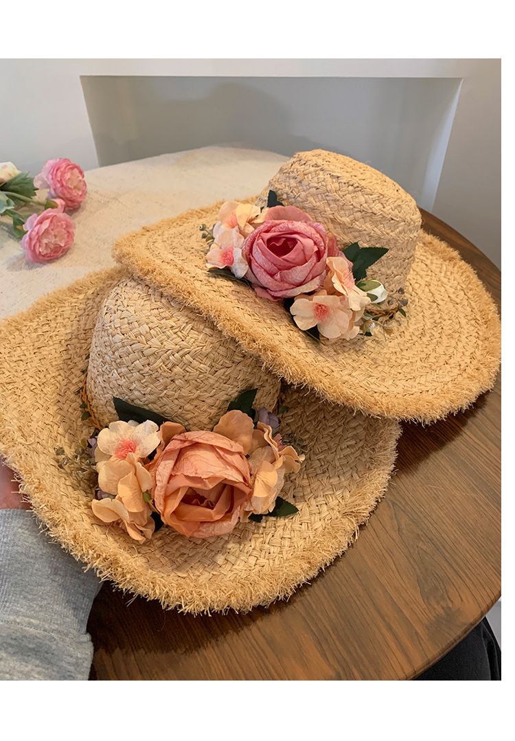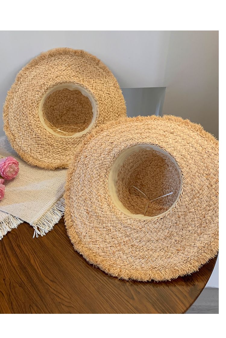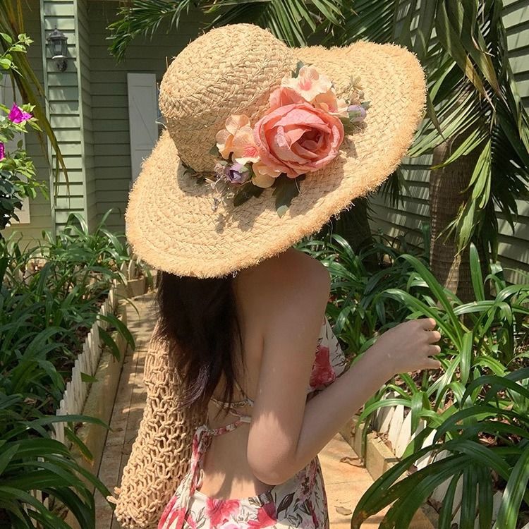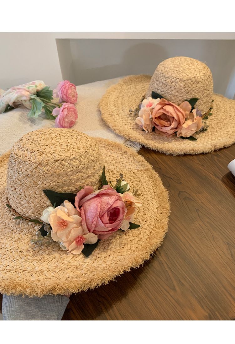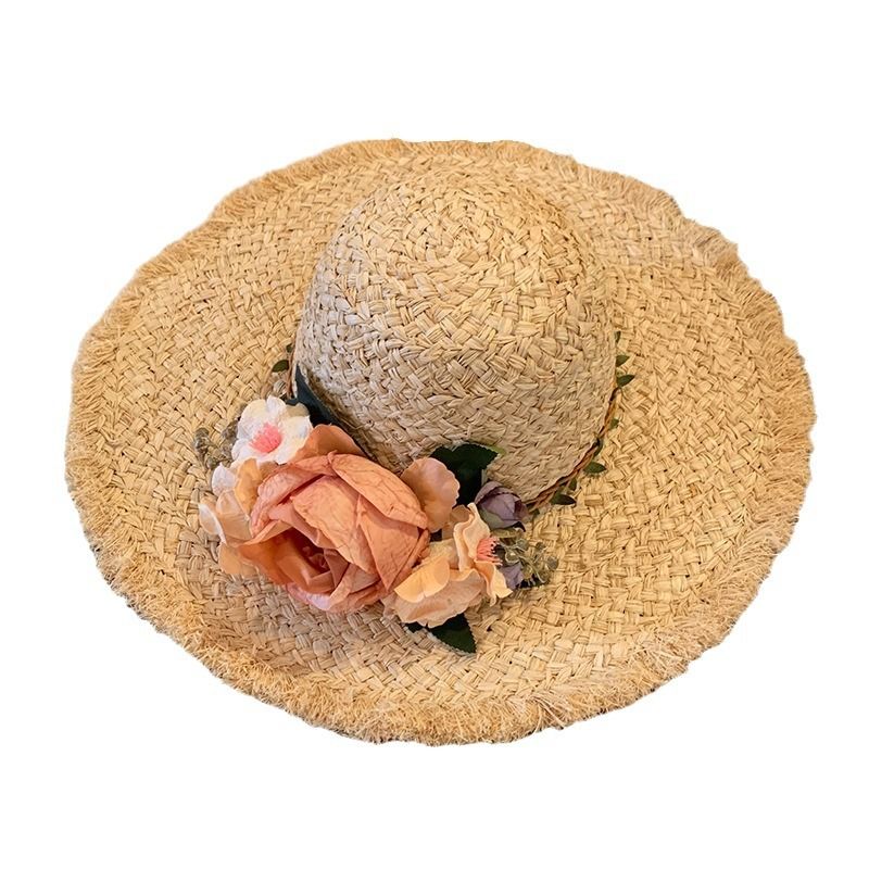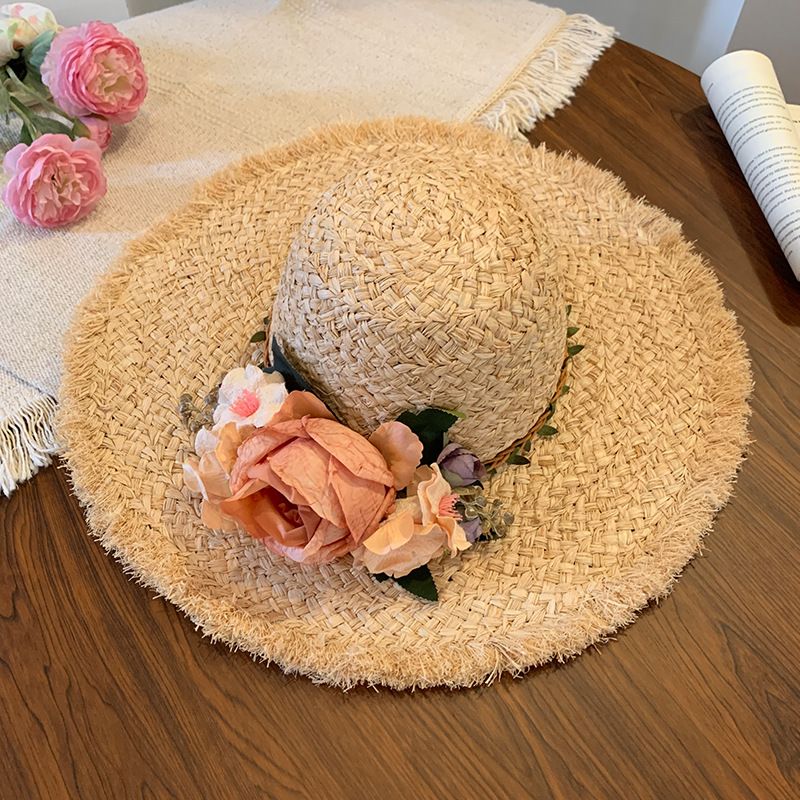 花朵编织拉菲草帽女夏季法式大帽檐遮阳防晒帽海边度假太阳帽子潮