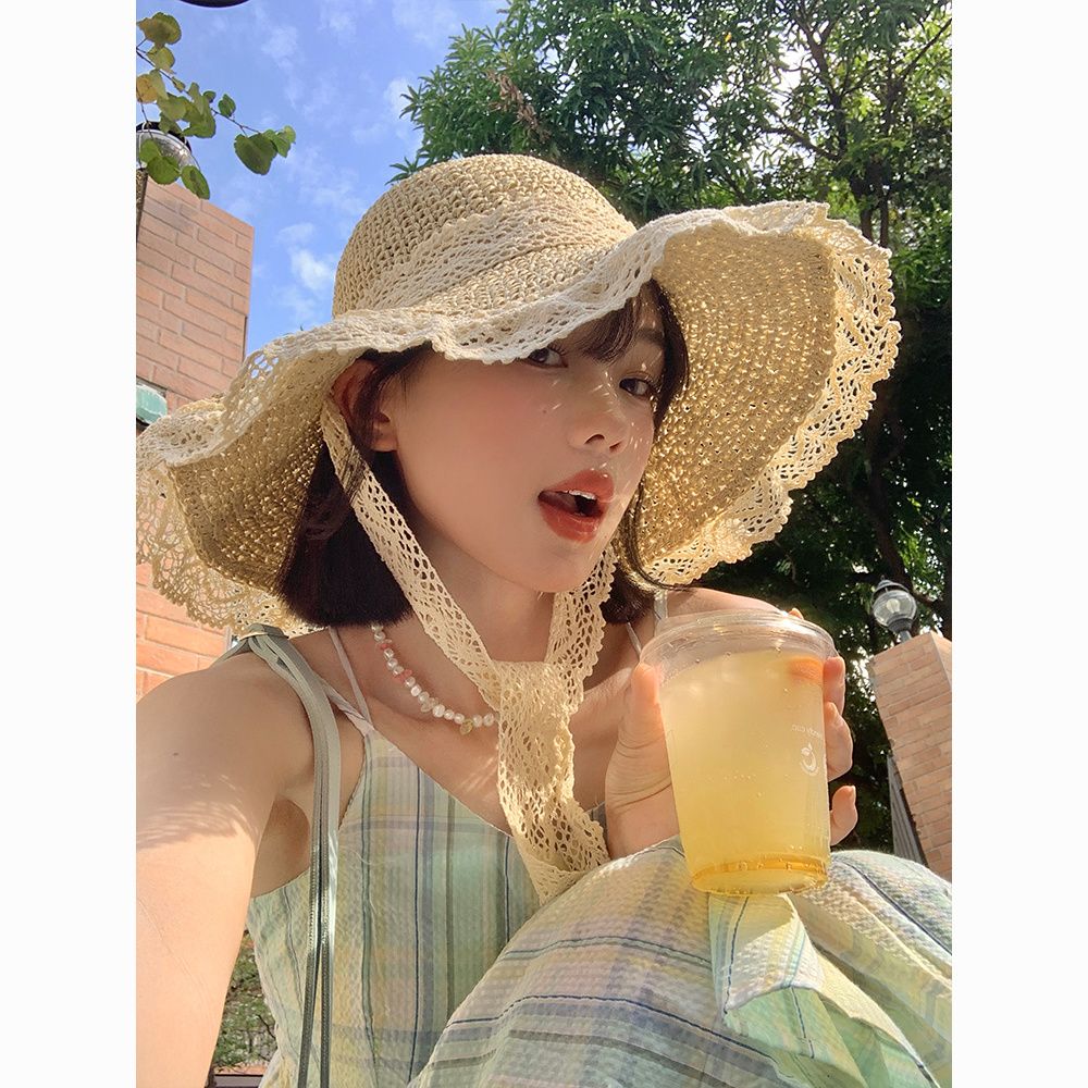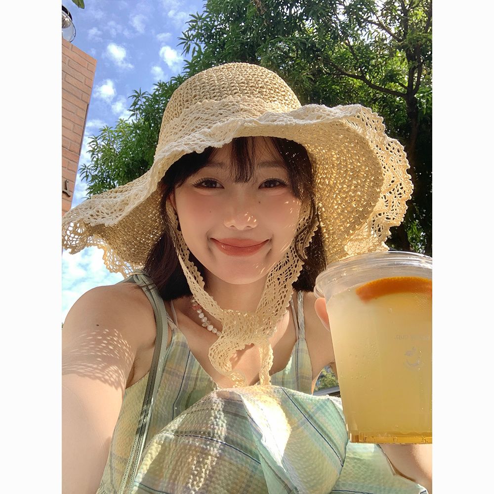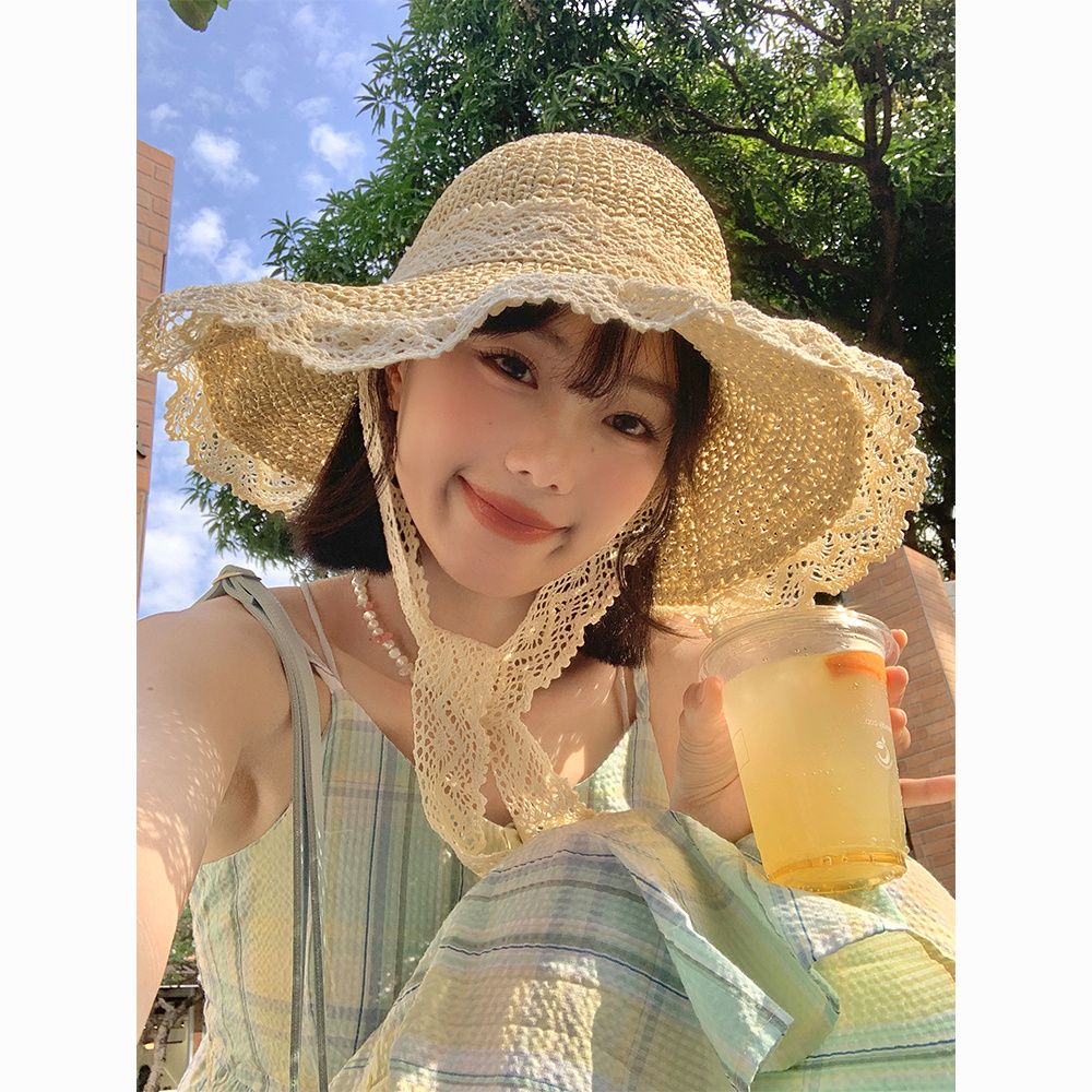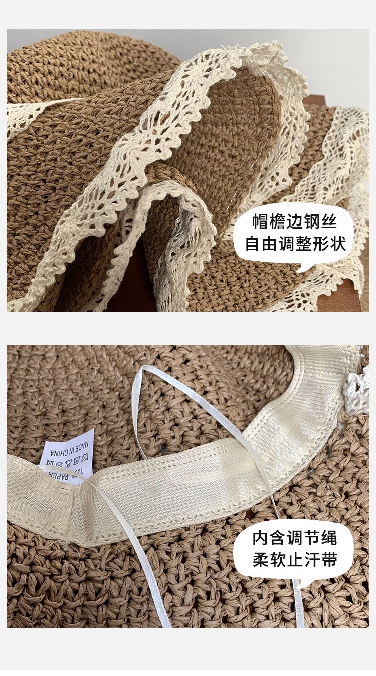 法式草帽女2024夏季新款透气蕾丝花边镂空防晒帽海边帽子遮阳帽