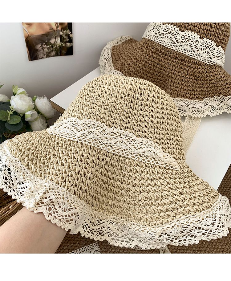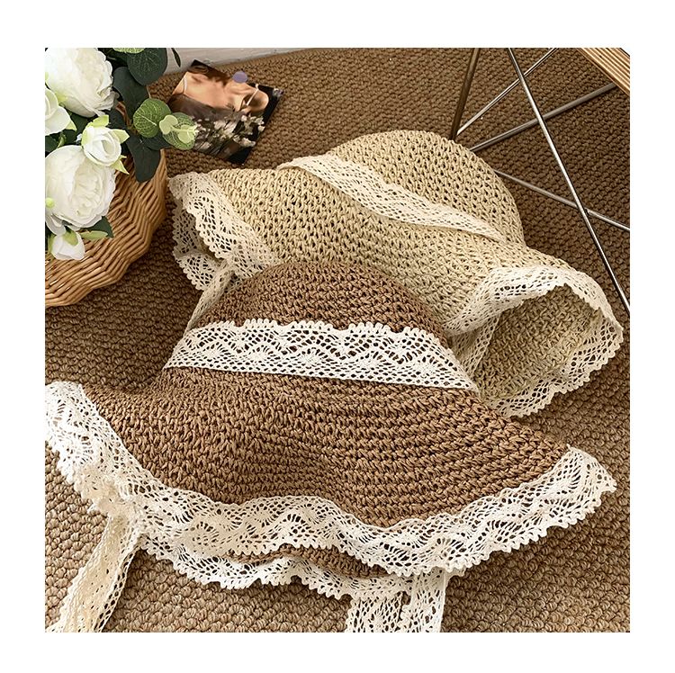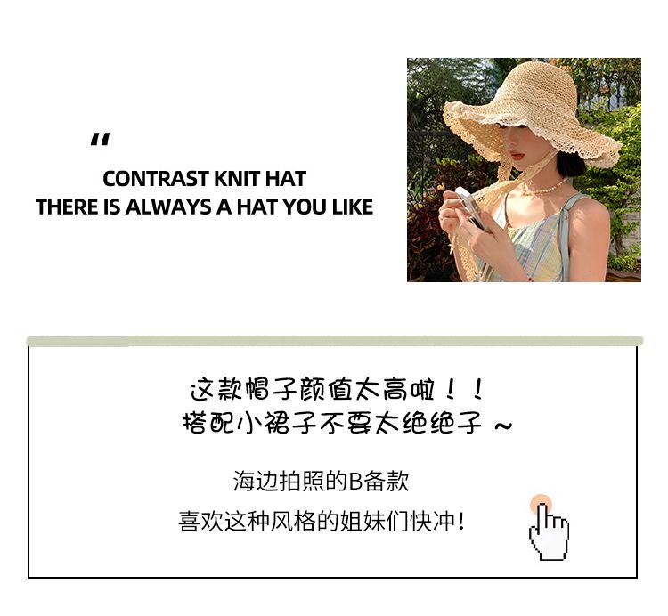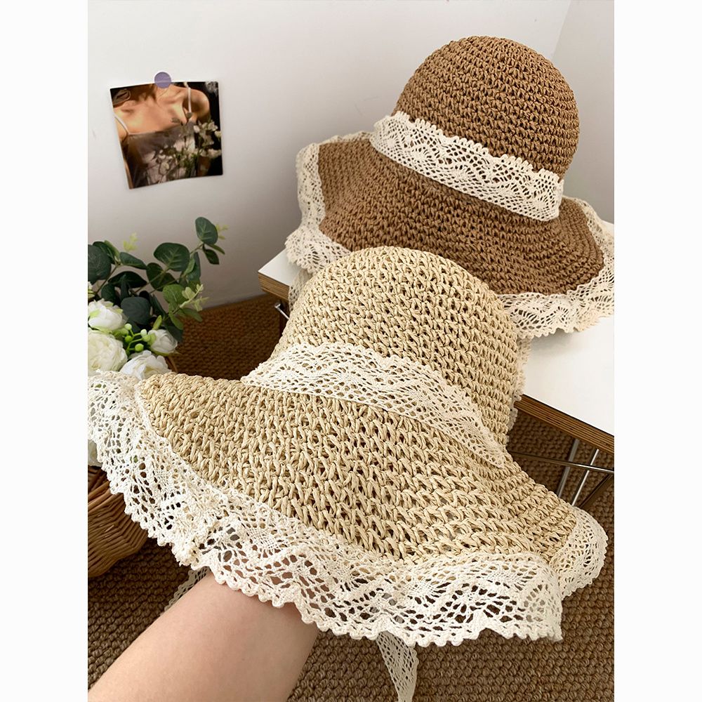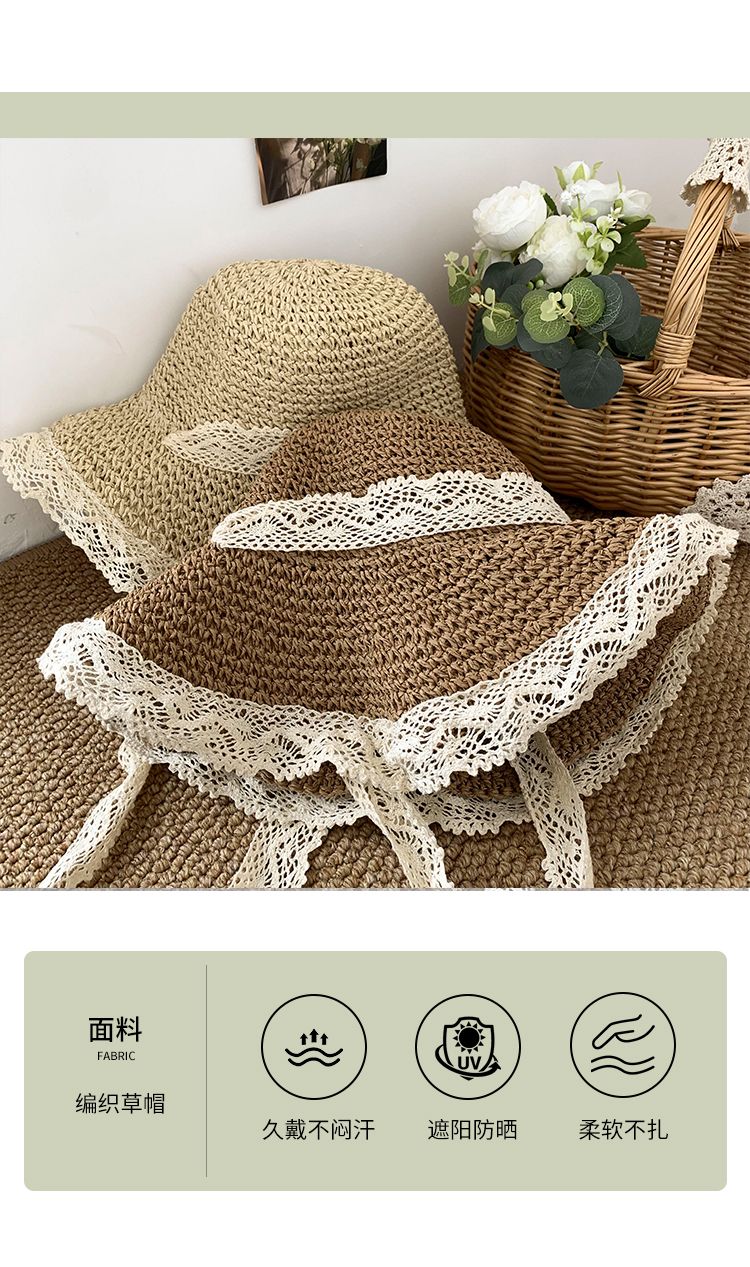 法式草帽女2024夏季新款透气蕾丝花边镂空防晒帽海边帽子遮阳帽