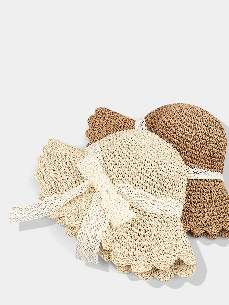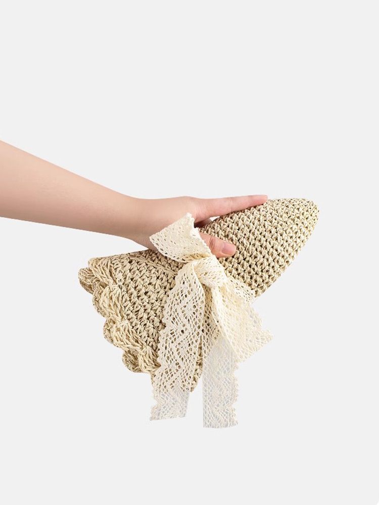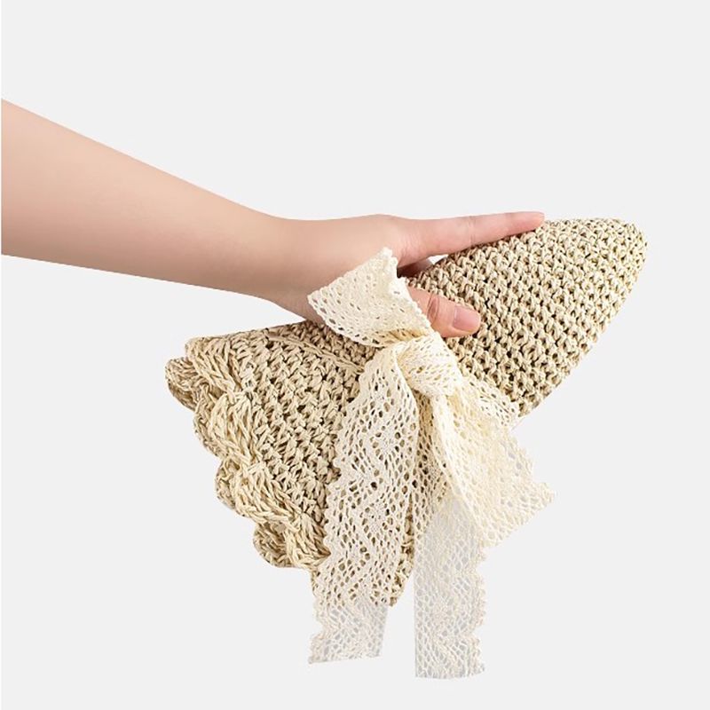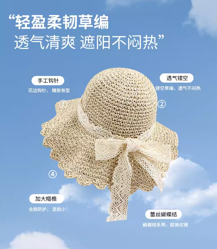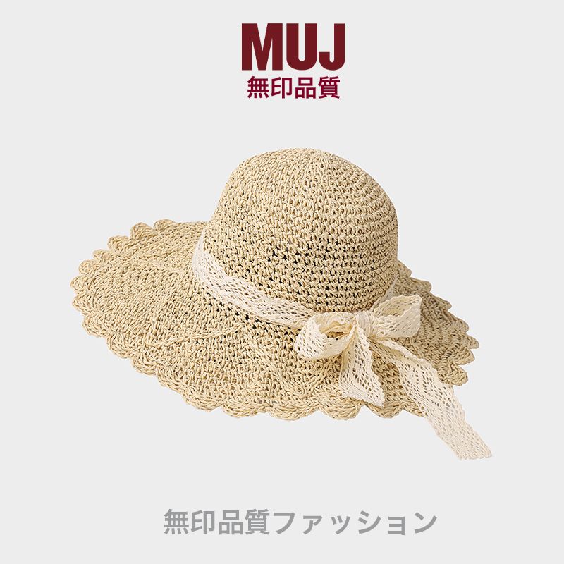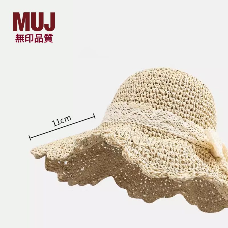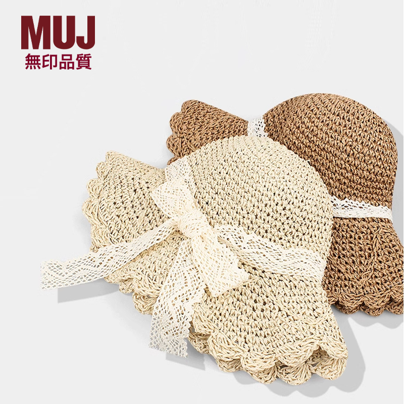 无印muj海边帽子女款夏天草帽遮阳帽田园风蝴蝶结蕾丝花边沙滩帽.