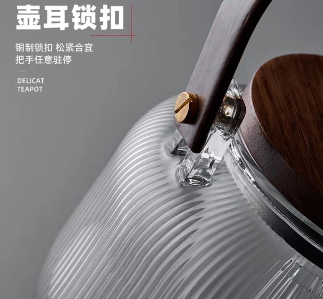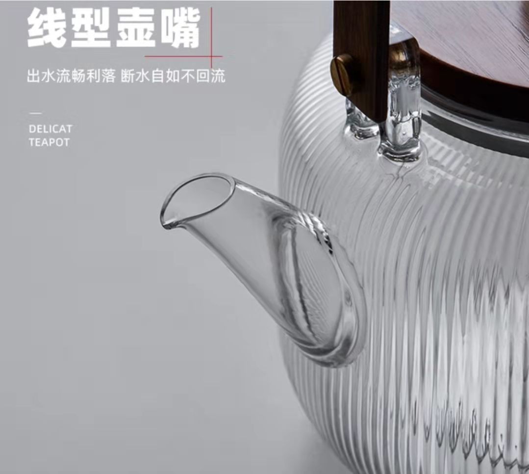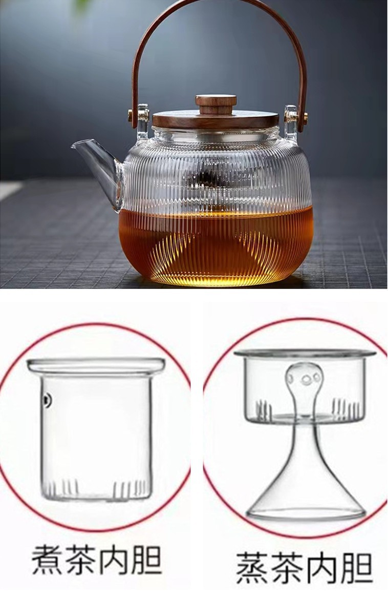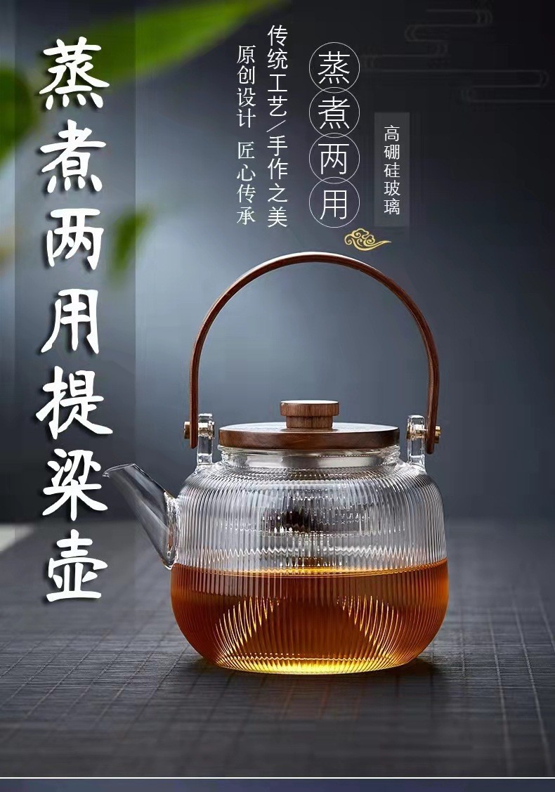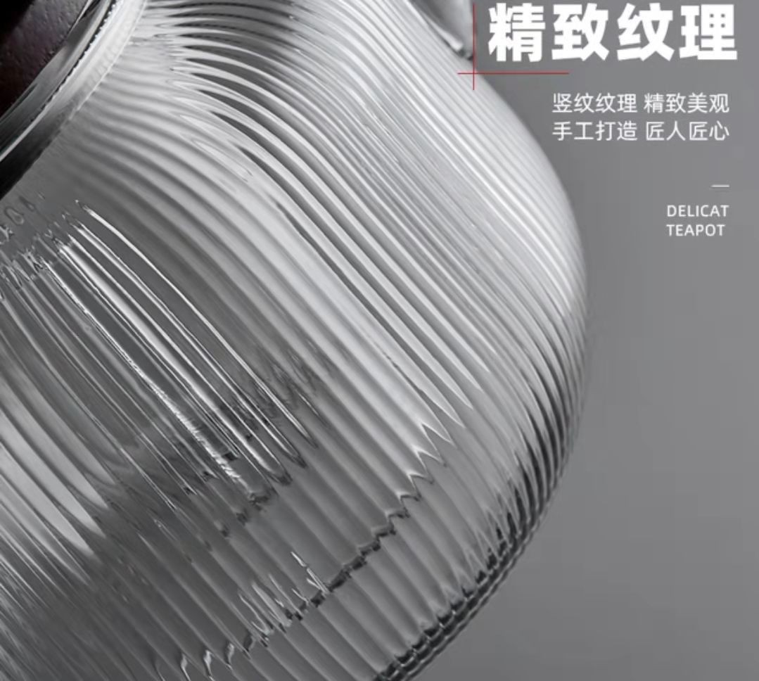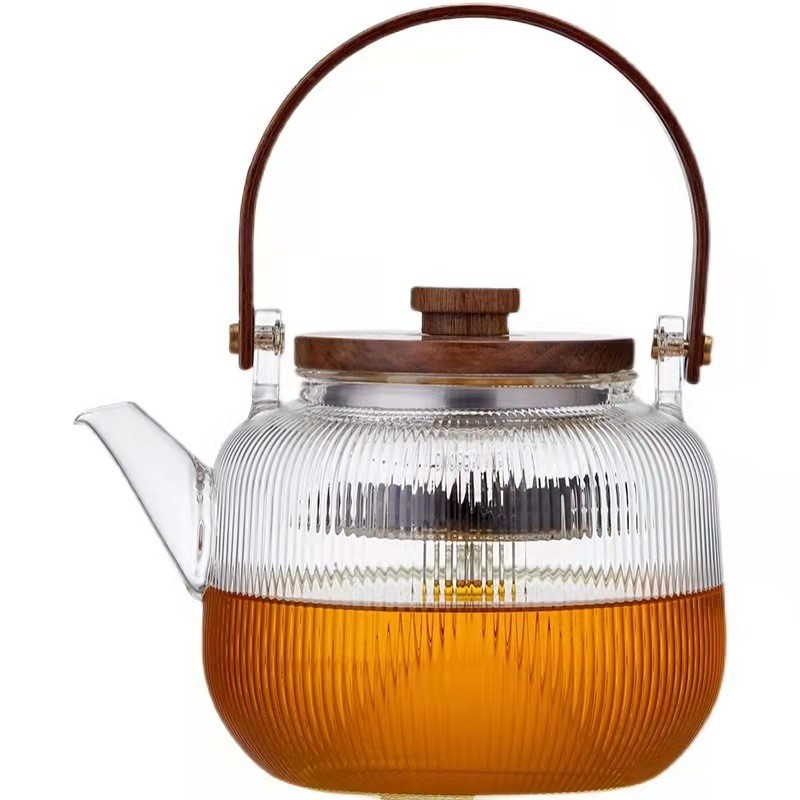 提梁壶高硼硅玻璃壶家用水果花茶茶壶玻璃条纹菊瓣壶耐热玻璃茶壶