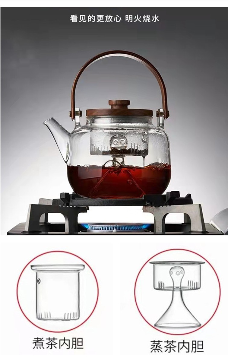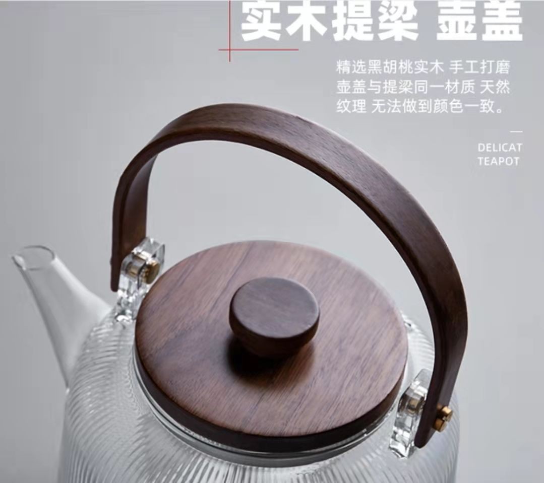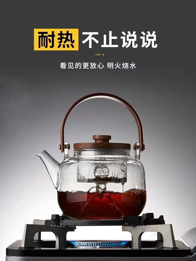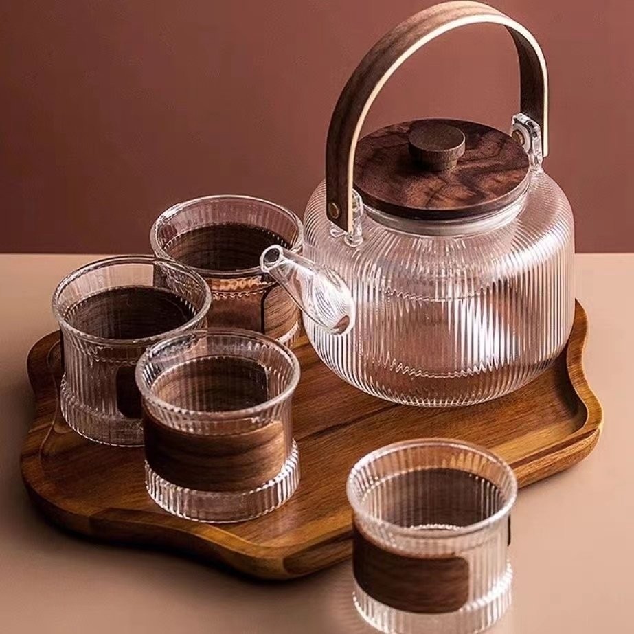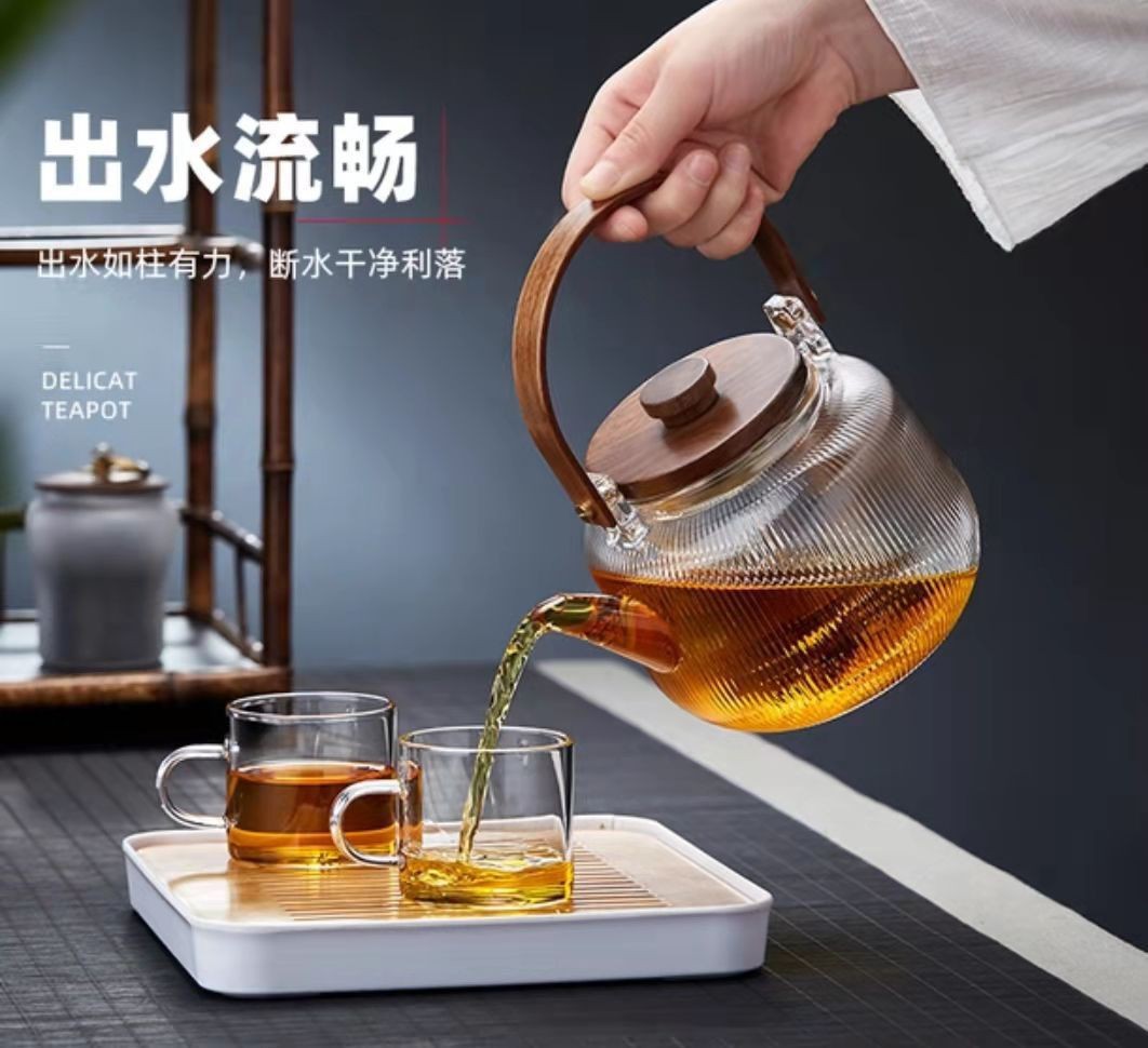提梁壶高硼硅玻璃壶家用水果花茶茶壶玻璃条纹菊瓣壶耐热玻璃茶壶