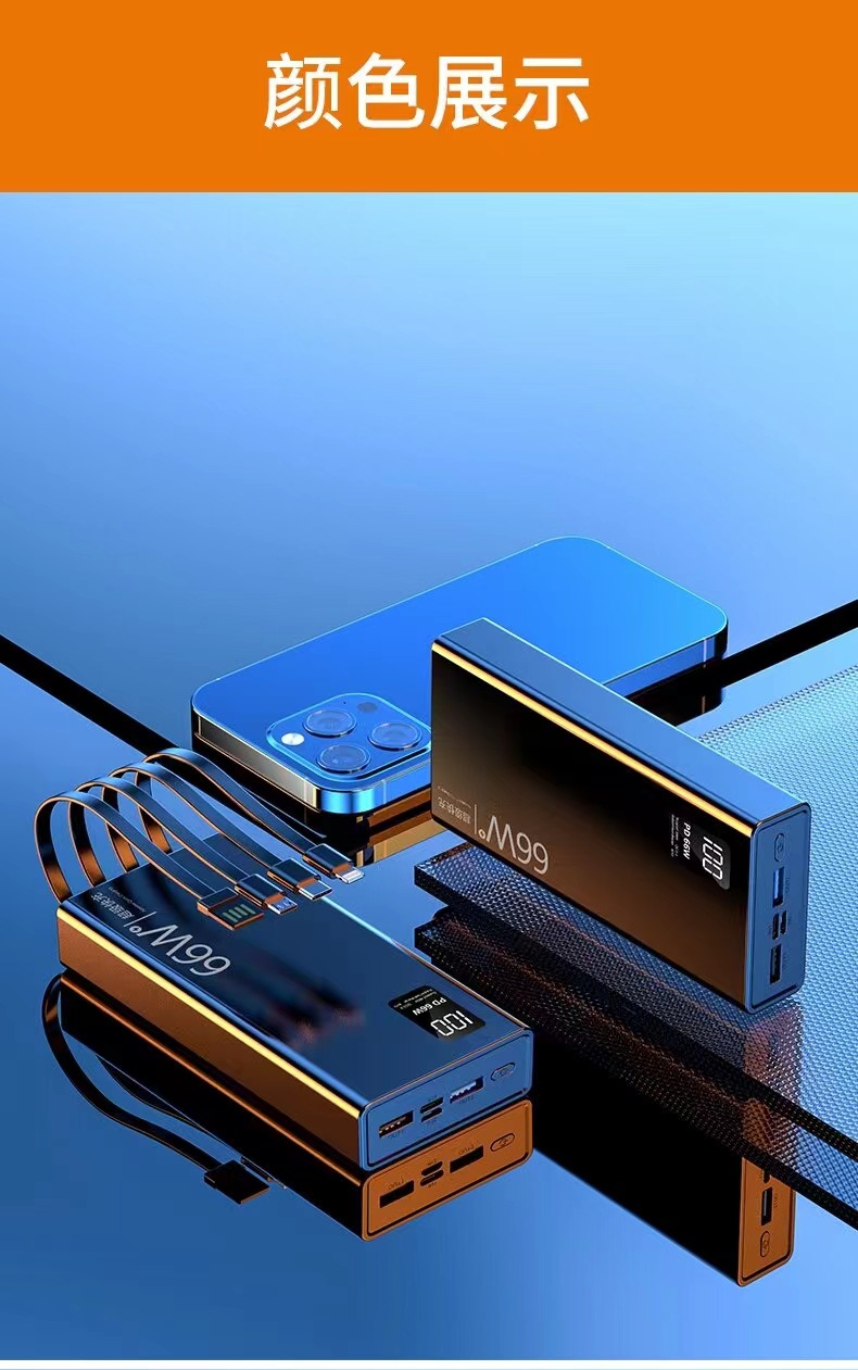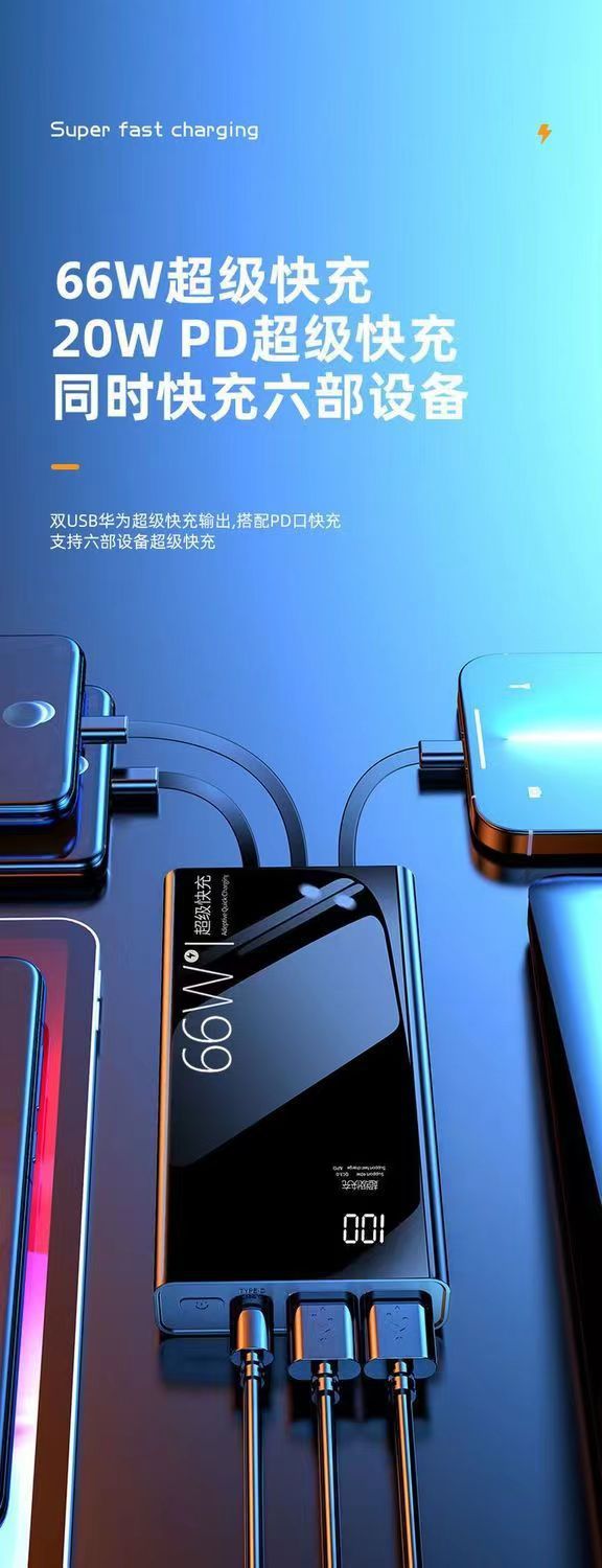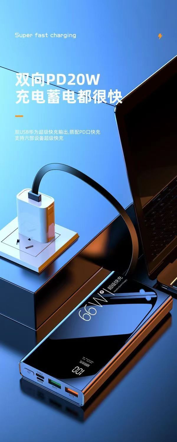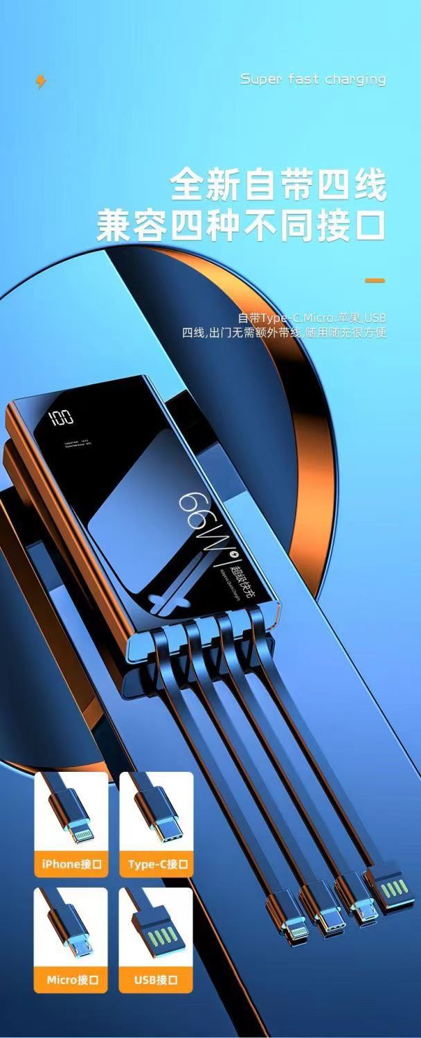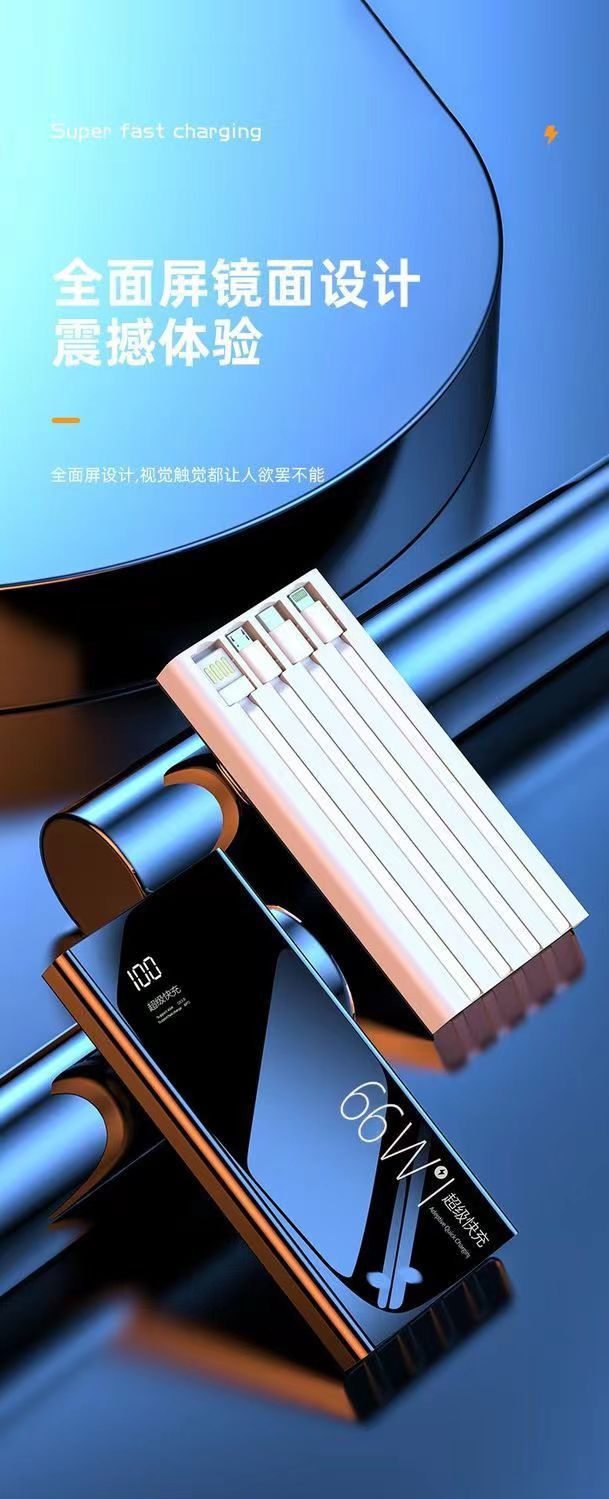 批发自带线充电宝50000毫安66W超级快充闪充移动电源定制LOGO图案