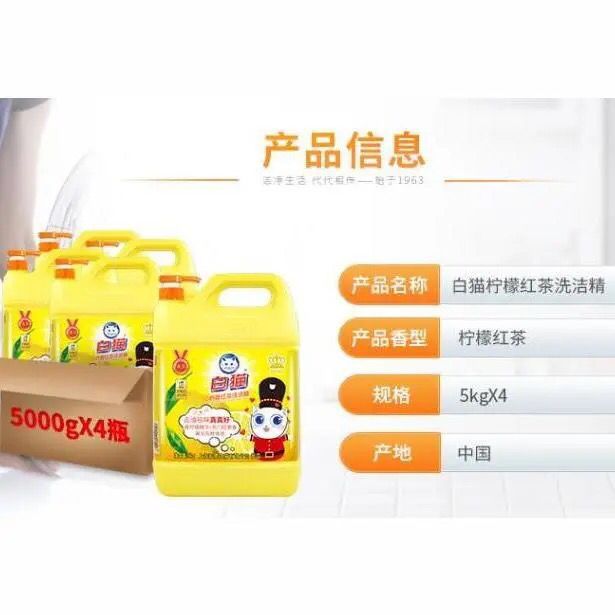 | white cat lemon black tea detergent 5kg * 4 bottles(白猫柠檬红茶洗洁精5kg*4瓶) | USD $21.43 | 99999 piece available |