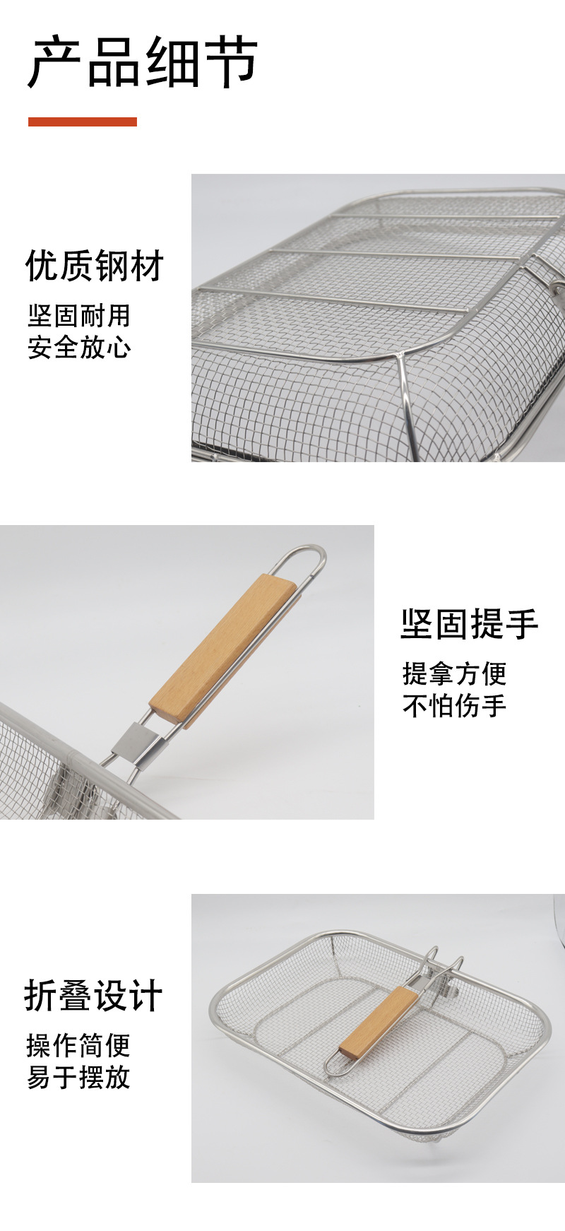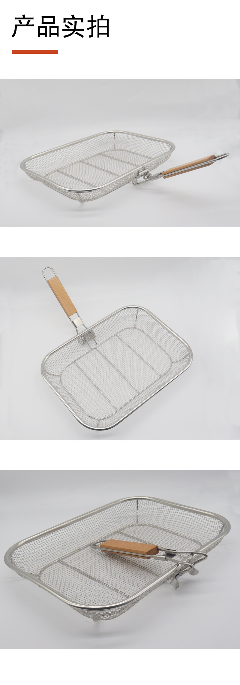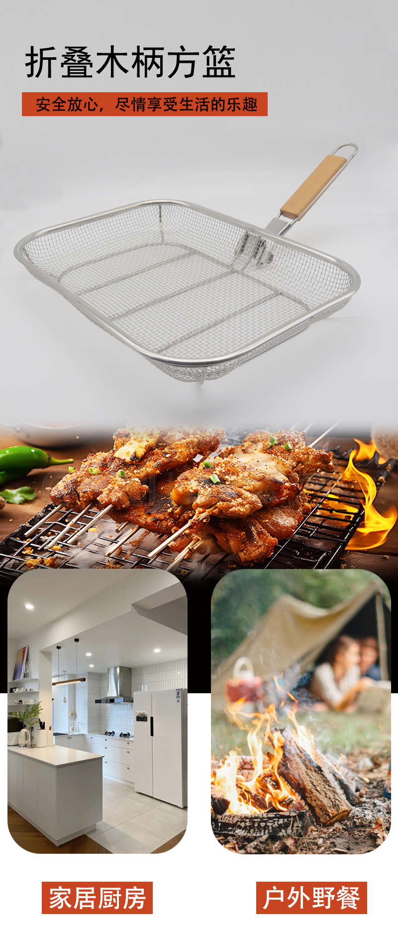 跨境热卖不锈钢折叠木柄烧烤网篮家用户外蔬菜沥水篮方形油炸篮