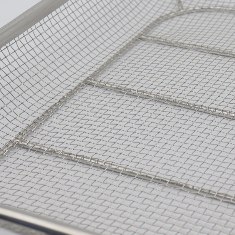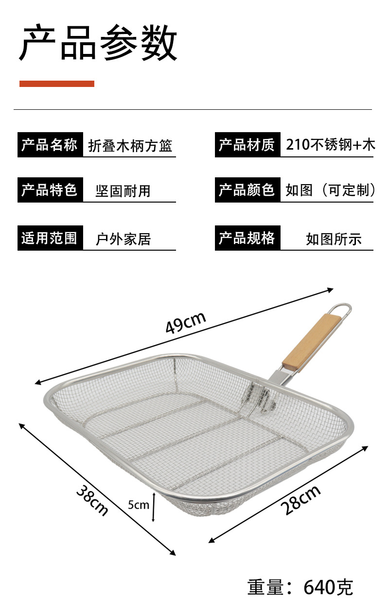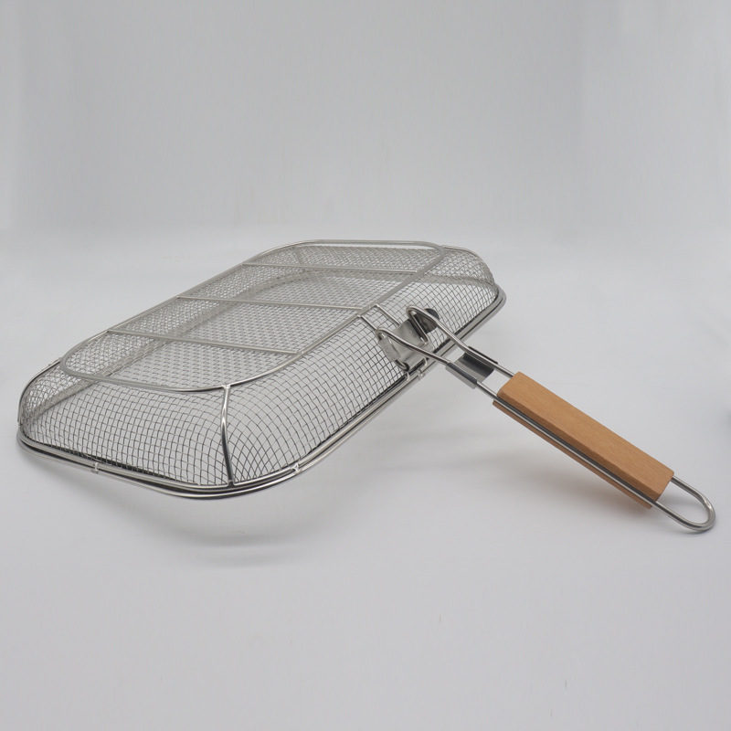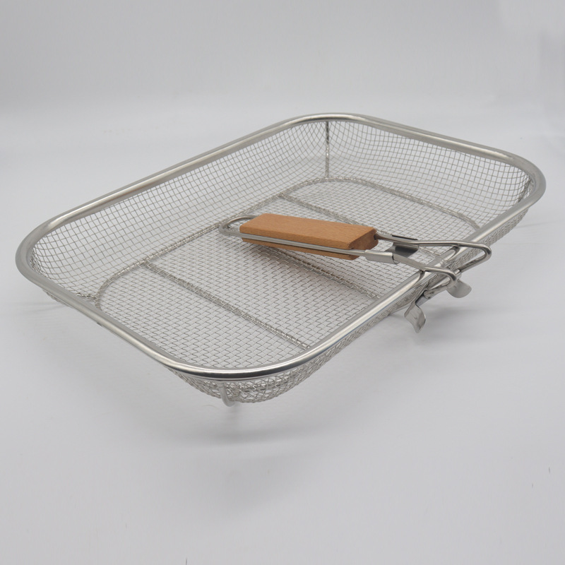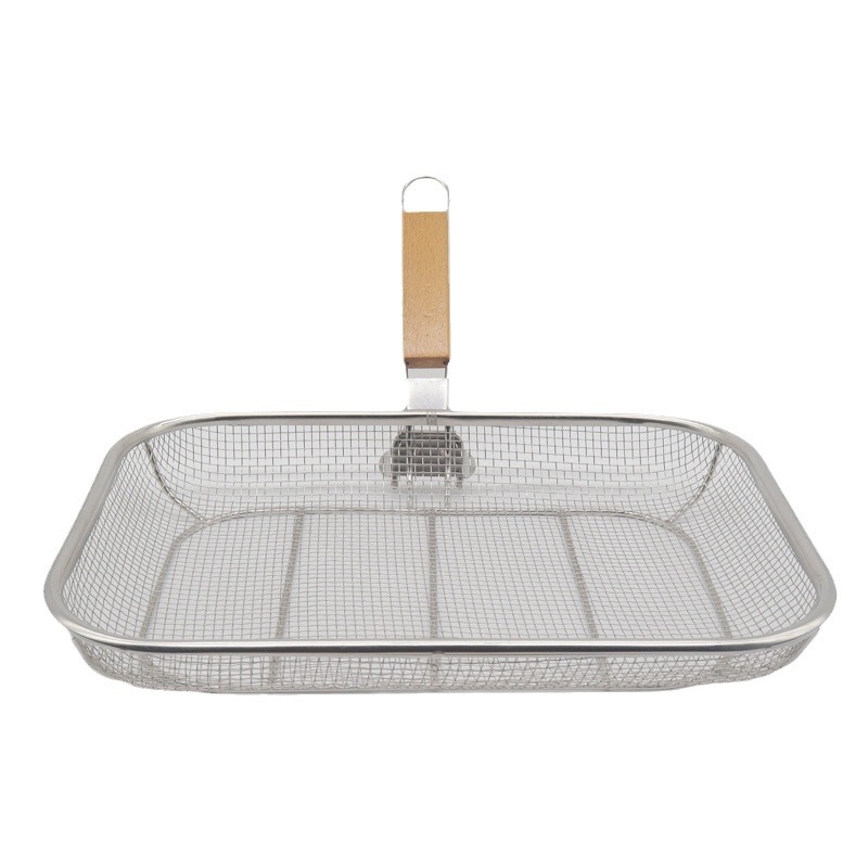 跨境热卖不锈钢折叠木柄烧烤网篮家用户外蔬菜沥水篮方形油炸篮