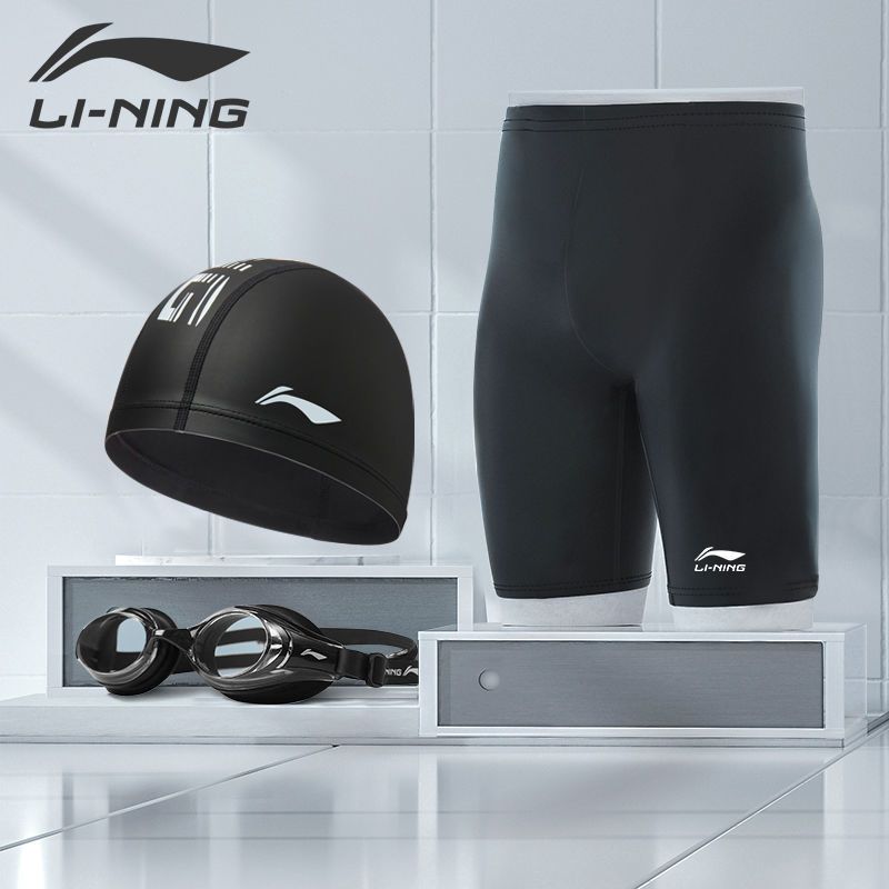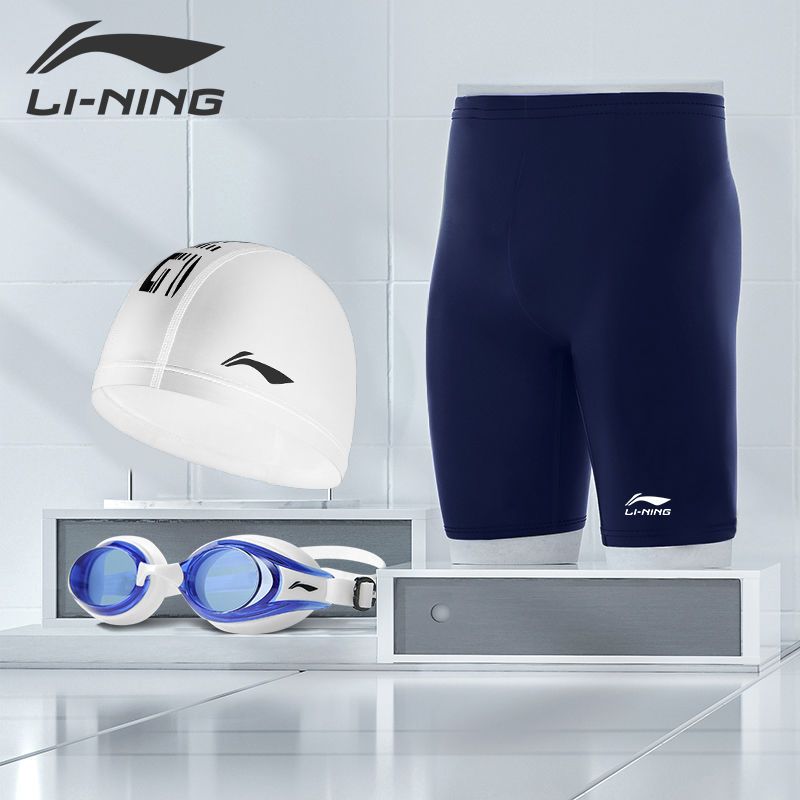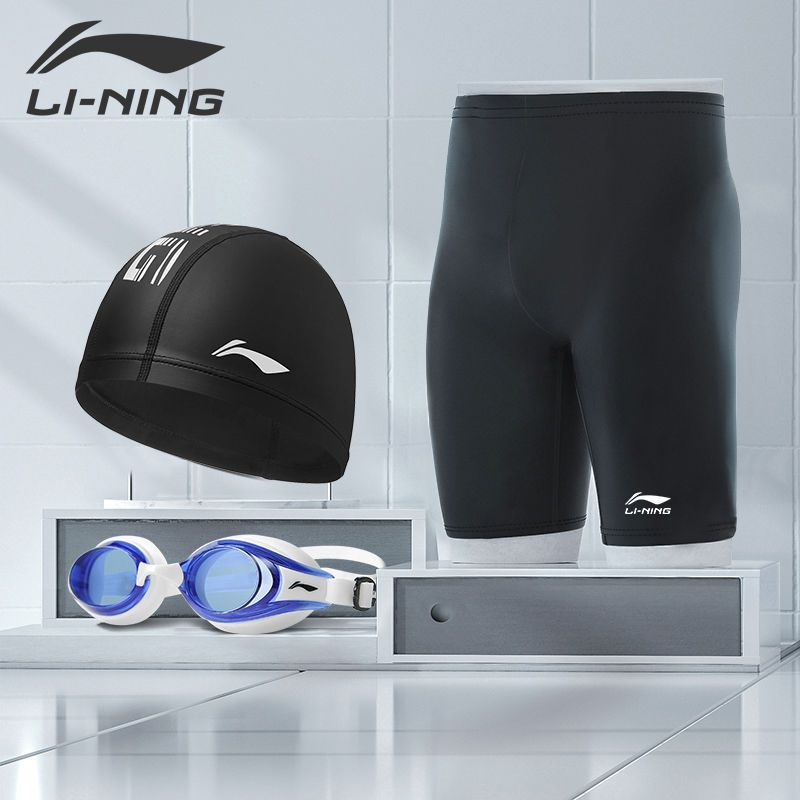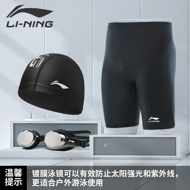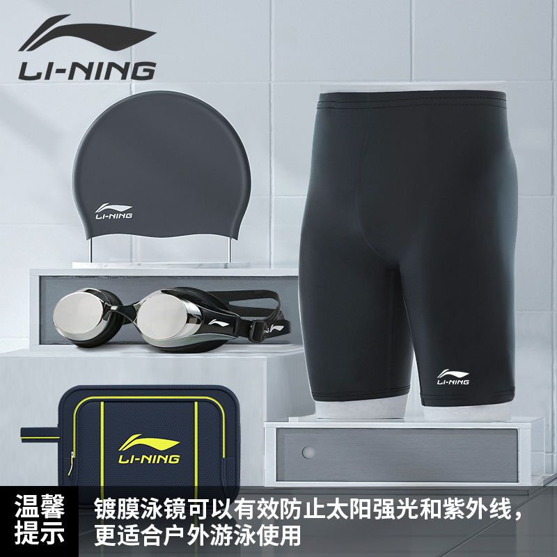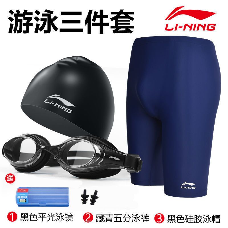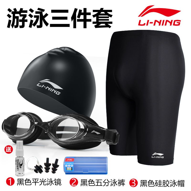 李宁游泳裤男平角裤防尴尬速干五分男士泳衣泳镜泳帽套装大码装备