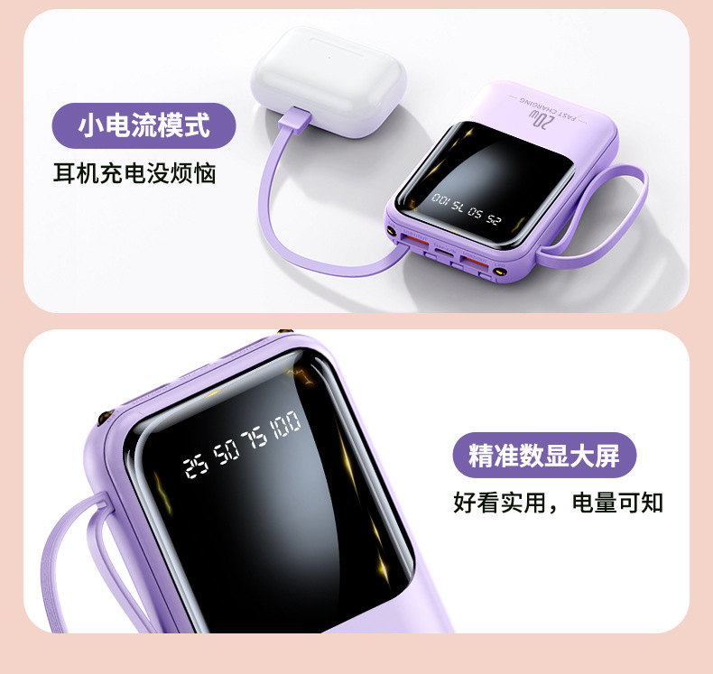 迷你自带线充电宝20000毫安大容量快充便携移动电源礼品定 制批发