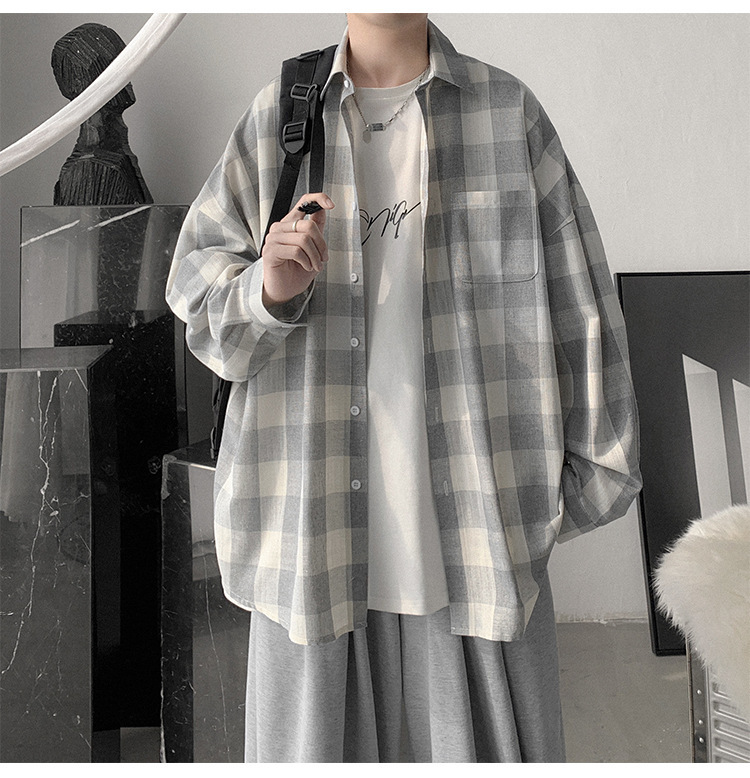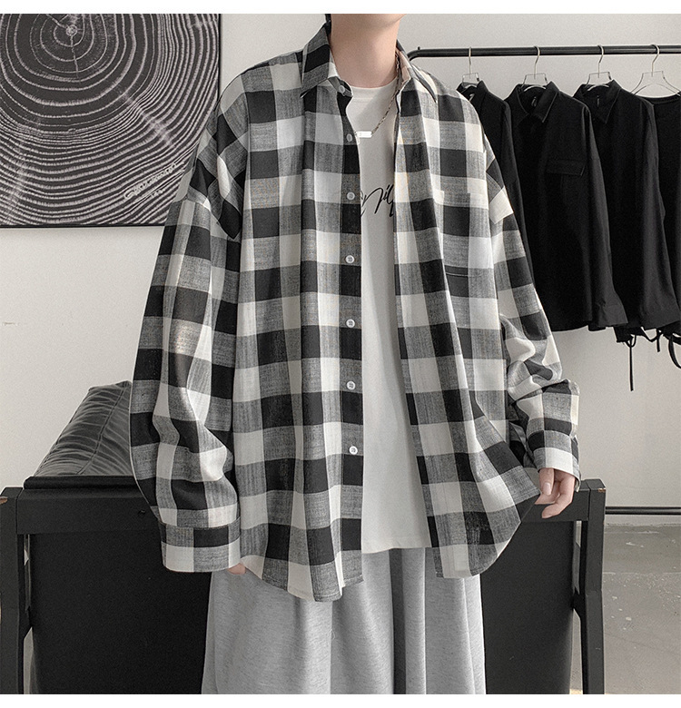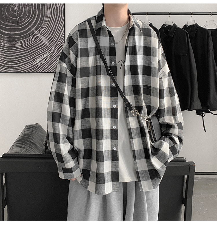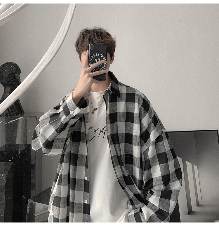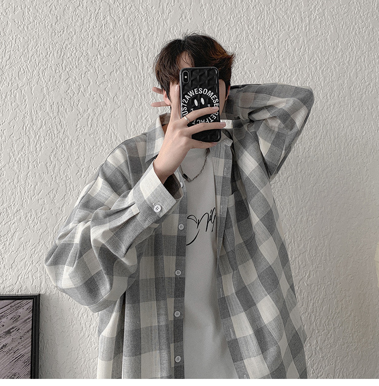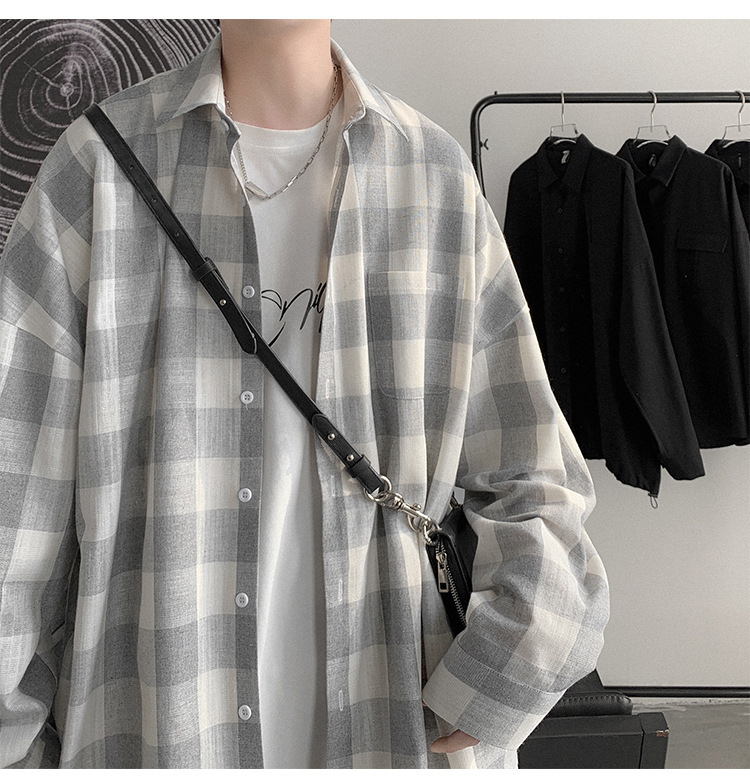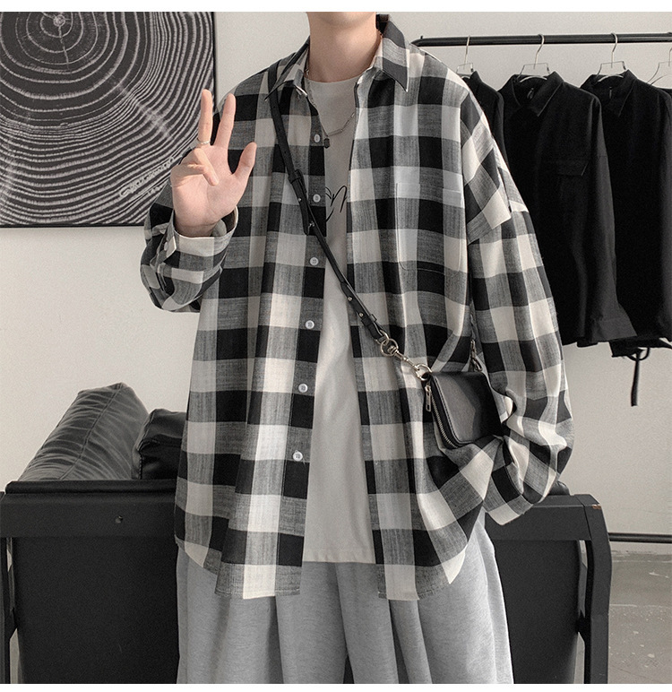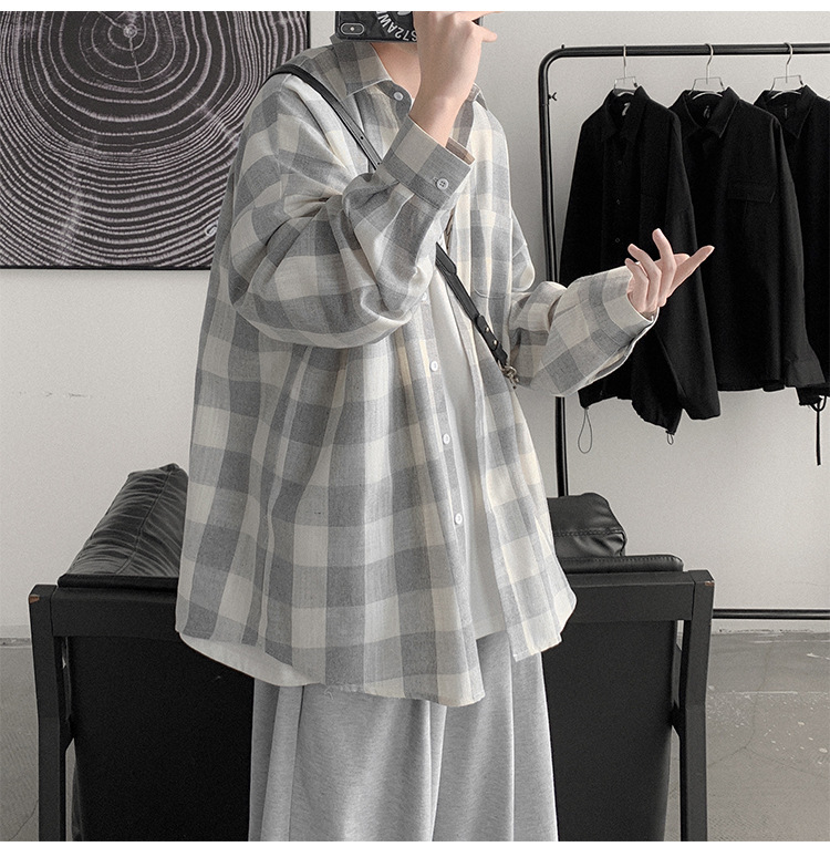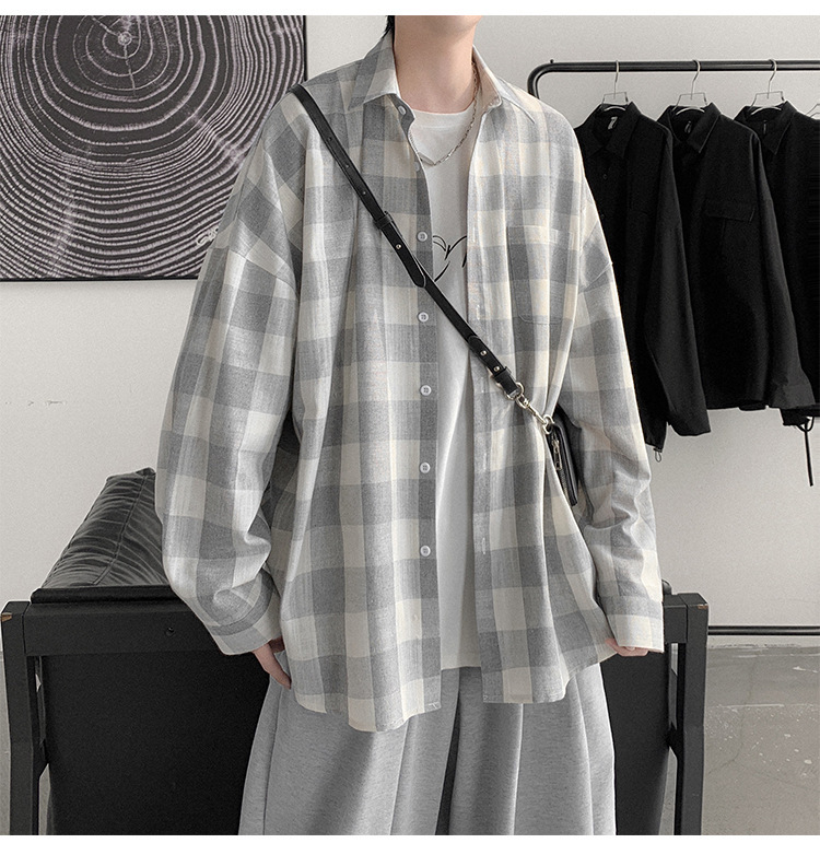 秋季格子衬衫男长袖ins港风痞帅休闲衬衣男韩版设计感寸衫代发