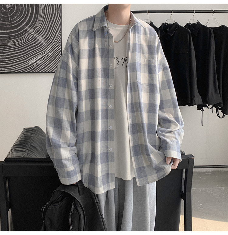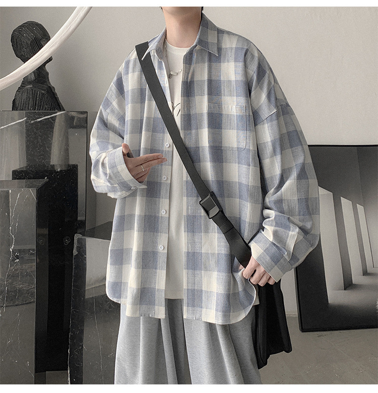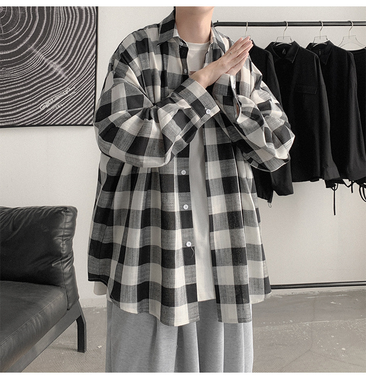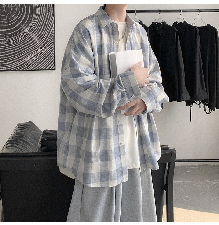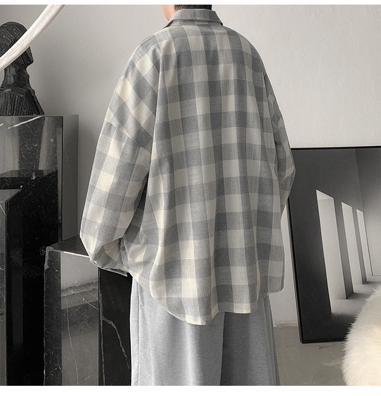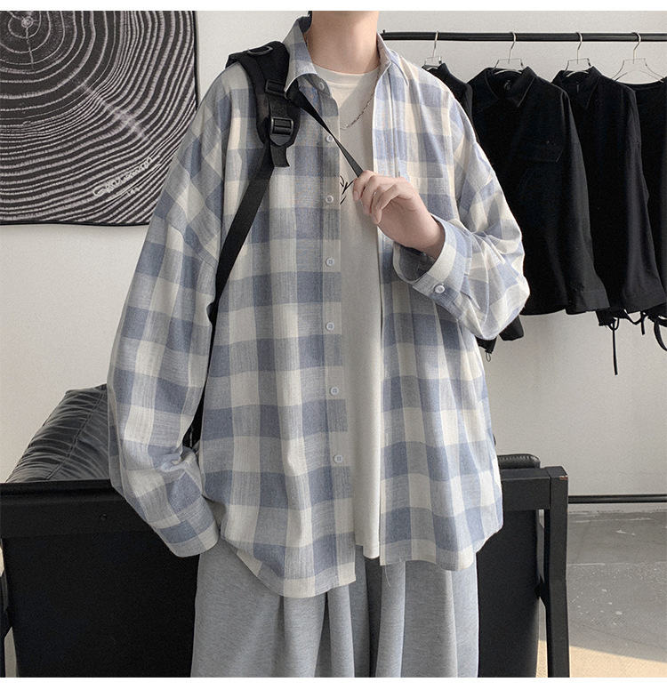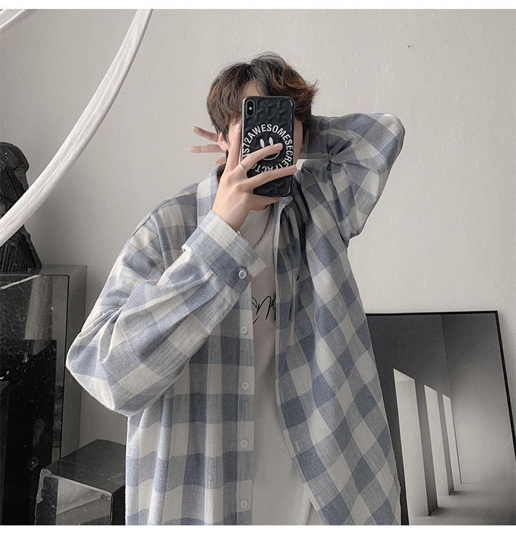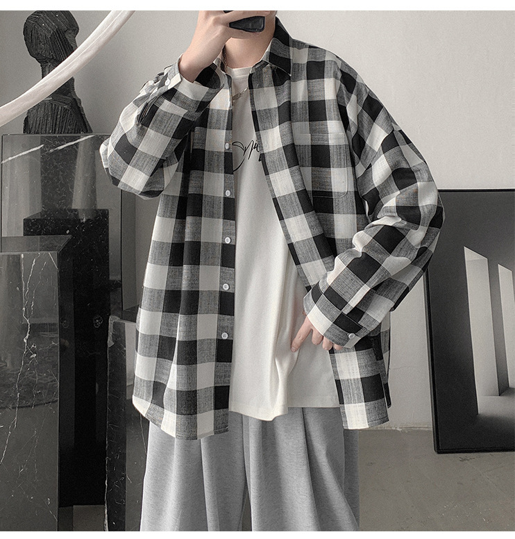 秋季格子衬衫男长袖ins港风痞帅休闲衬衣男韩版设计感寸衫代发