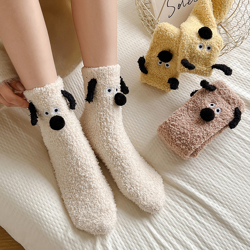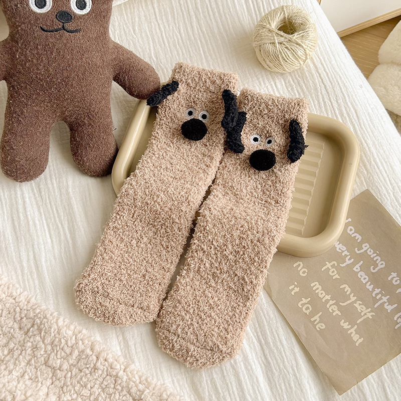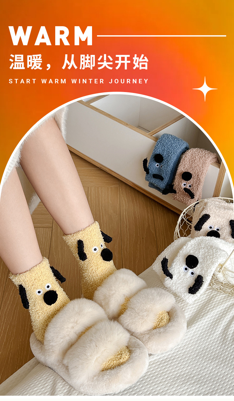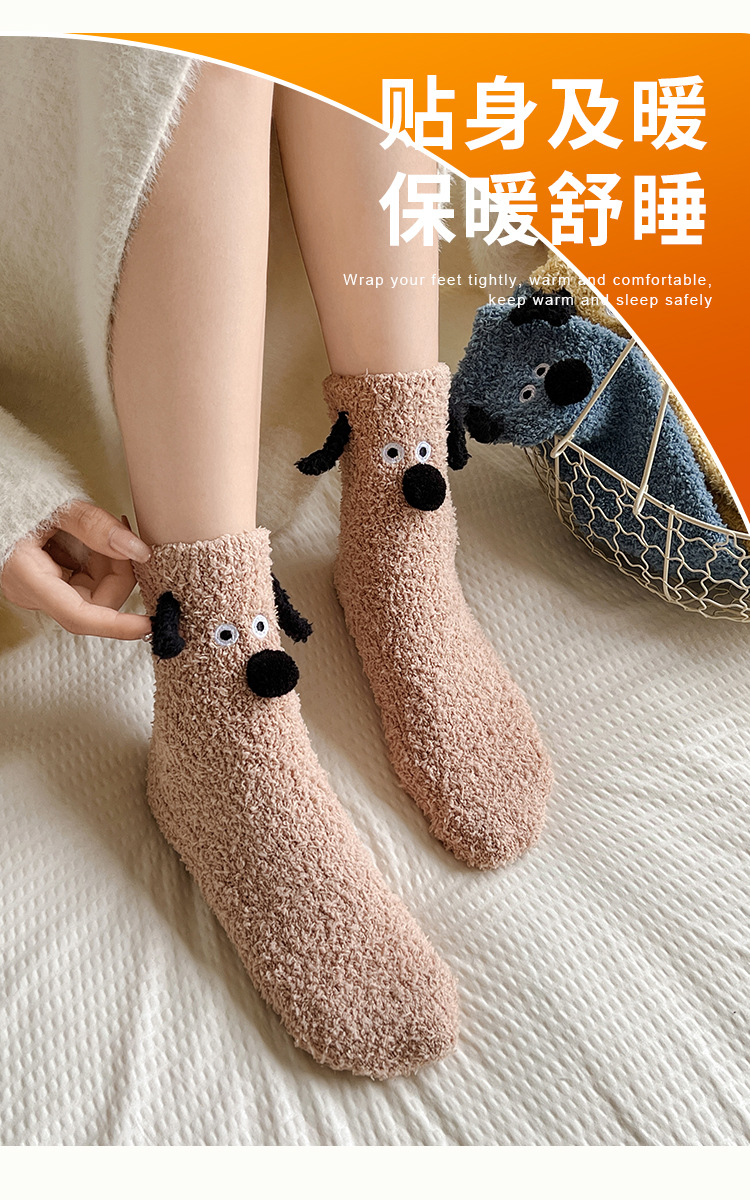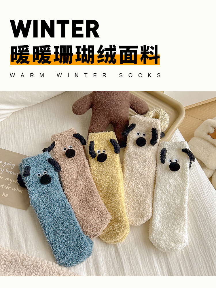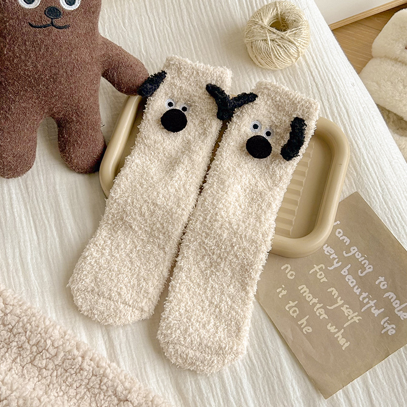秋冬款立体小狗珊瑚绒保暖家居中筒女袜袜子女可爱睡眠长袜