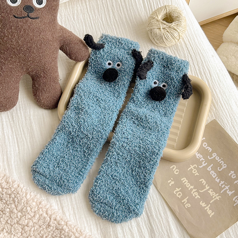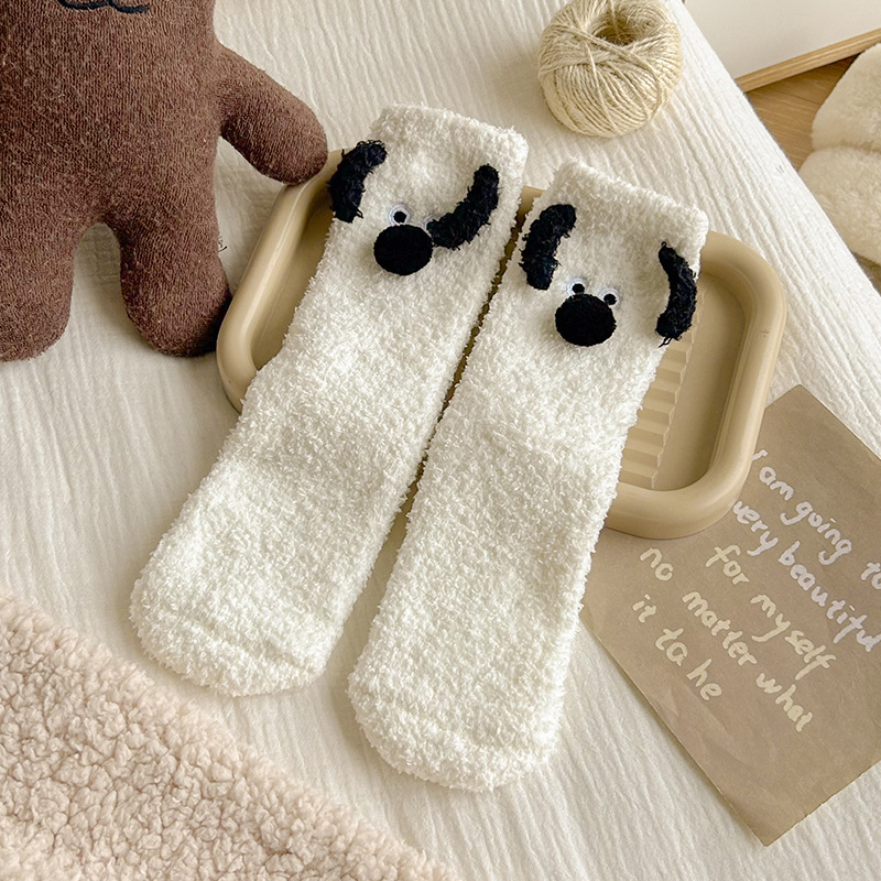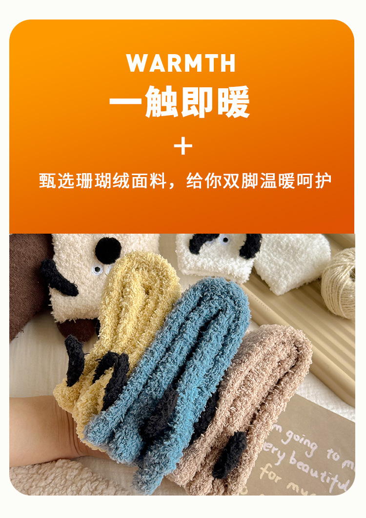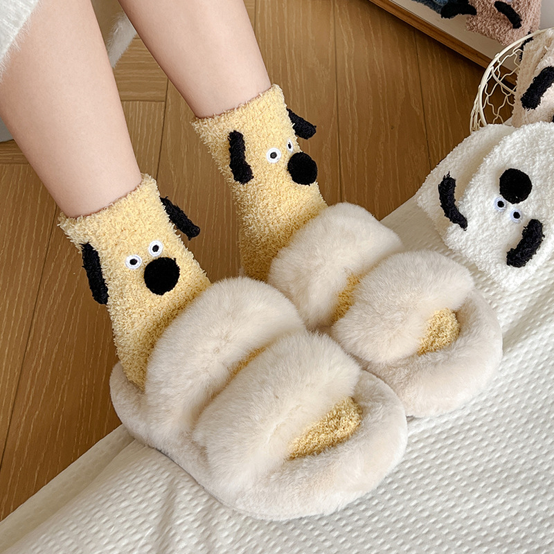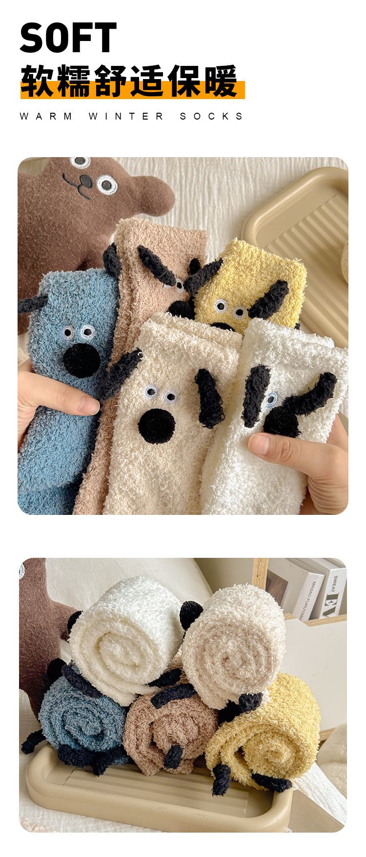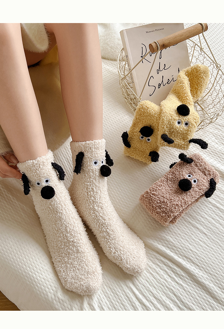 秋冬款立体小狗珊瑚绒保暖家居中筒女袜袜子女可爱睡眠长袜