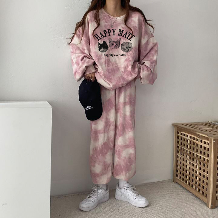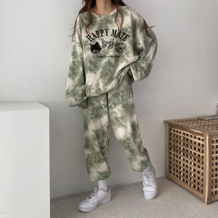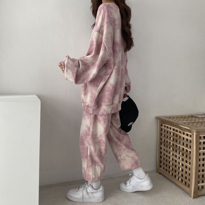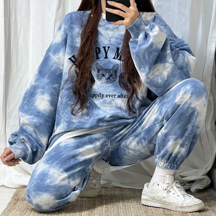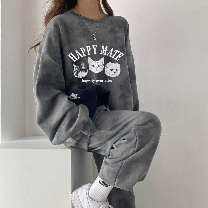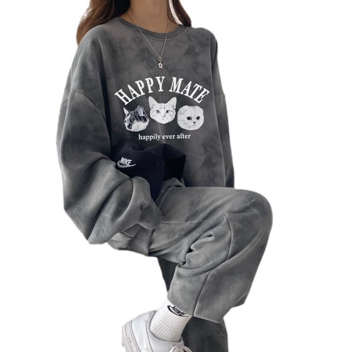 厂家休闲慵懒风运动套装女秋冬美式设计感宽松显瘦拼接卫衣长裤两