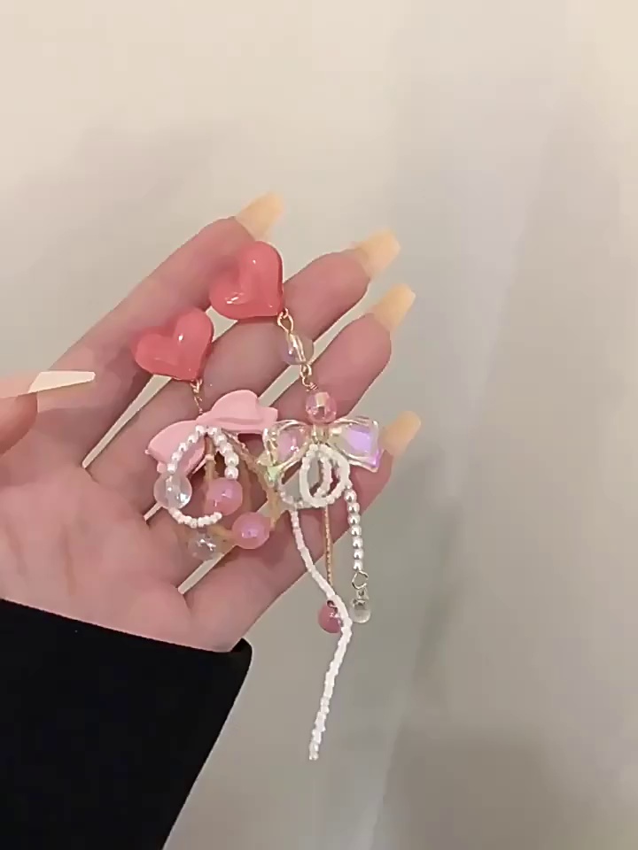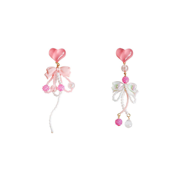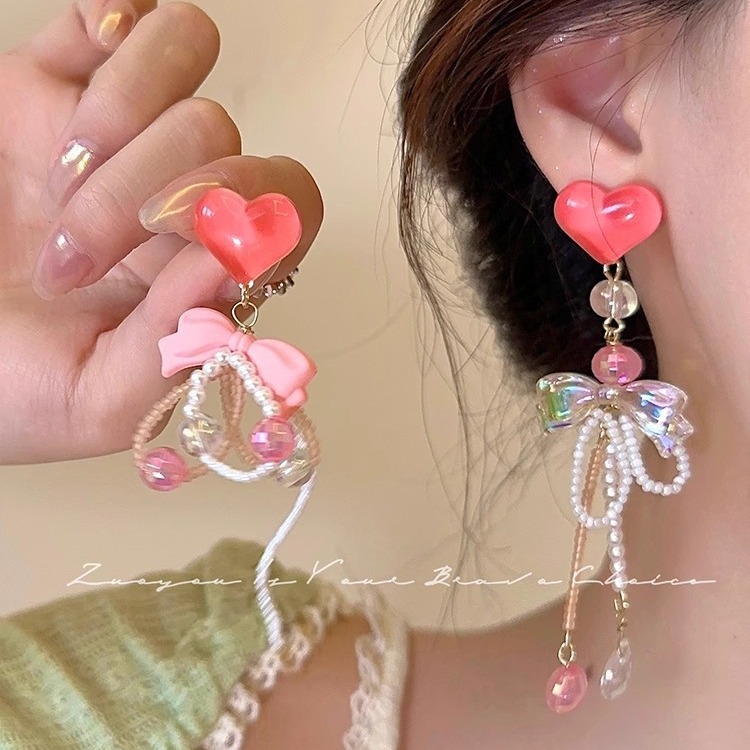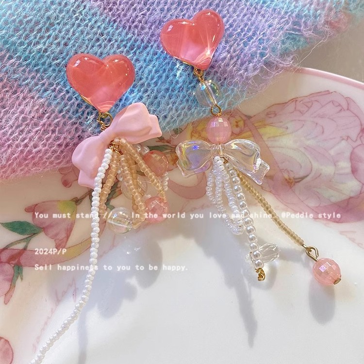 饰品甜美气质长款流苏珍珠耳钉网红耳饰粉色手作蝴蝶结爱心耳环女