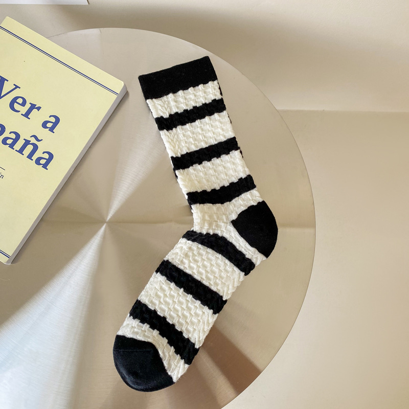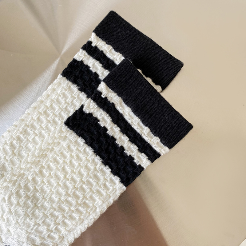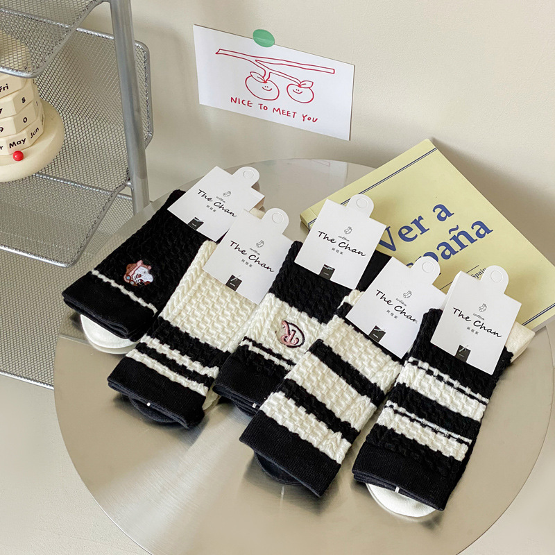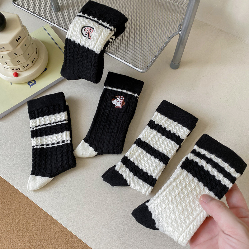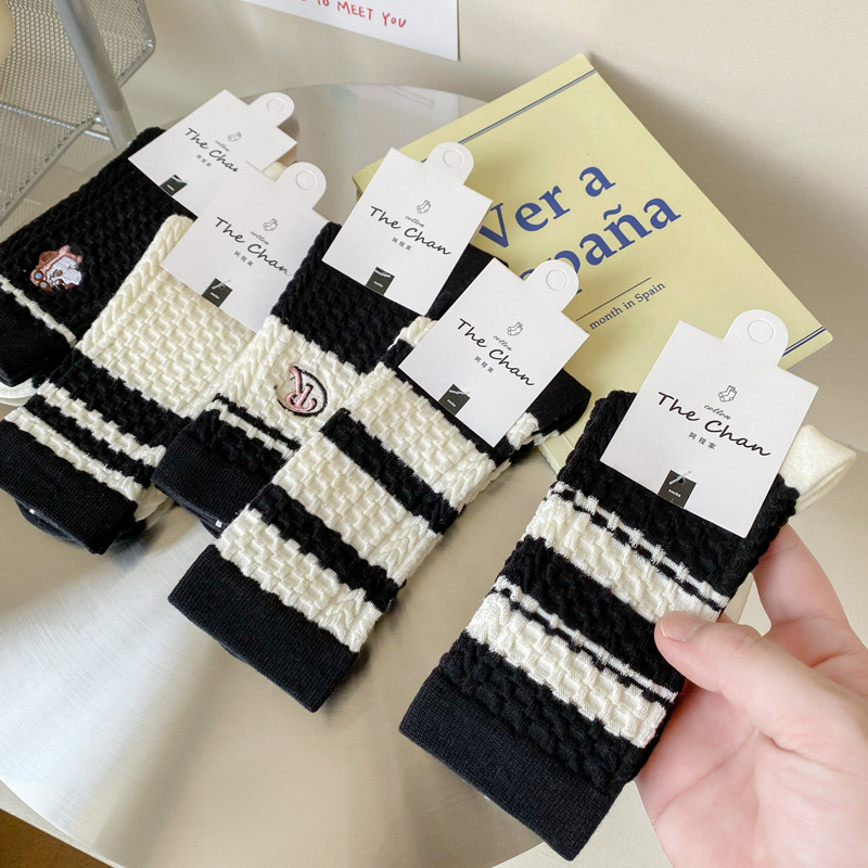 批发黑白条纹女春秋刺绣中筒袜波浪纹棉ins潮泡泡口堆堆袜