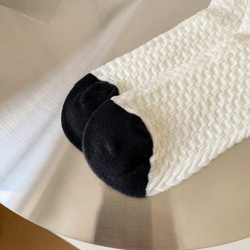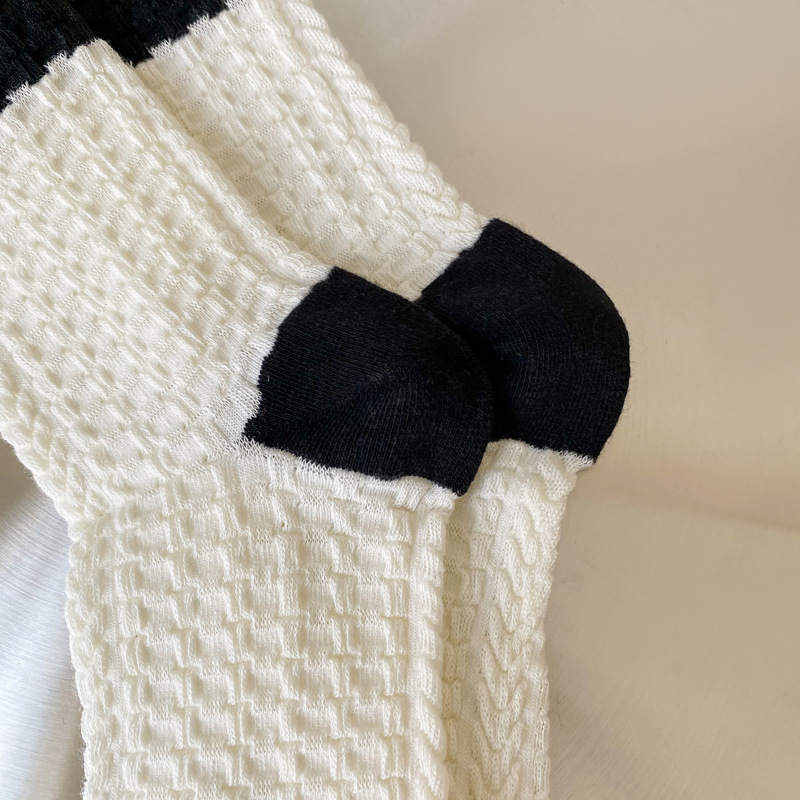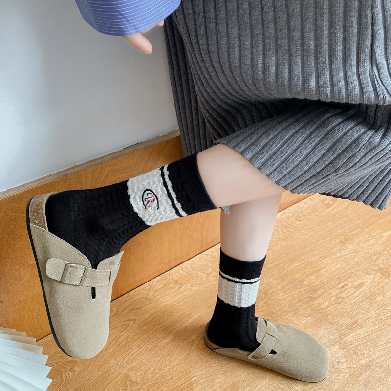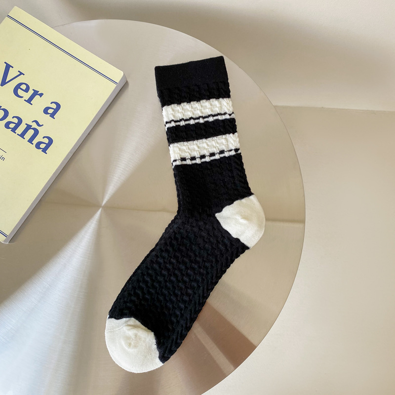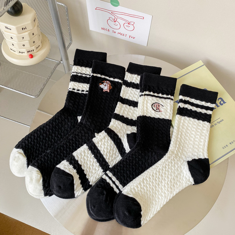 批发黑白条纹女春秋刺绣中筒袜波浪纹棉ins潮泡泡口堆堆袜