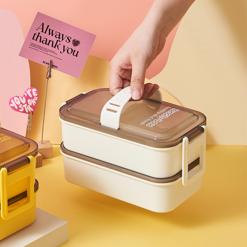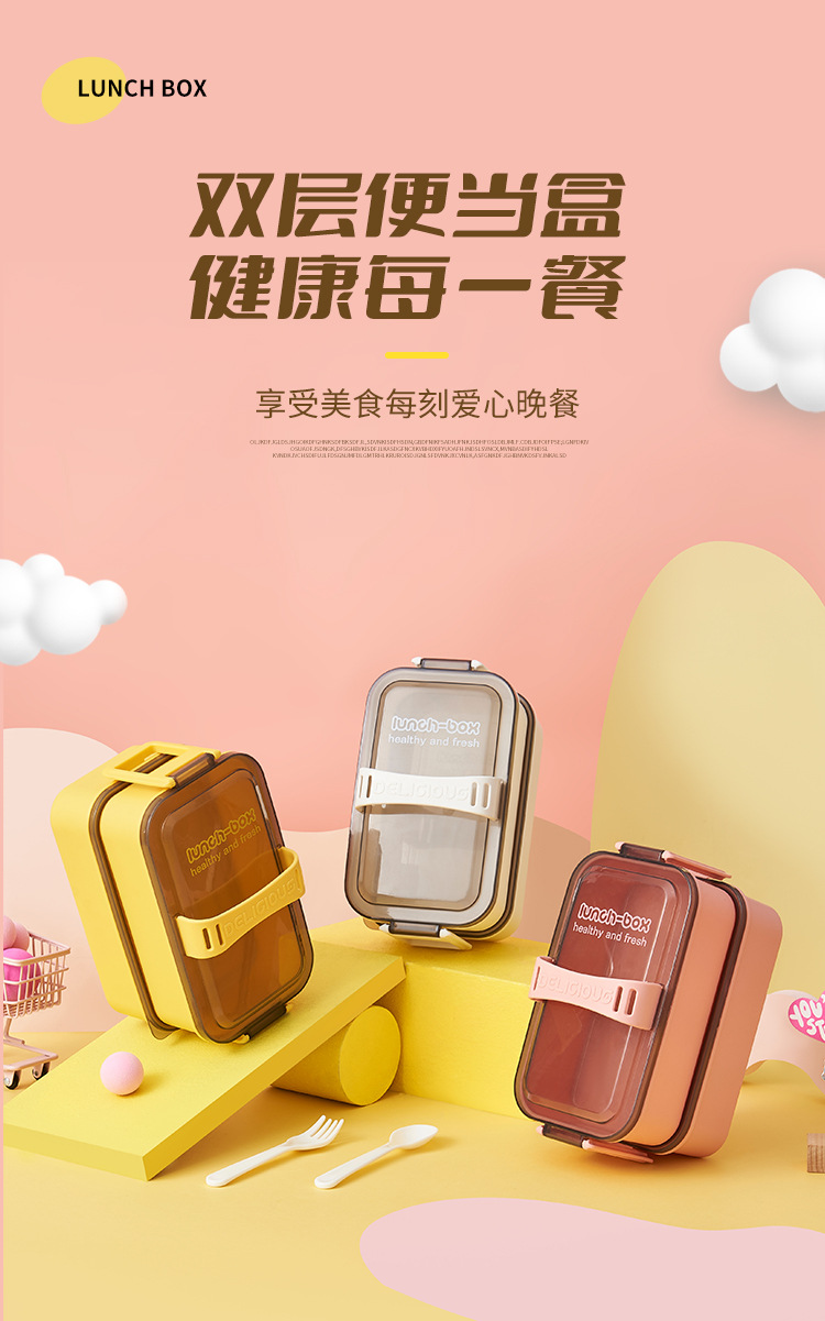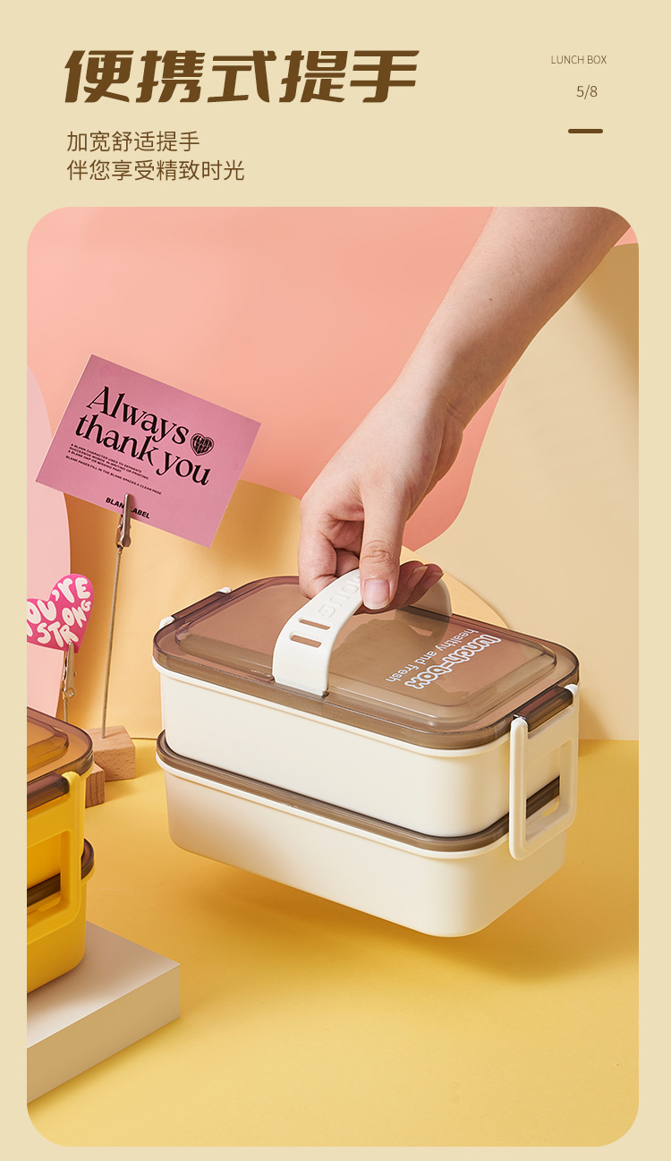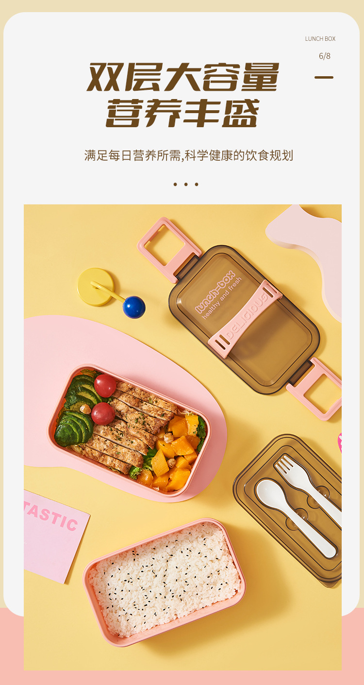 含餐具简约便携饭盒 双层分格塑料密封便当盒 食品级上班学生餐盒