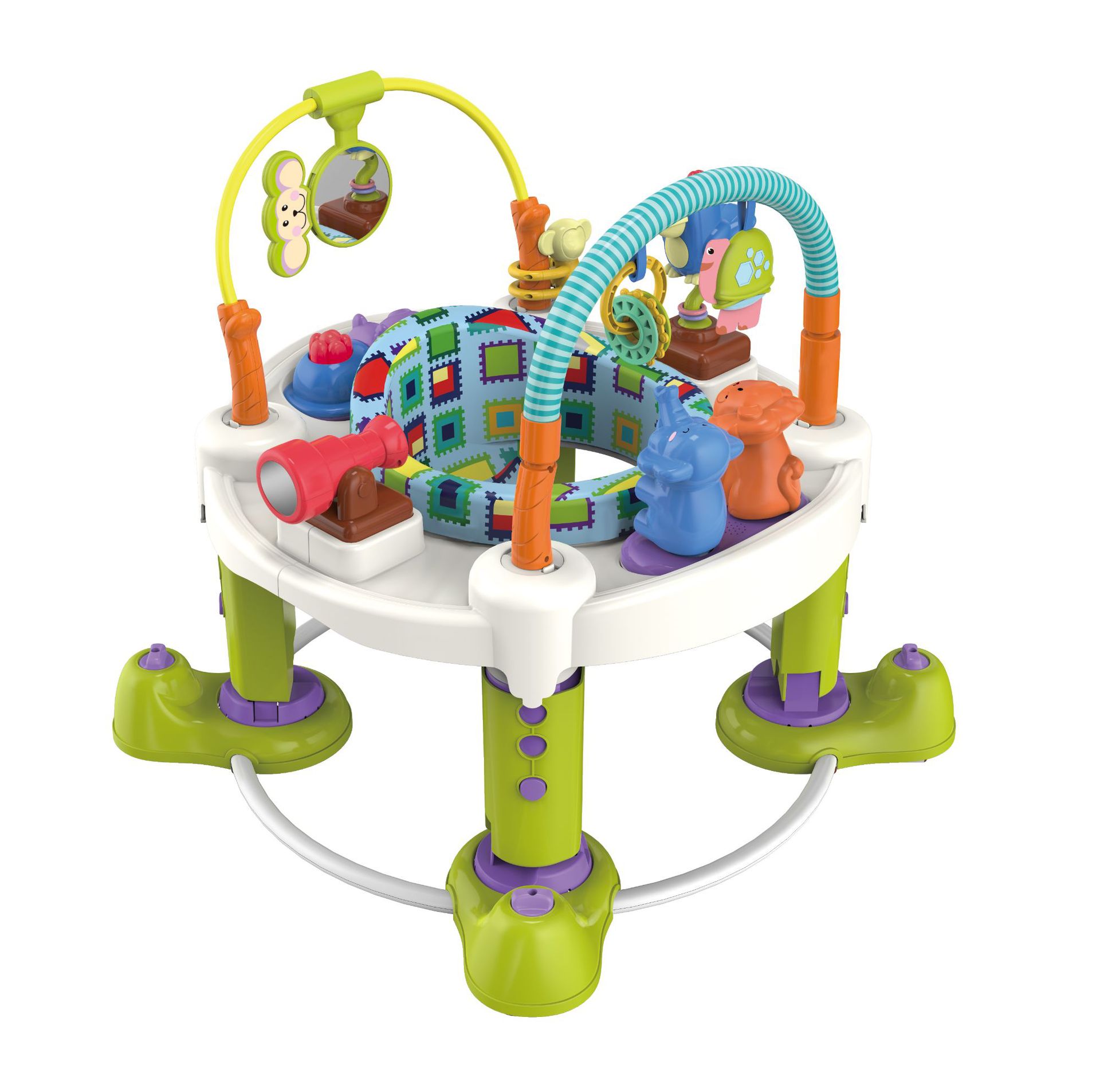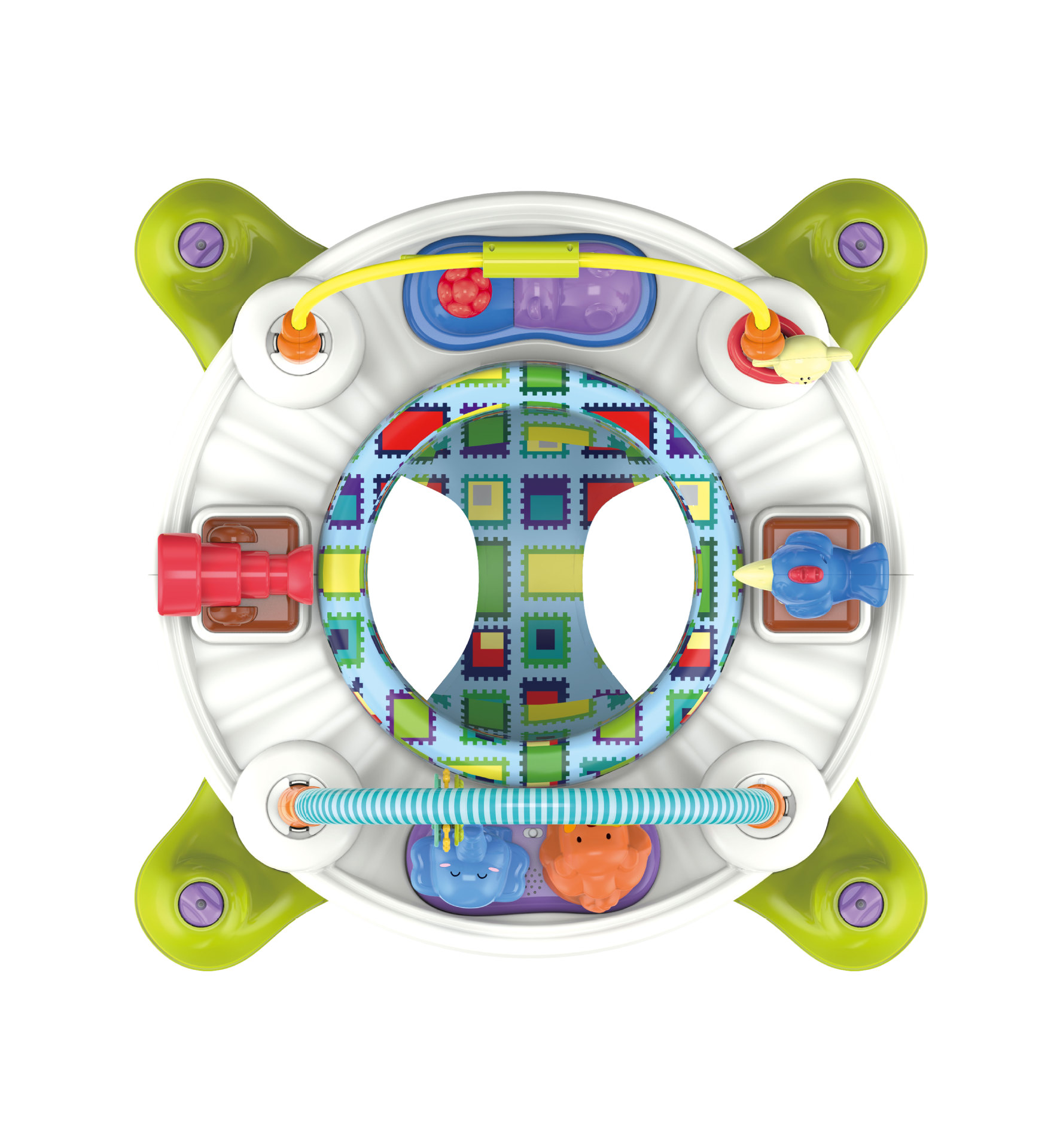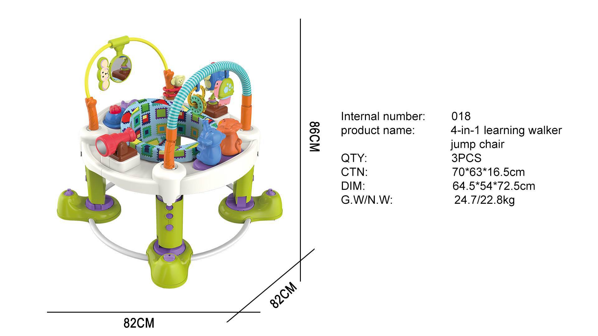 多功能能坐跳合一;三档调节高度,可以旋转的360度旋转座椅,布垫可以拆卸清洗;多种可玩玩具:大象和狮子音乐盒;望远镜;鹦鹉;河马;带两个挂件的游戏杆;带镜片的猴子游戏杆;三档高度调节,随着孩子高度的变化,可以简单调节支撑柱,延长宝宝使用时间;固定或移动模式随意转换,合理利用轮子上方的四组固定装置,可以将椅子变化为游戏桌或者学步车;凸出的的防撞脚给宝宝一个安全的距离;跳椅可以折叠结构,不占空间更方便;