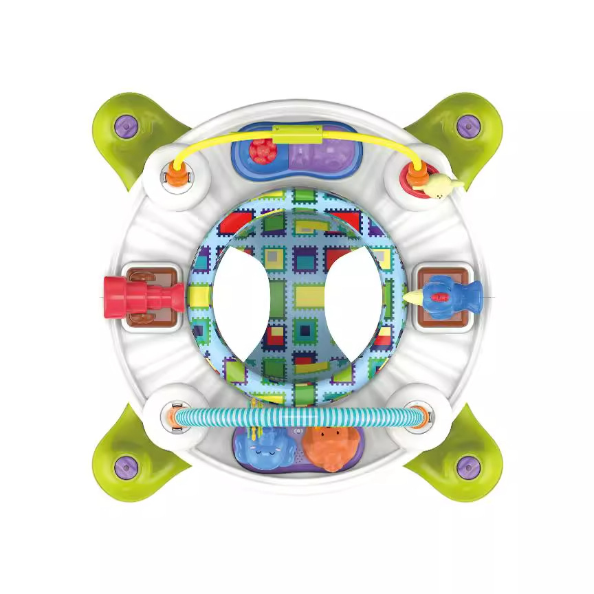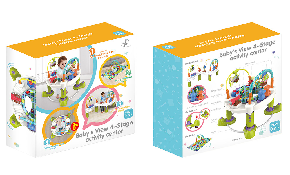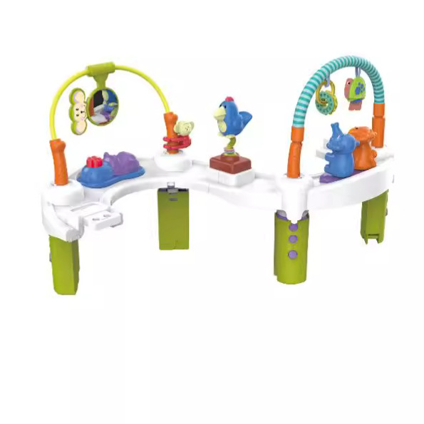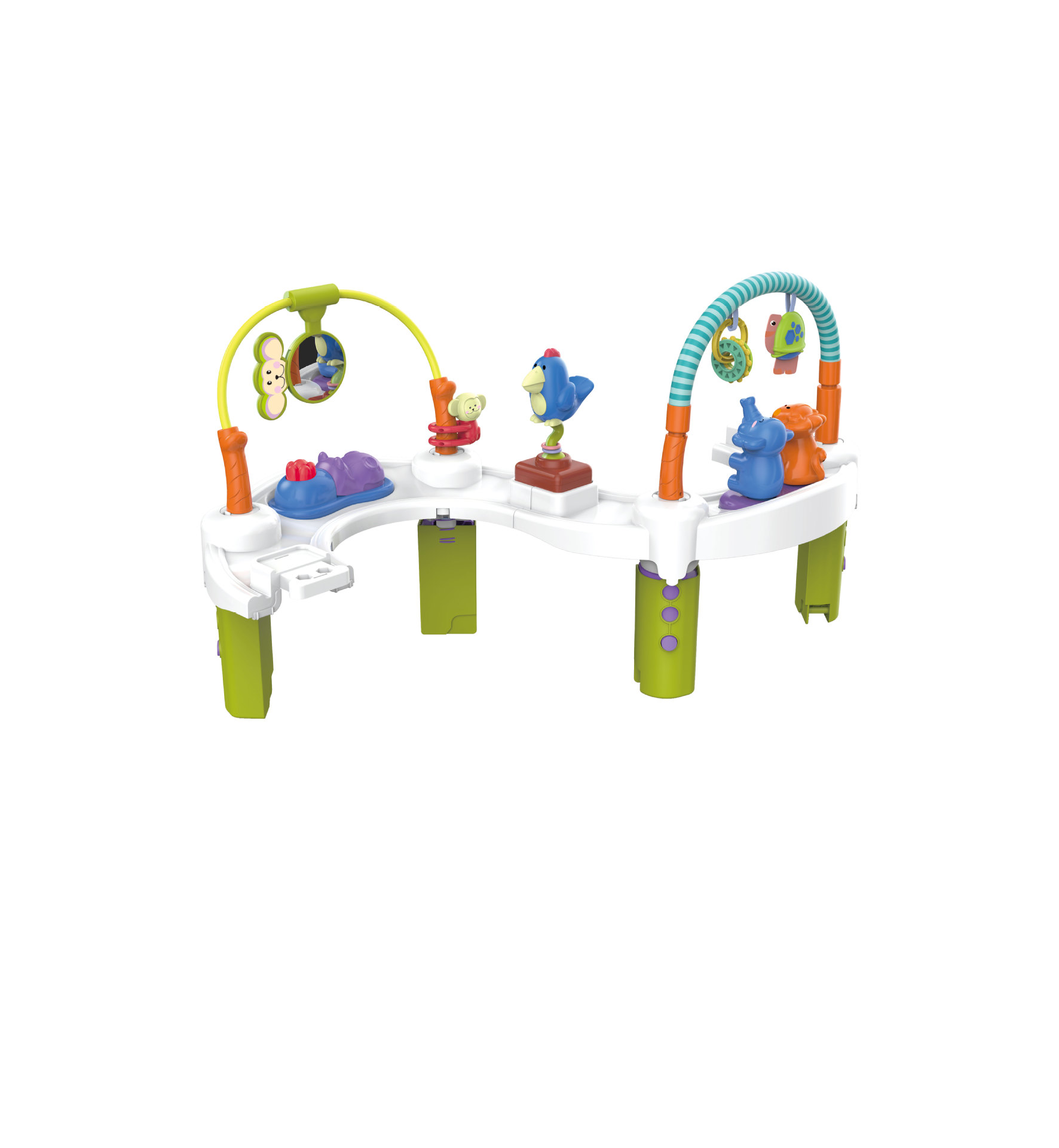 多功能能坐跳合一;三档调节高度,可以旋转的360度旋转座椅,布垫可以拆卸清洗;多种可玩玩具:大象和狮子音乐盒;望远镜;鹦鹉;河马;带两个挂件的游戏杆;带镜片的猴子游戏杆;三档高度调节,随着孩子高度的变化,可以简单调节支撑柱,延长宝宝使用时间;固定或移动模式随意转换,合理利用轮子上方的四组固定装置,可以将椅子变化为游戏桌或者学步车;凸出的的防撞脚给宝宝一个安全的距离;跳椅可以折叠结构,不占空间更方便;
