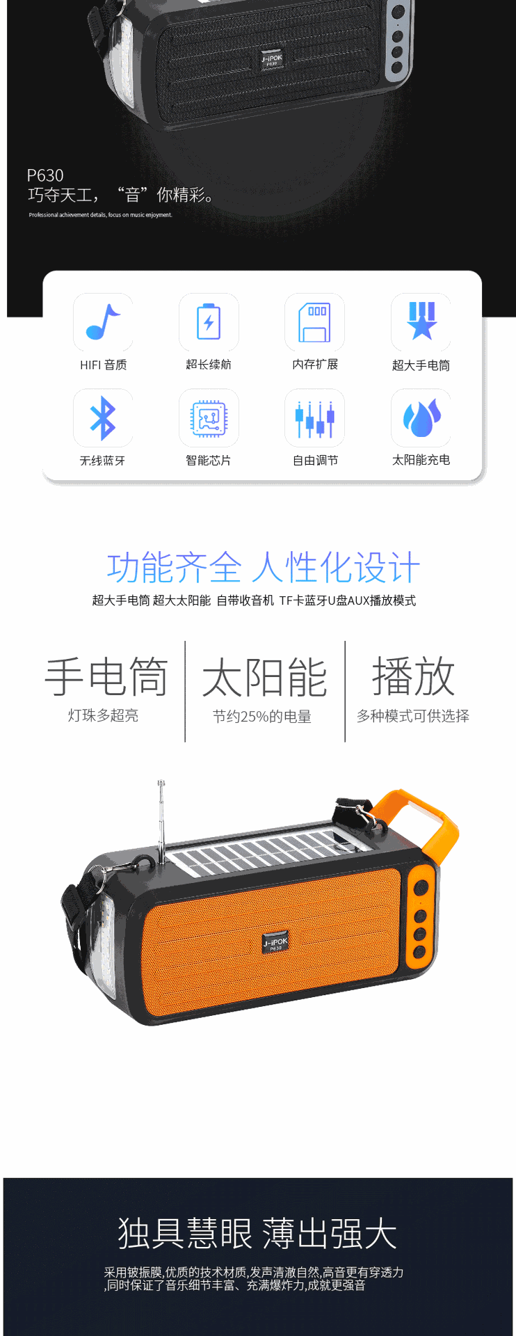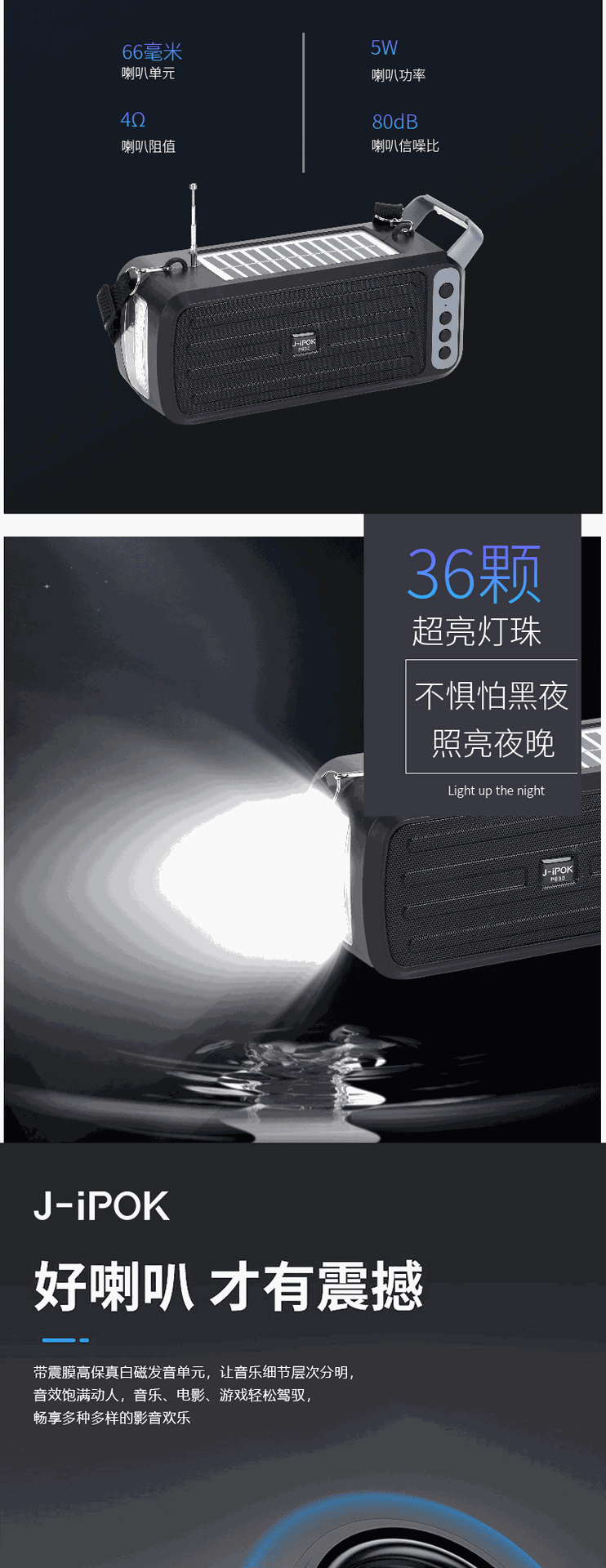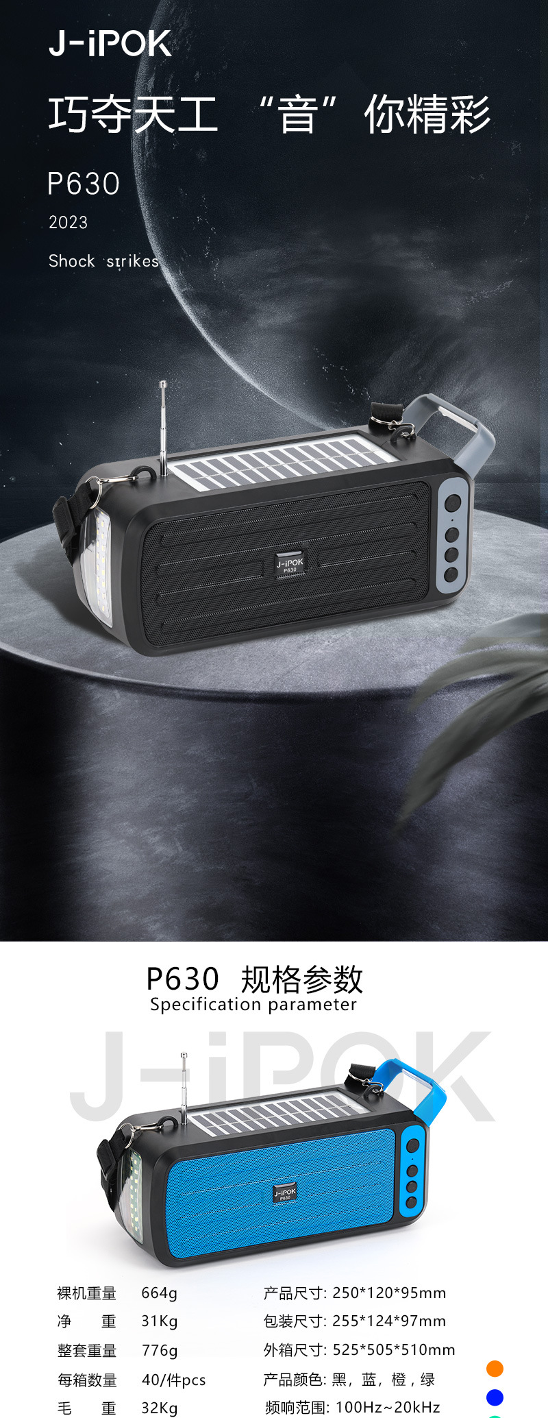 J-iPOK P630跨境便携式音箱太阳能手电筒多功能户外无线蓝牙音响