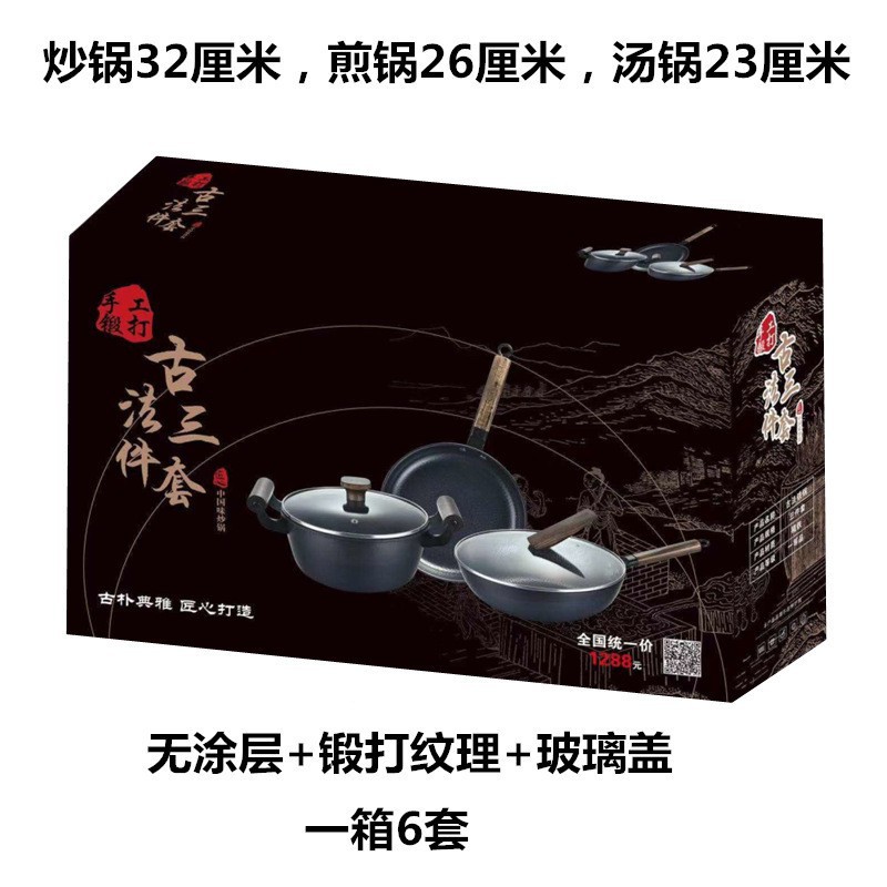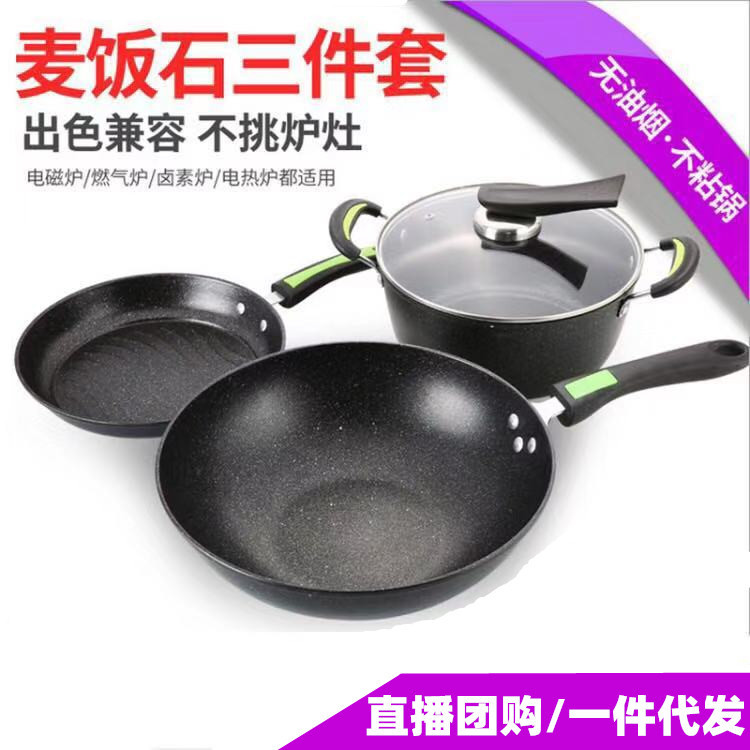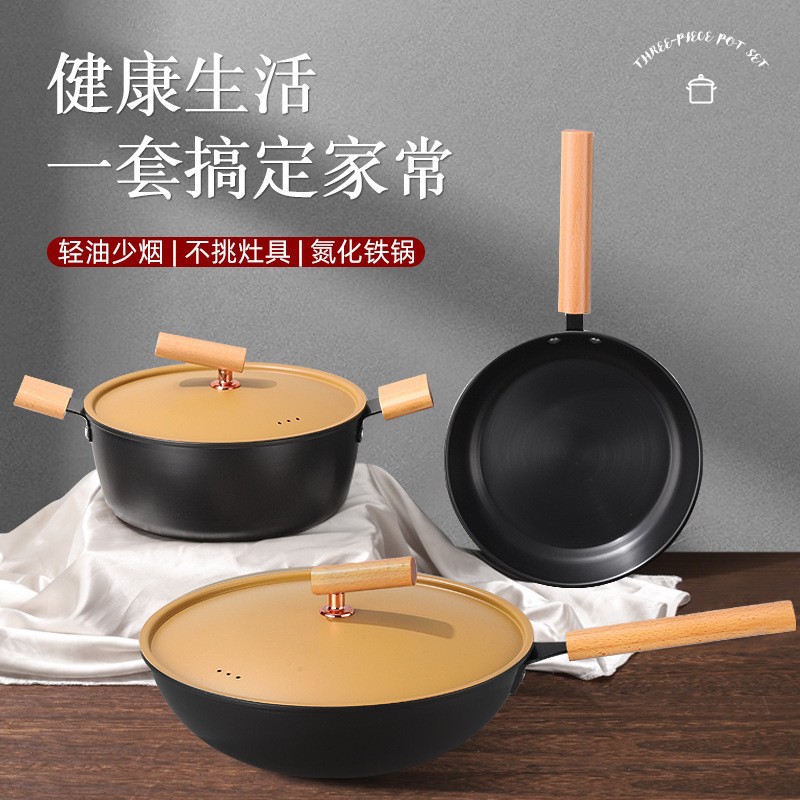 轻奢北欧白麦饭石炒锅三件套家用锅具套装平底锅汤锅煎锅商务礼品
