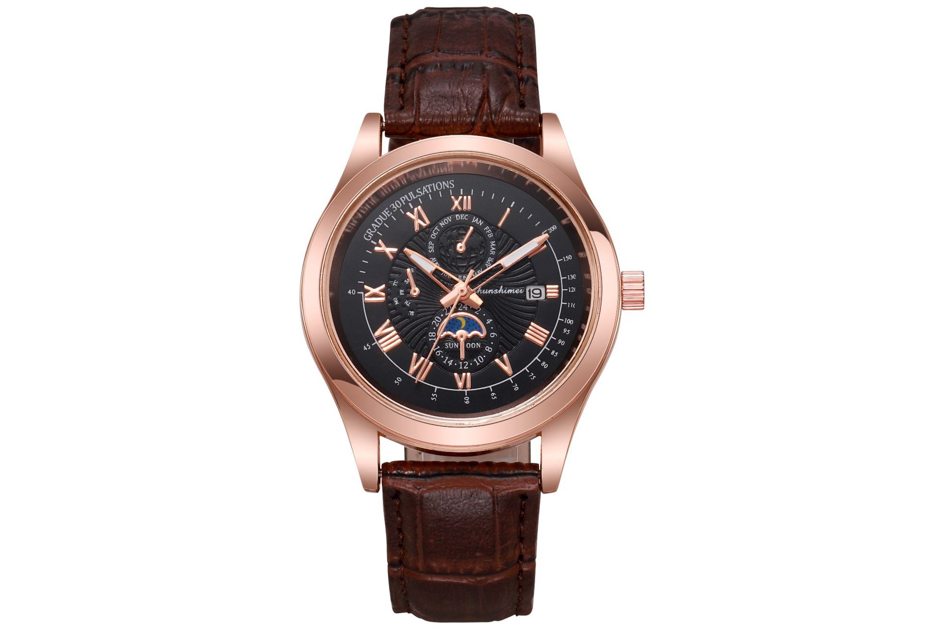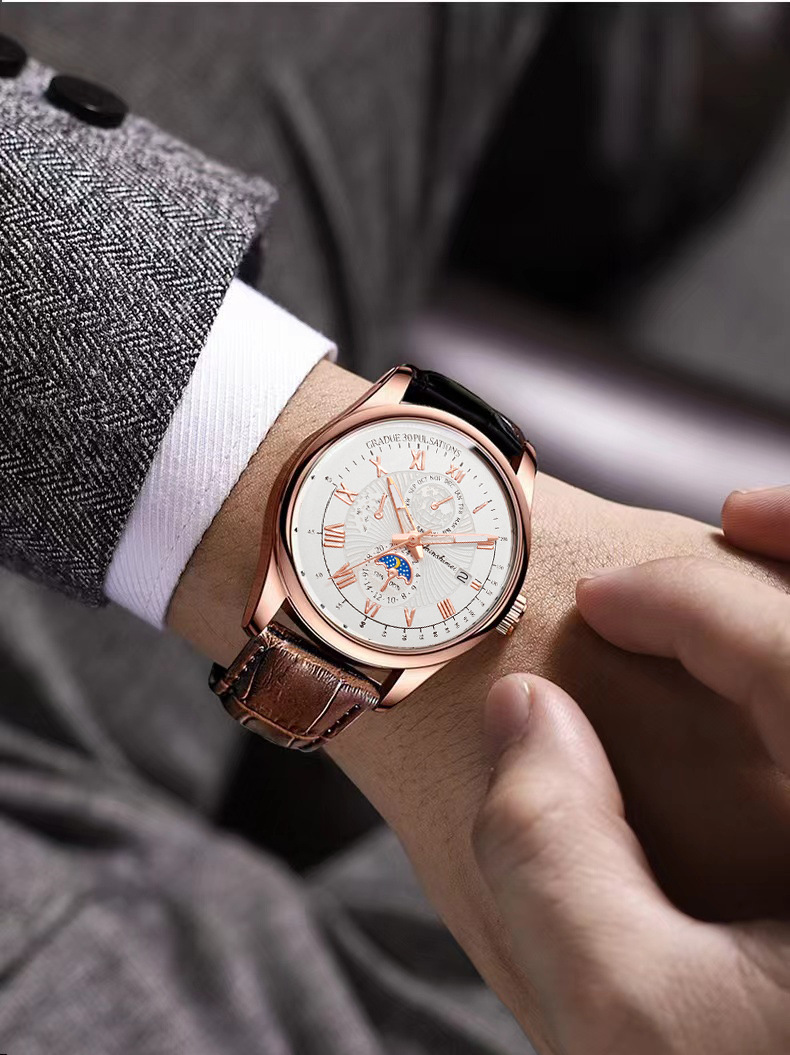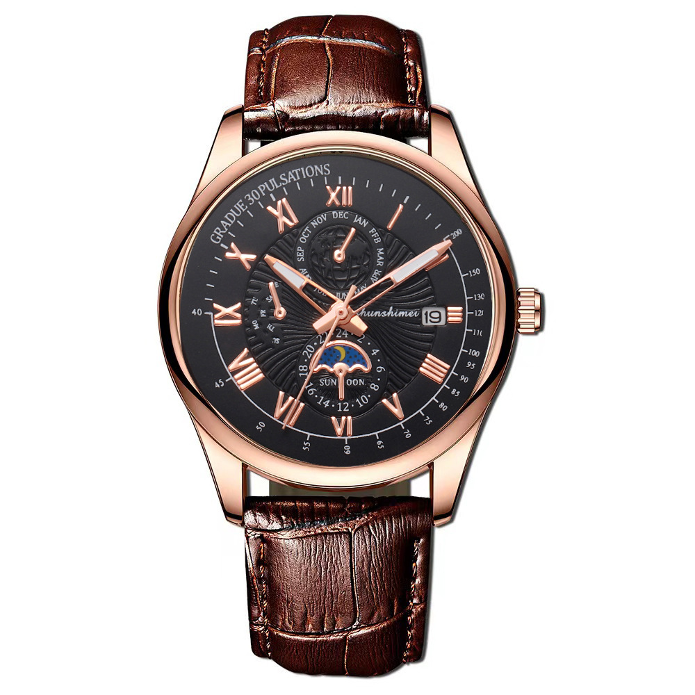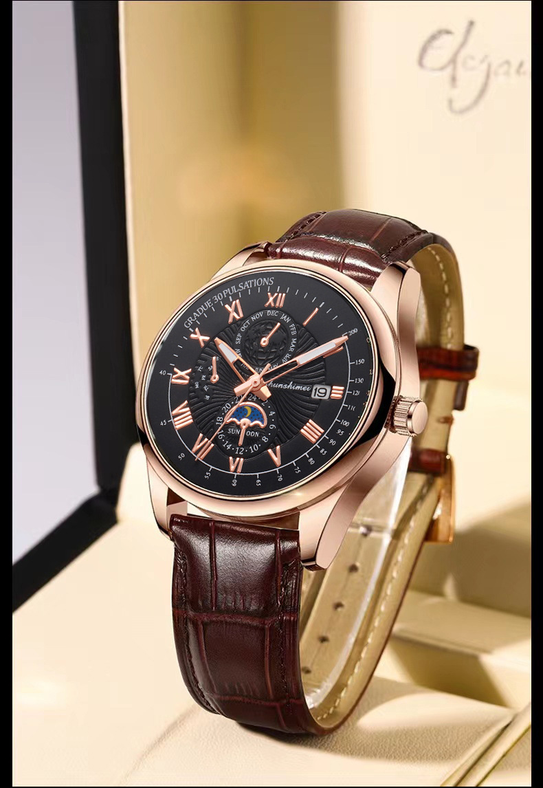 夜光男士商务手表 蓝光玻璃假三眼罗马数字皮带 日历石英腕表男款