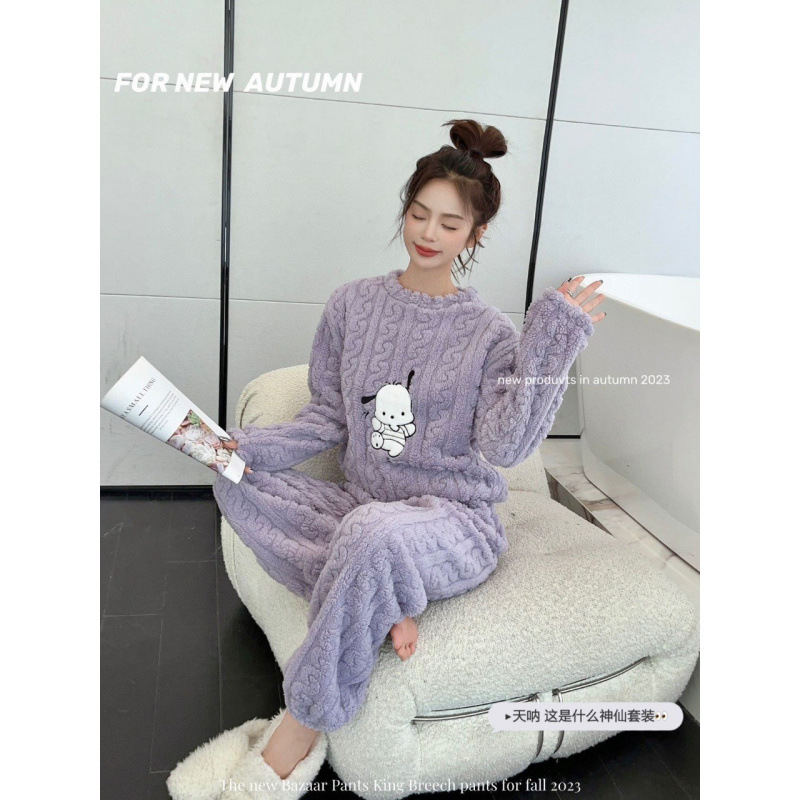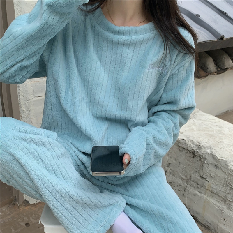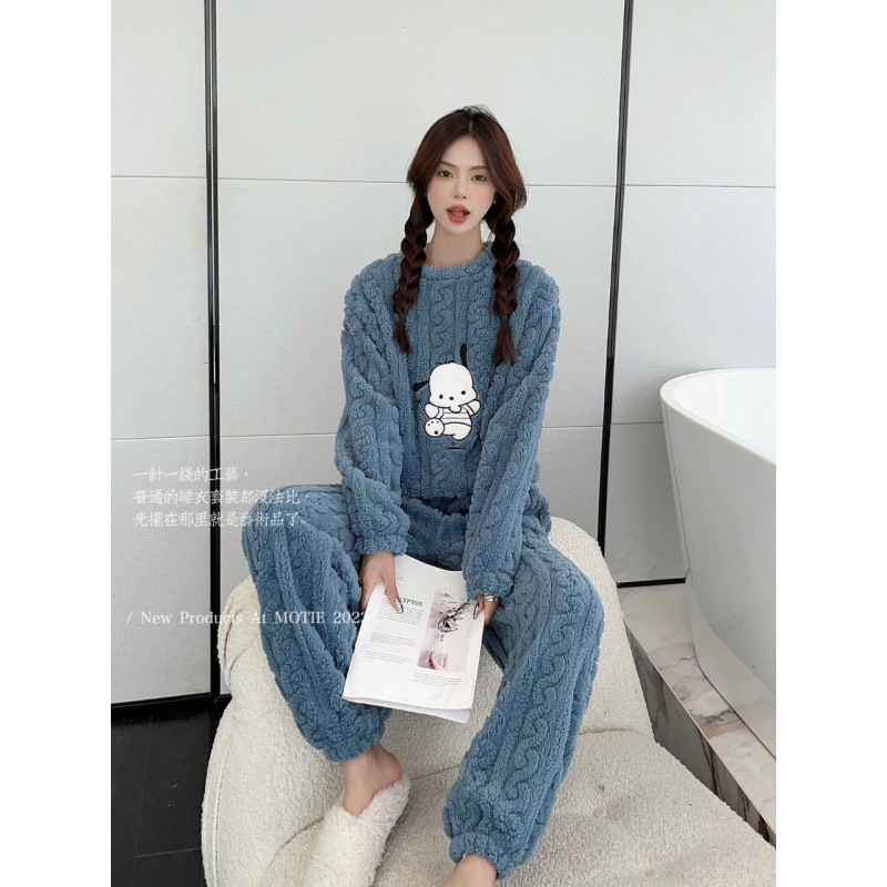 珊瑚绒睡衣女冬天加厚外穿可爱法兰绒家居服时尚宽松长款开衫套装