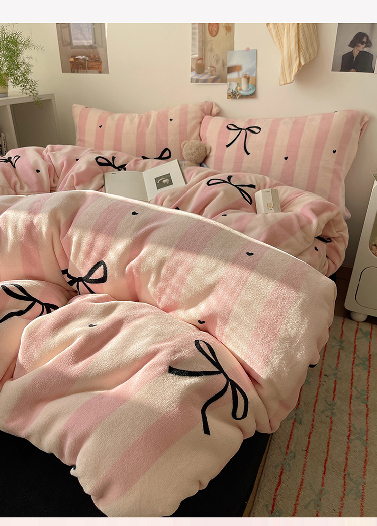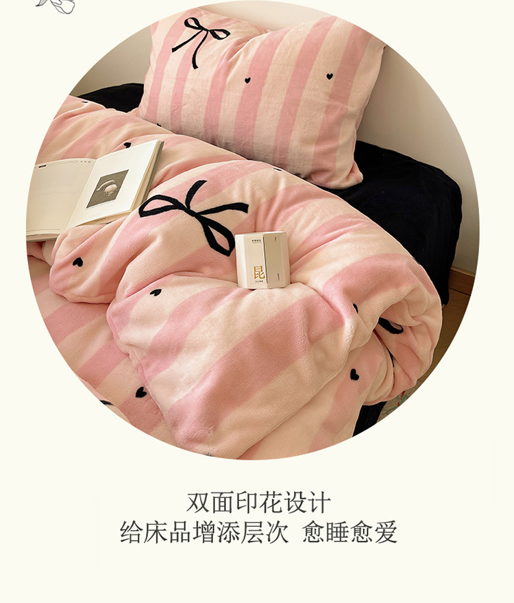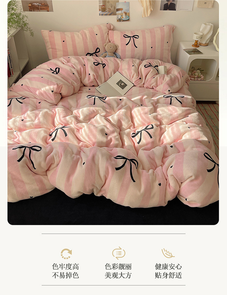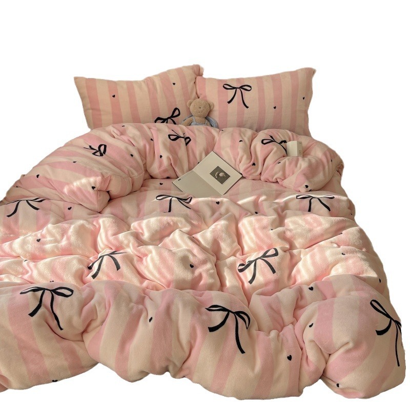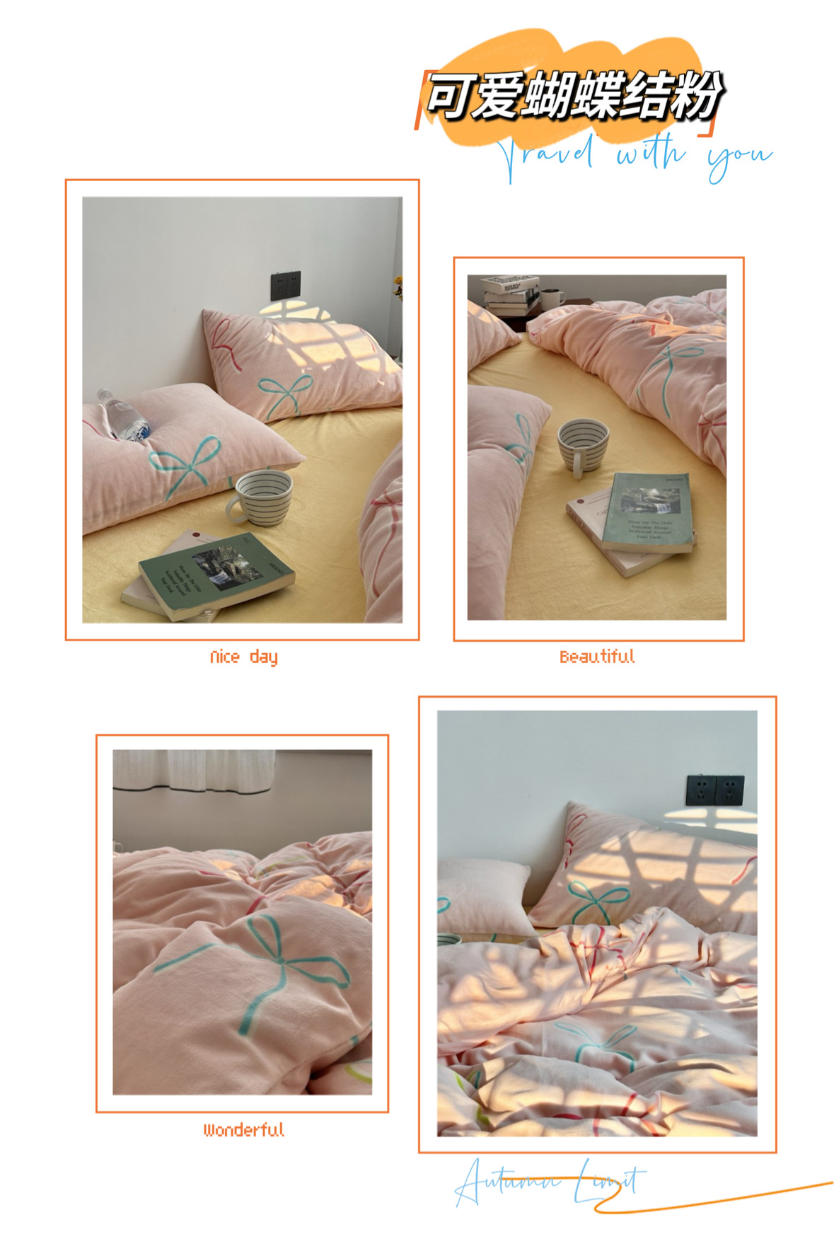 床上用品牛奶绒四件套冬季保暖小红爆款书粉色蝴蝶结被套床单