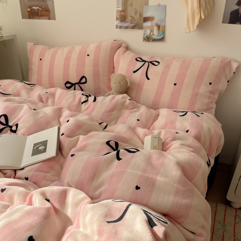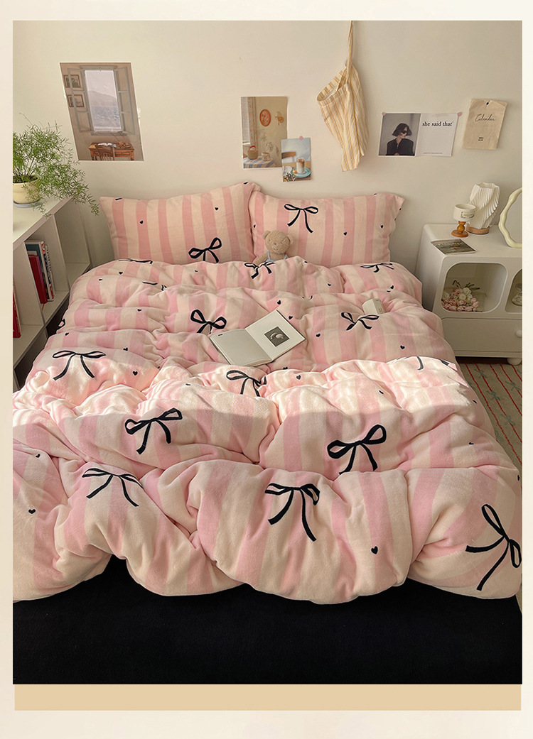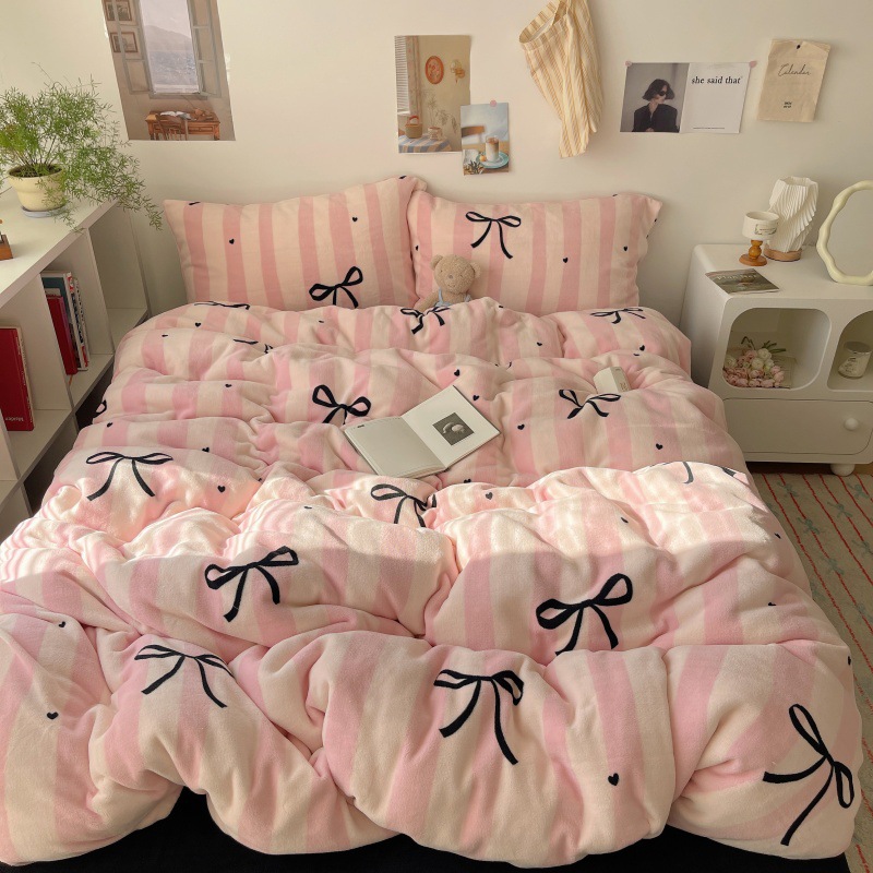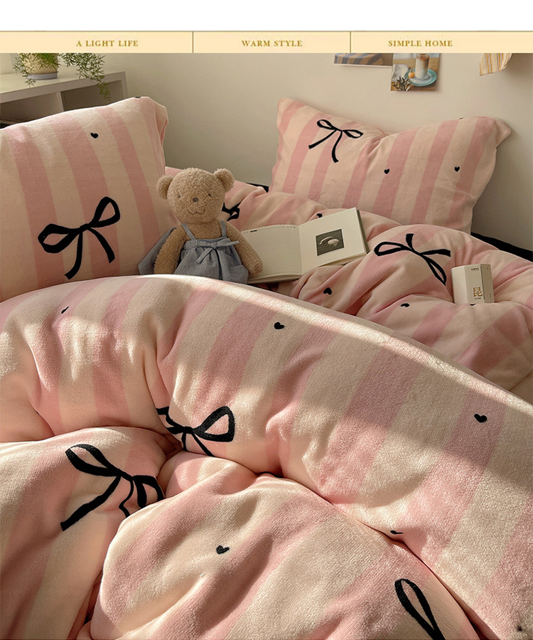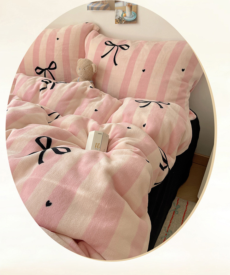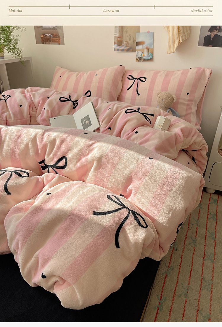 床上用品牛奶绒四件套冬季保暖小红爆款书粉色蝴蝶结被套床单