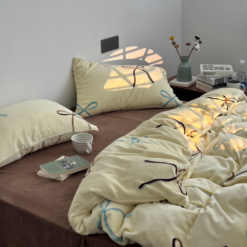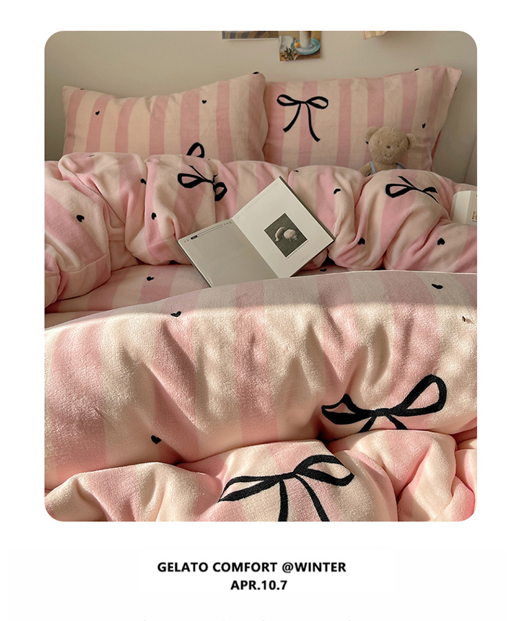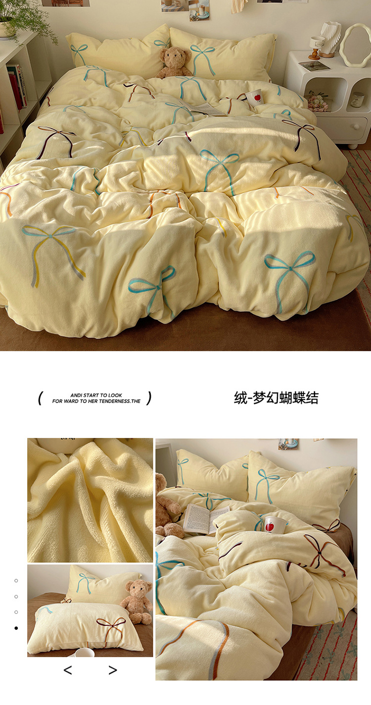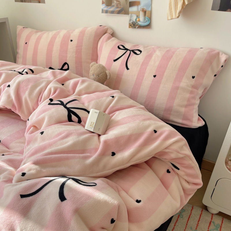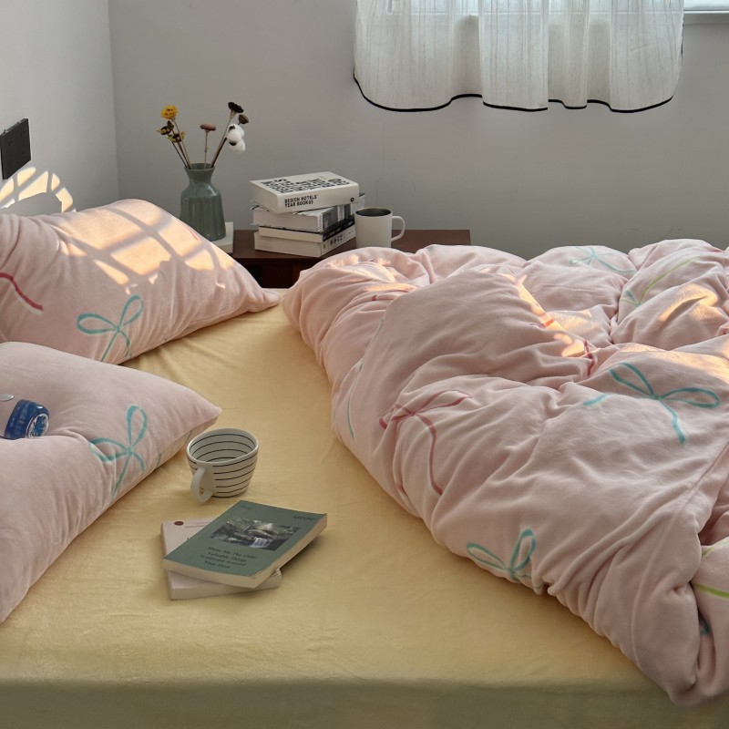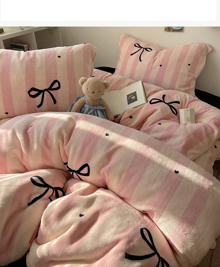 床上用品牛奶绒四件套冬季保暖小红爆款书粉色蝴蝶结被套床单