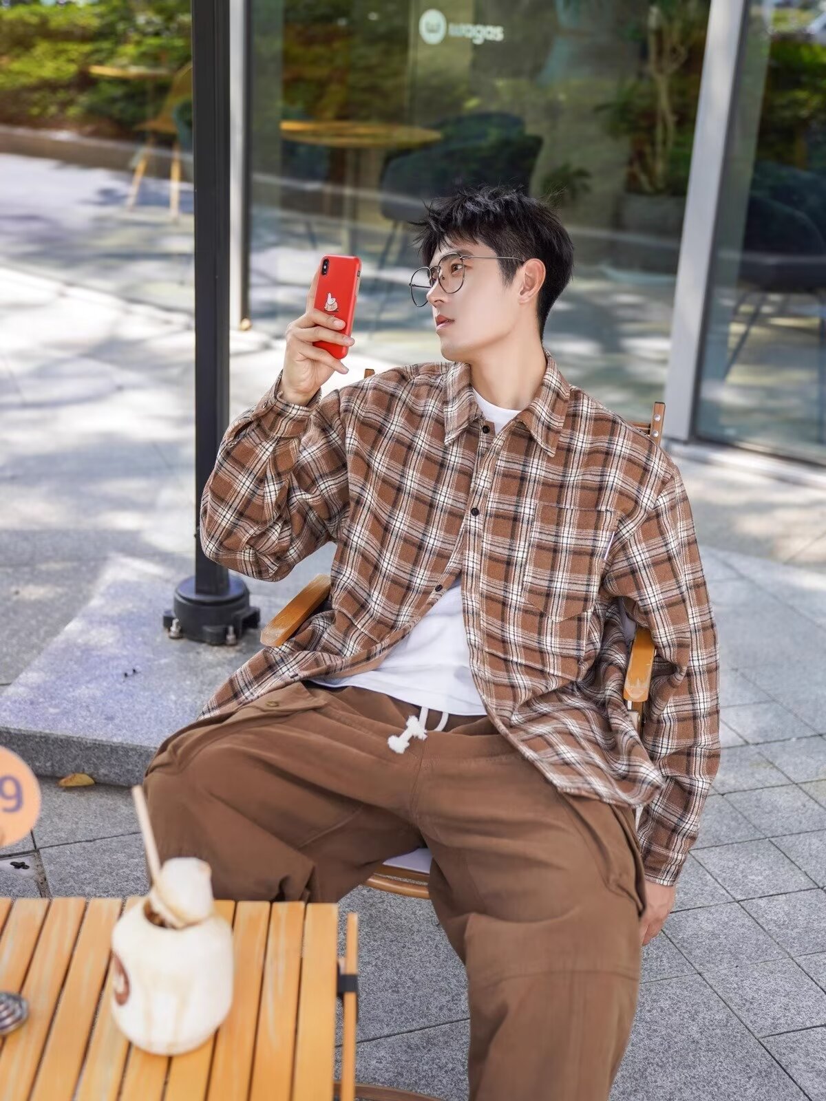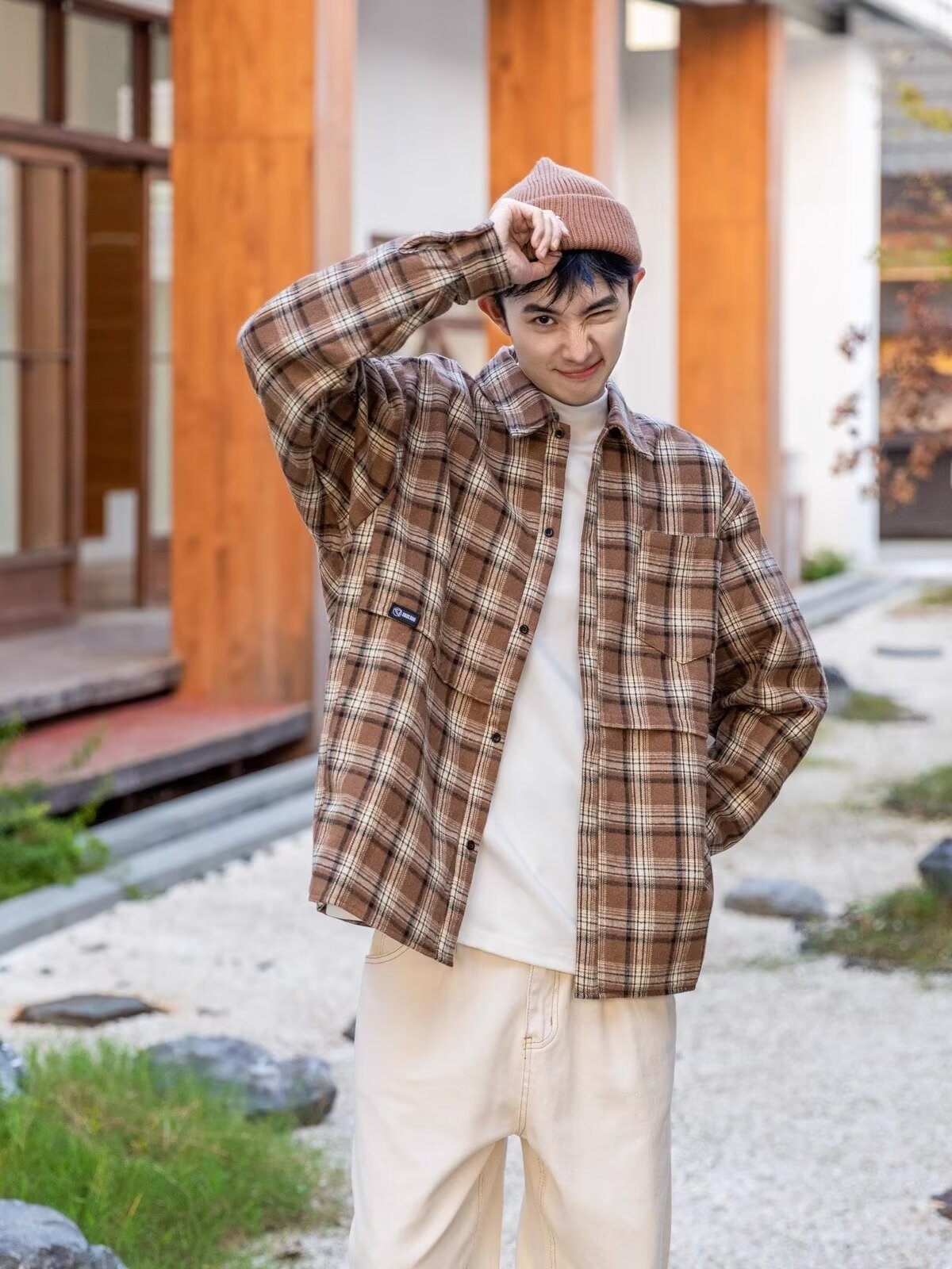 春秋日系复古学院风休闲加绒衬衫男生美拉德穿搭冬季加厚格子衬衣