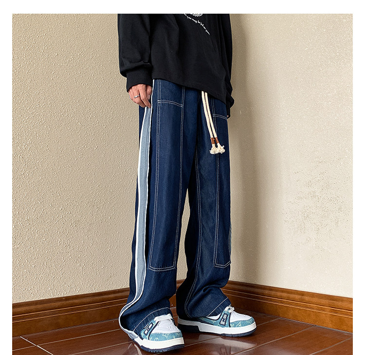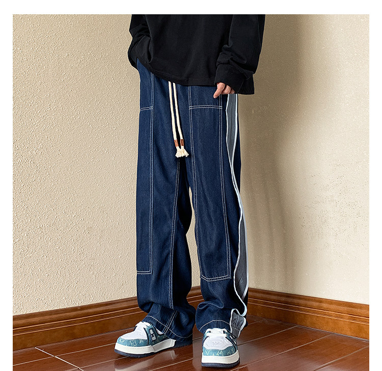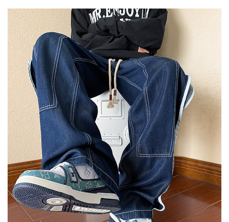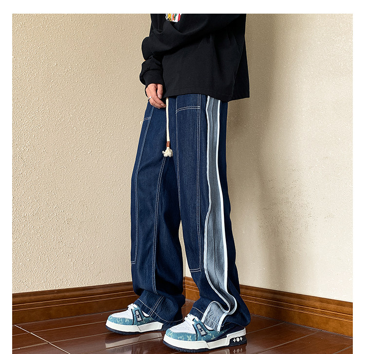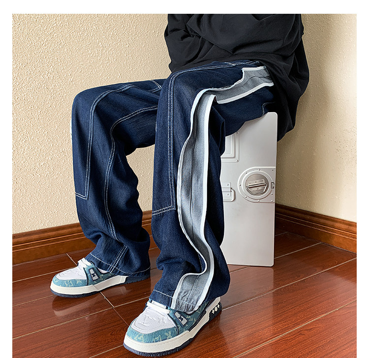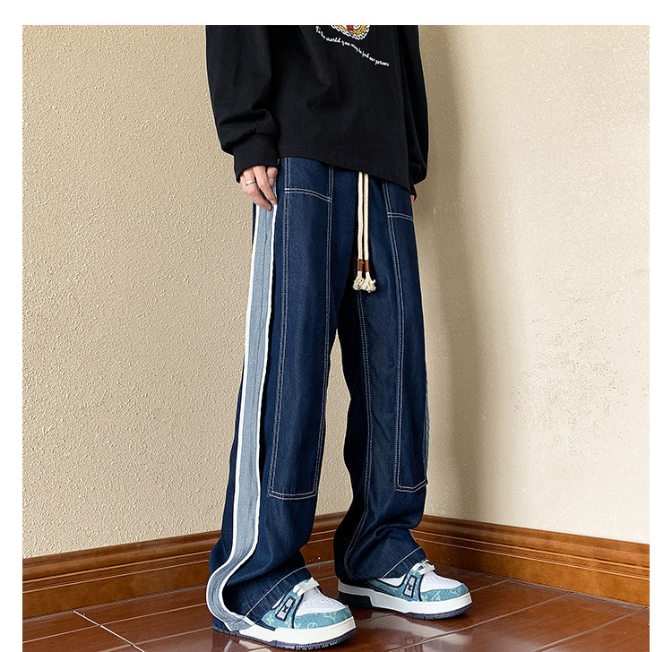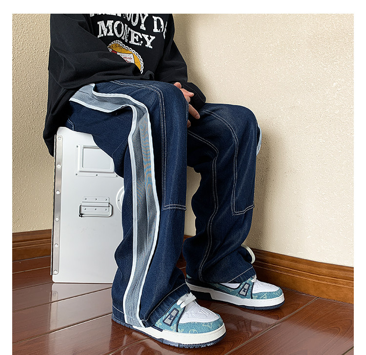 水洗牛仔裤男秋冬款美式高街设计感小众拼接水洗宽松直筒阔腿裤子