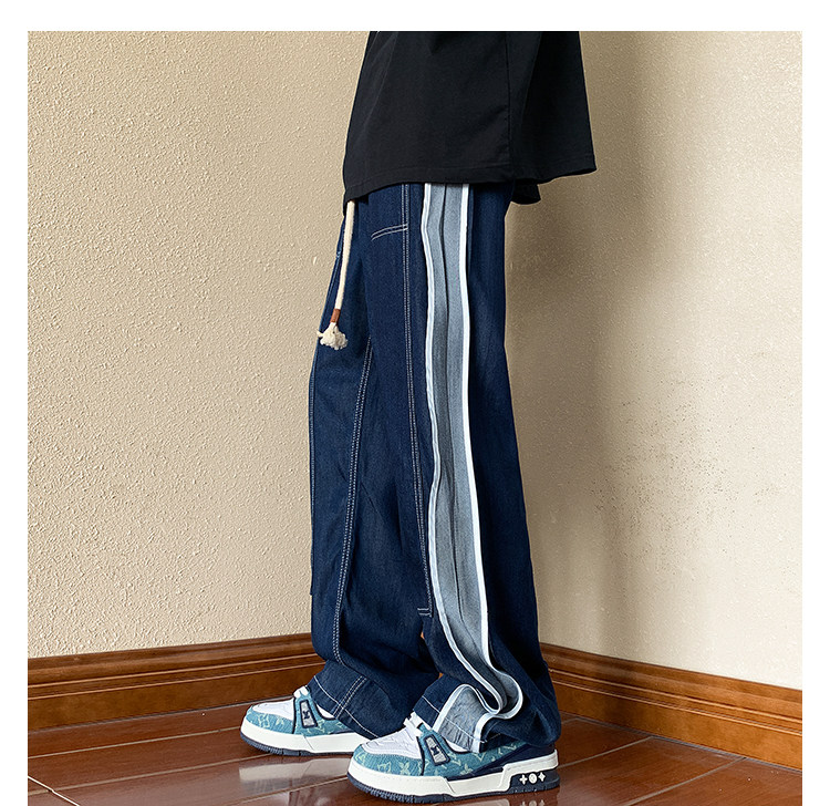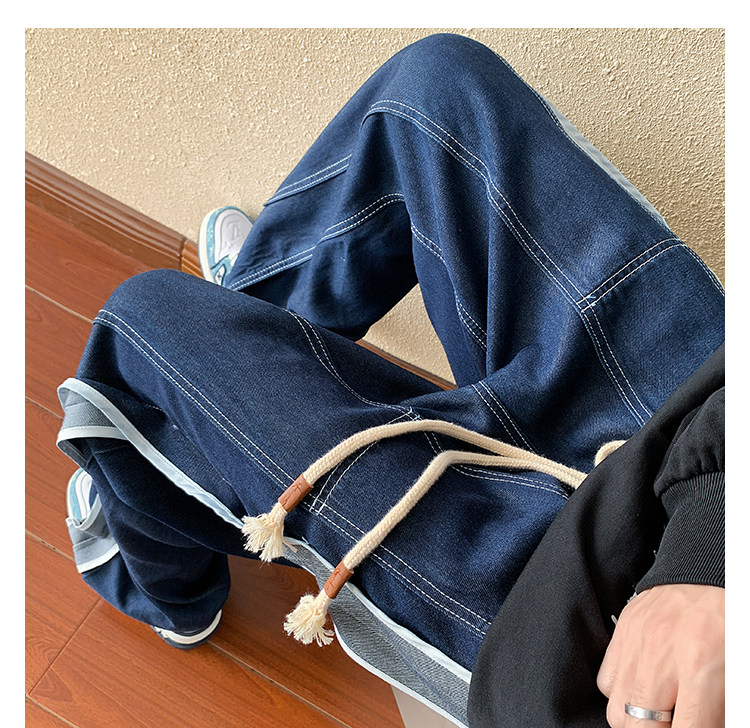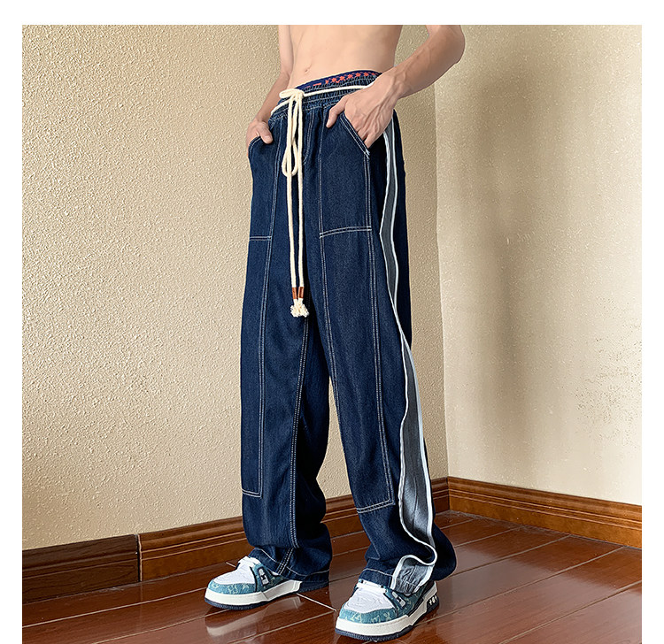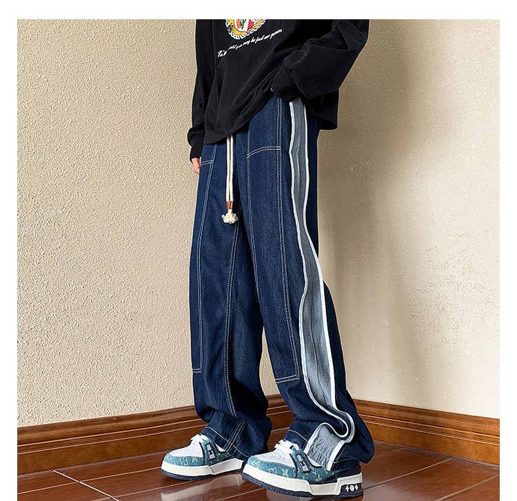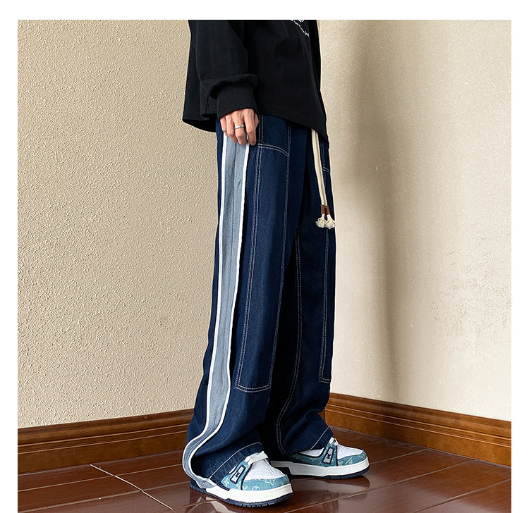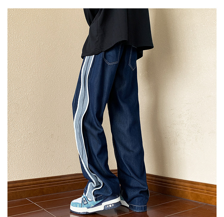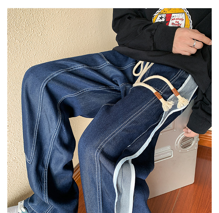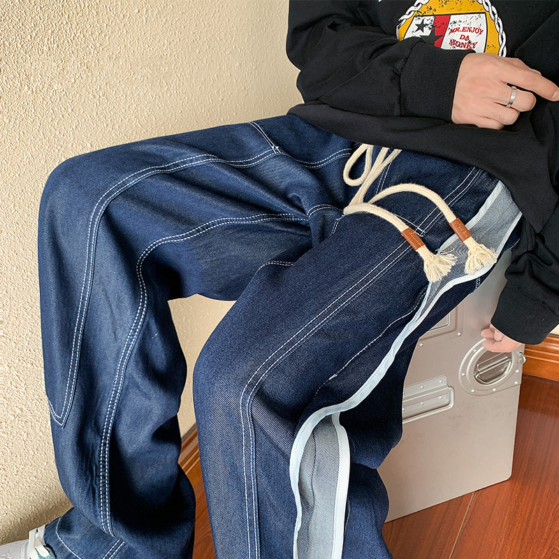 水洗牛仔裤男秋冬款美式高街设计感小众拼接水洗宽松直筒阔腿裤子