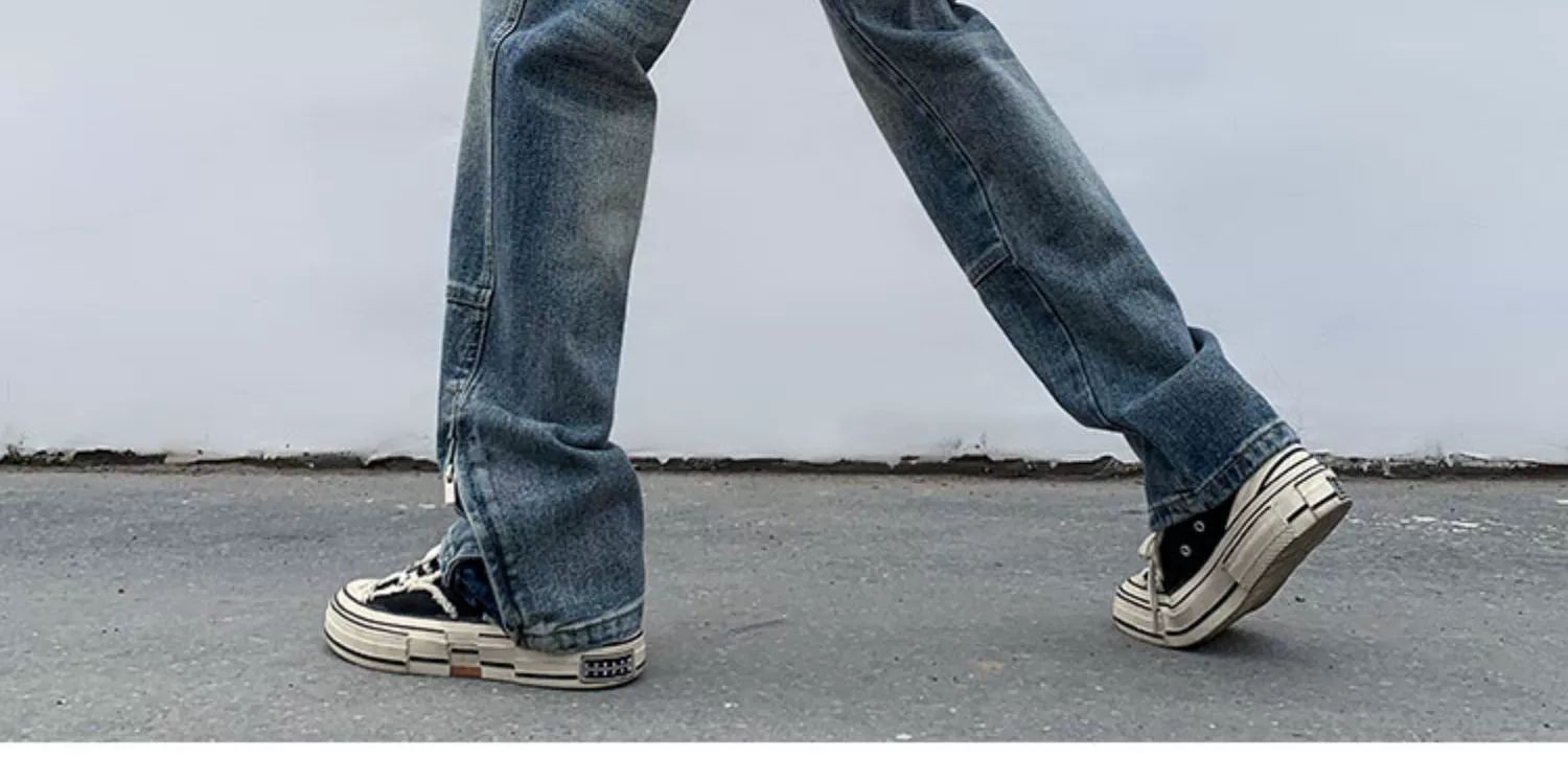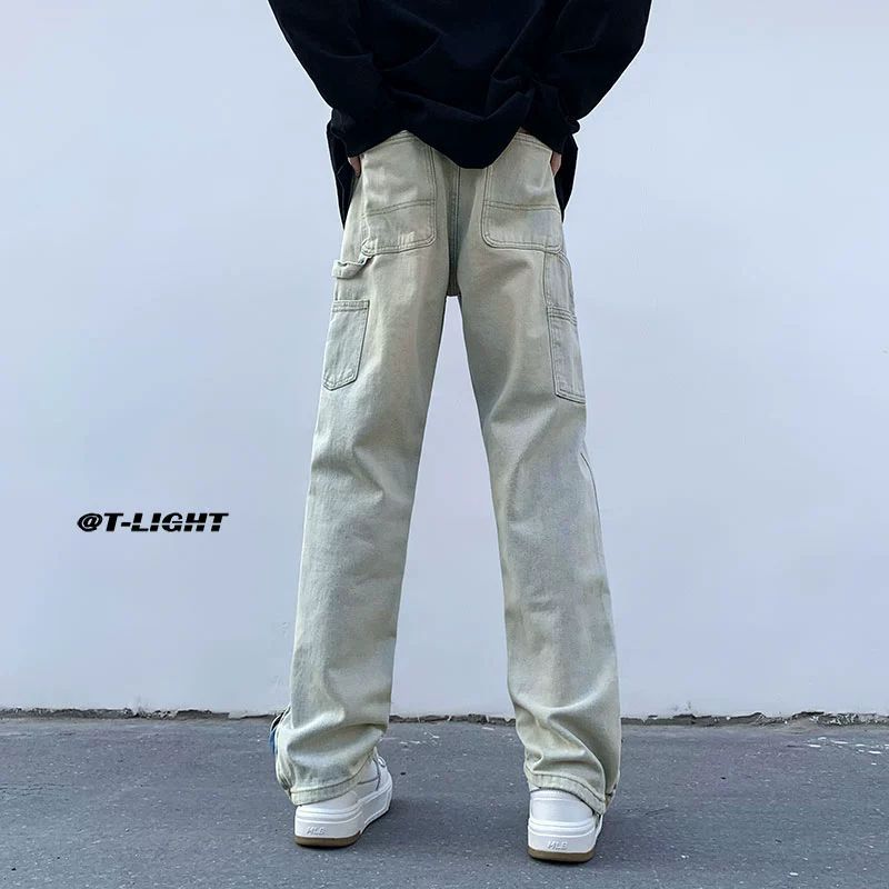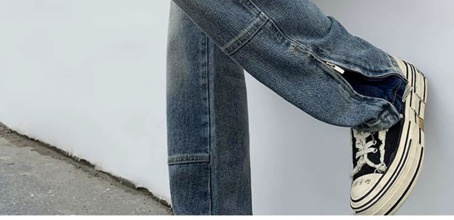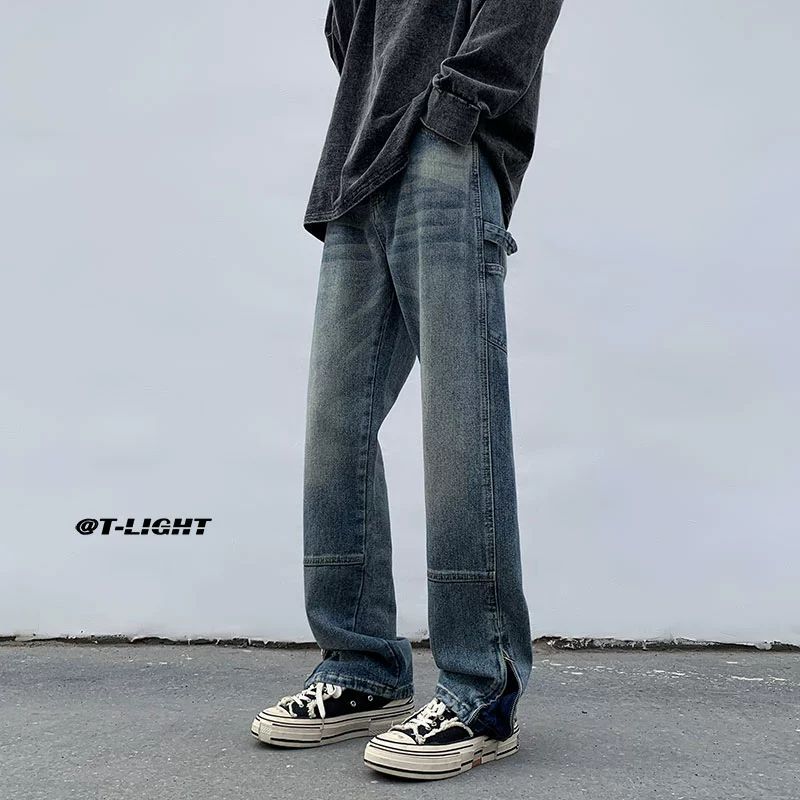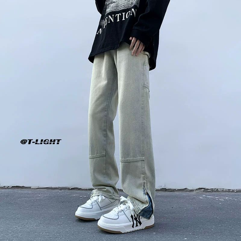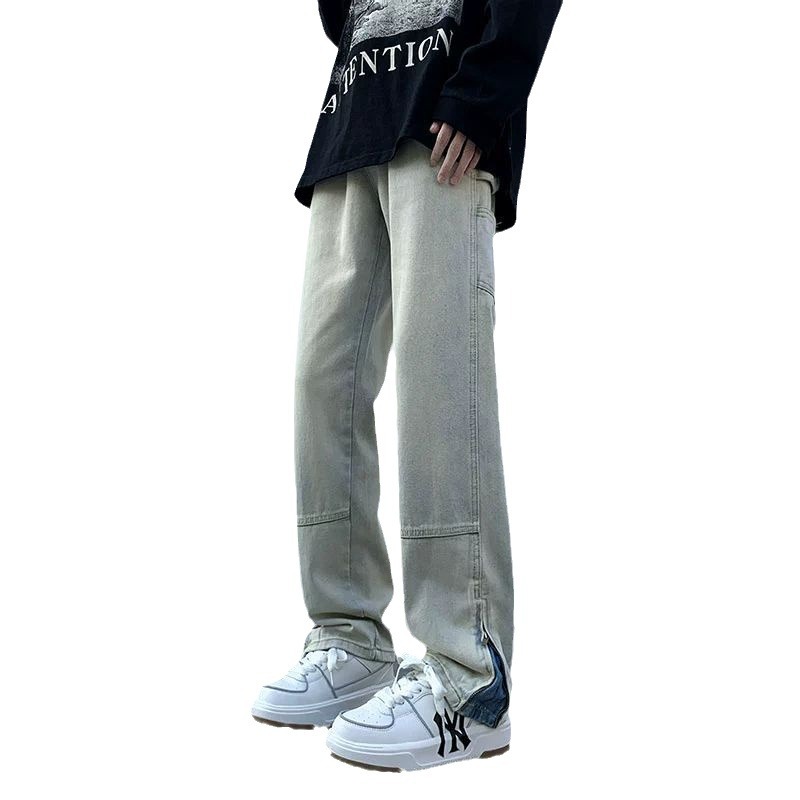 黄泥染牛仔裤男春夏拉链开叉高街潮牌宽松直筒裤潮流ins复古长裤