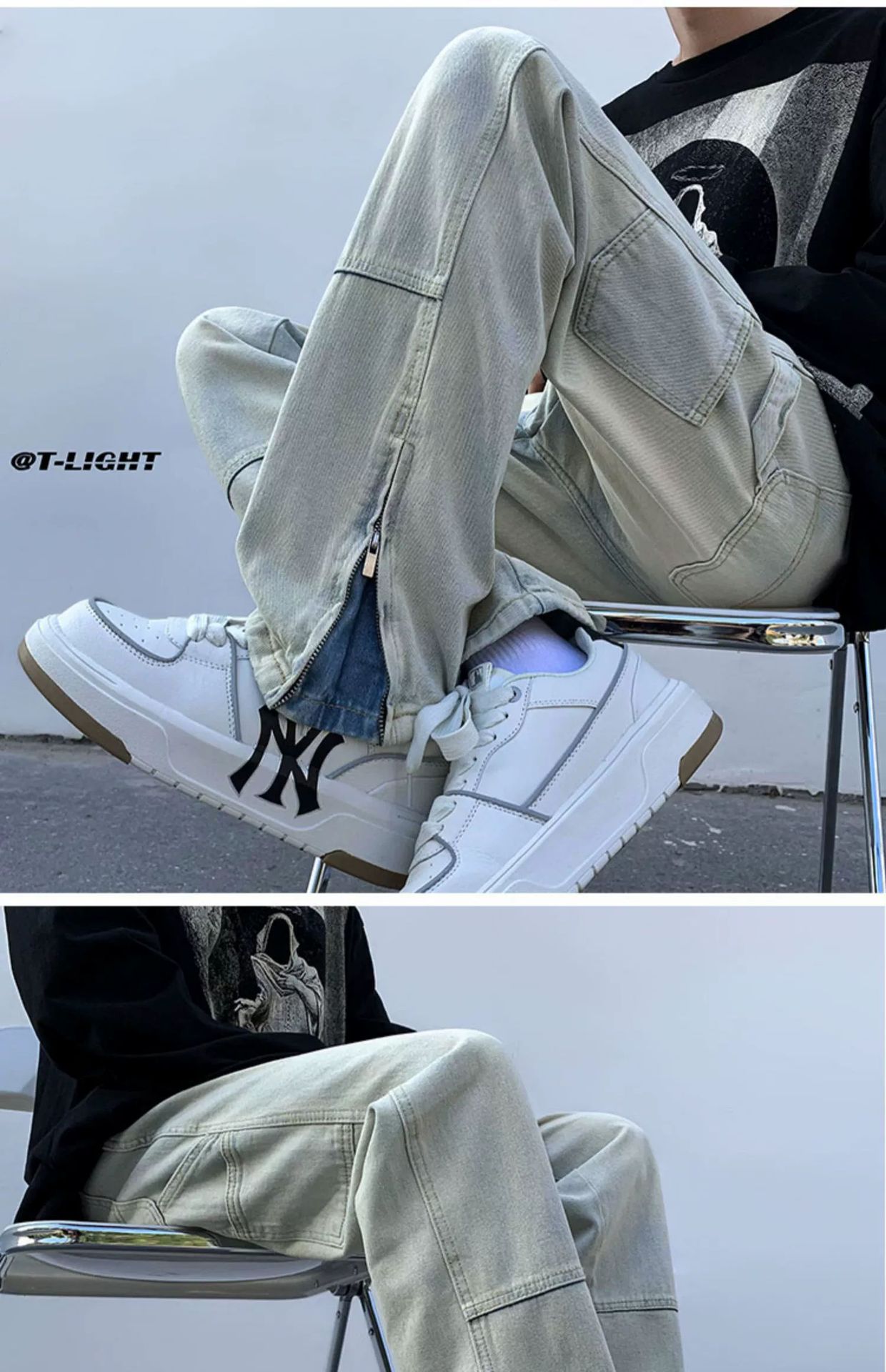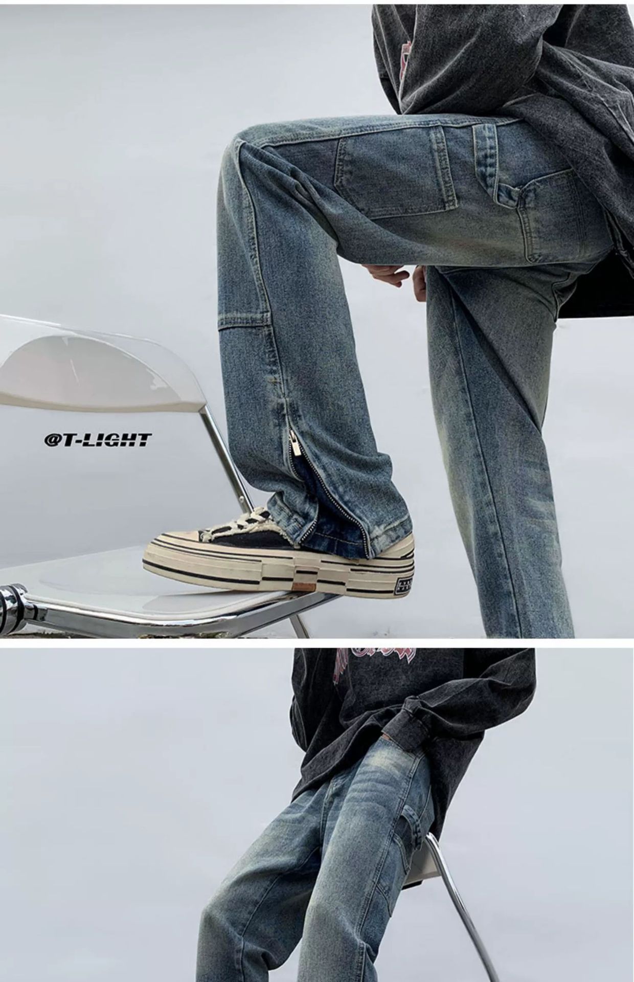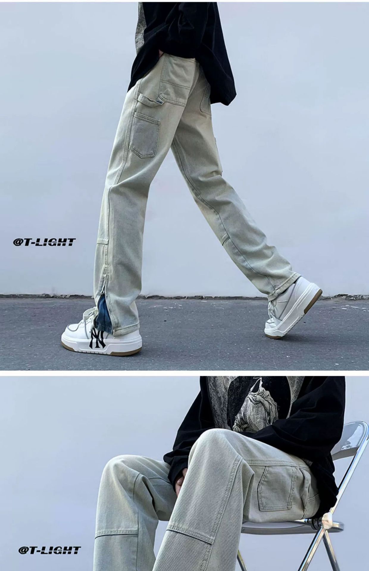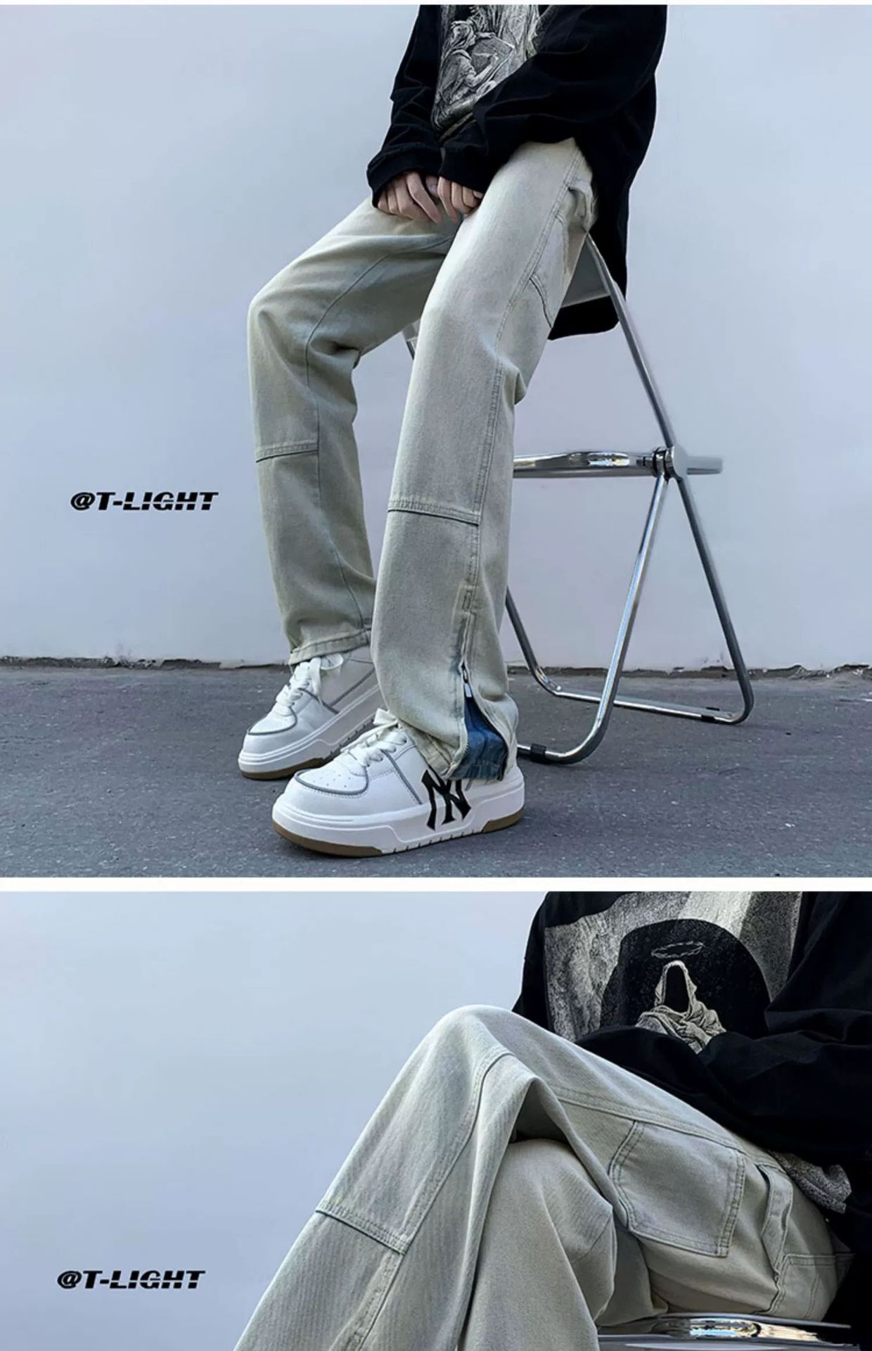 黄泥染牛仔裤男春夏拉链开叉高街潮牌宽松直筒裤潮流ins复古长裤