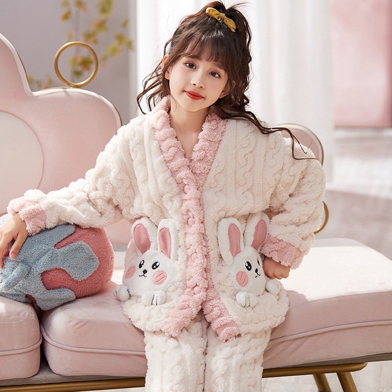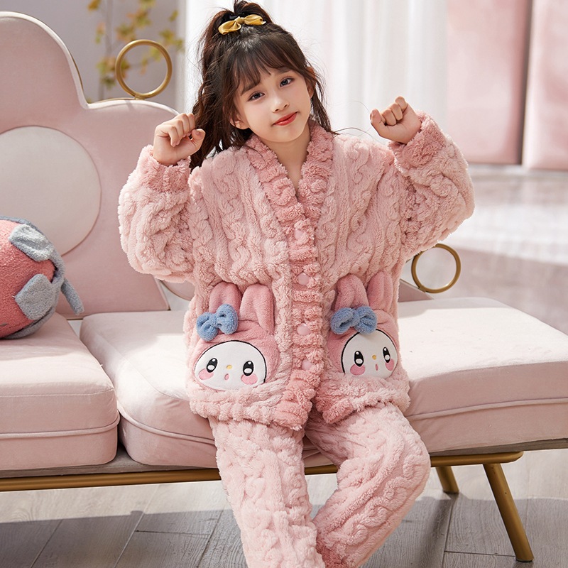 儿童睡衣秋冬绒女童家居服加厚加绒公主风女孩甜美法兰绒和服套装