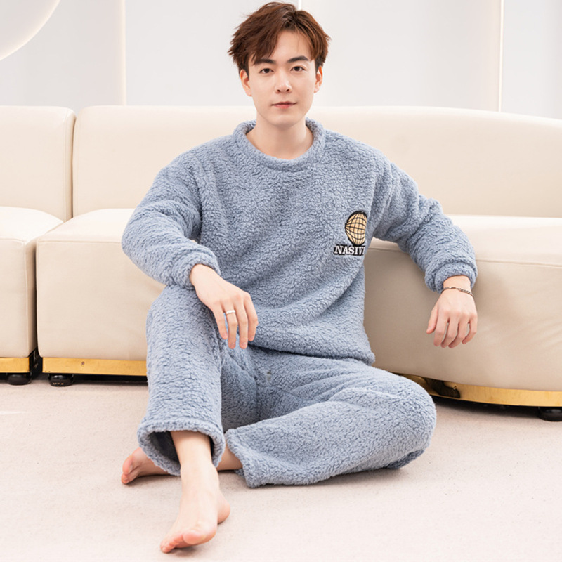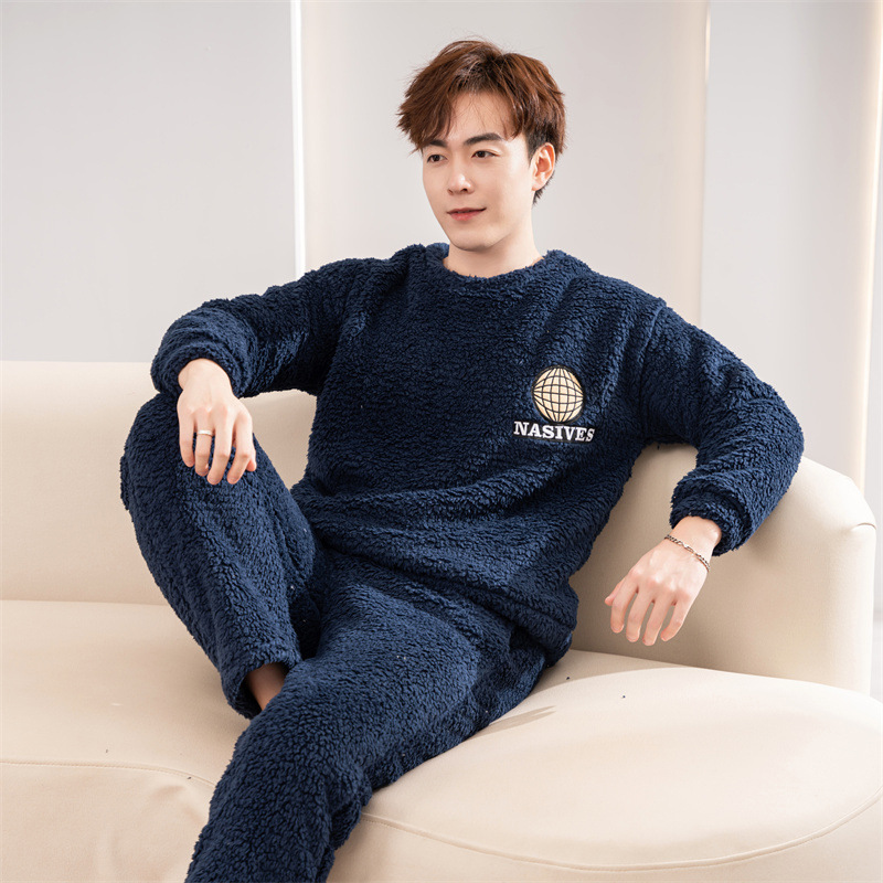 秋冬款男士睡衣加厚加绒北羔绒软绵绵双长两件套装可外穿家居服