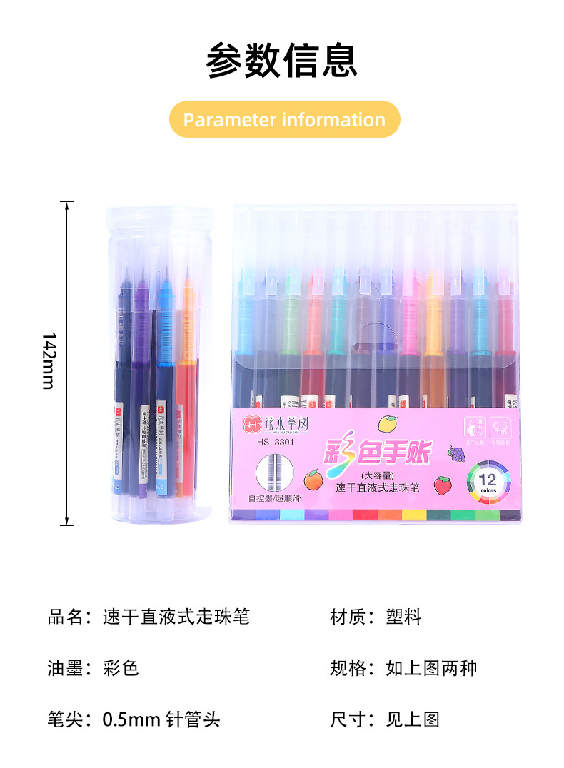 彩色直液式速干走珠笔12色学生办公通用标记涂鸦针管头速干中性笔