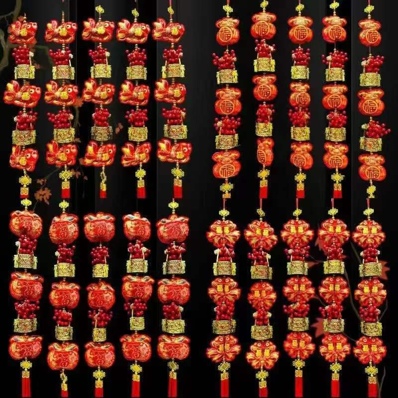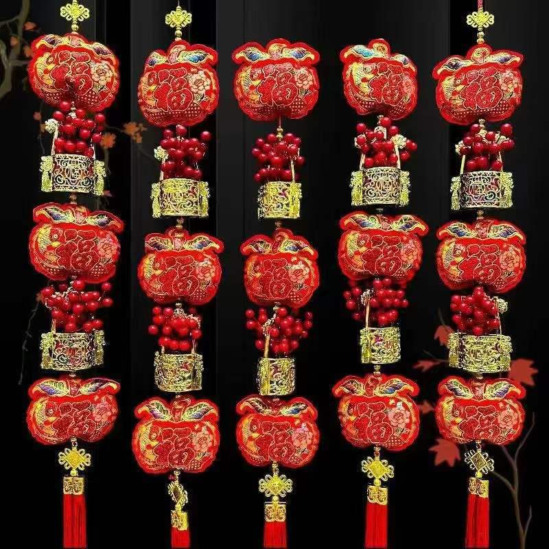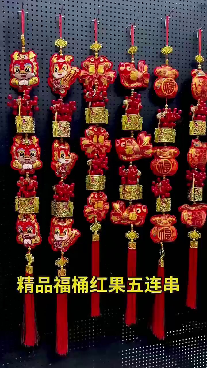 精品福桶红果五连串挂件,清装一件120串起批(四款可混装)整件拿货,总长度110-125cm左右,款式可混装:双鱼,弯鱼,苹果,福袋,四个款式,双面镀金福桶双面公仔印花双面彩色撒粉,四到五支七头大号红果➕高端大气上档次……